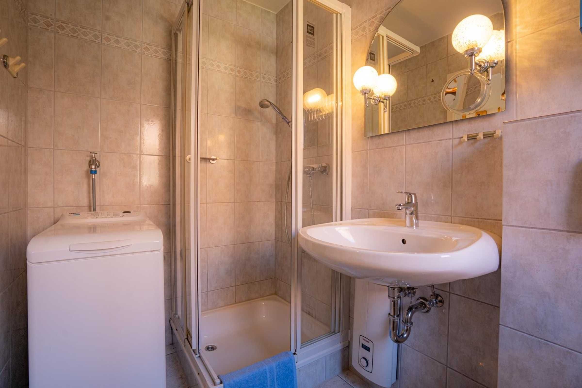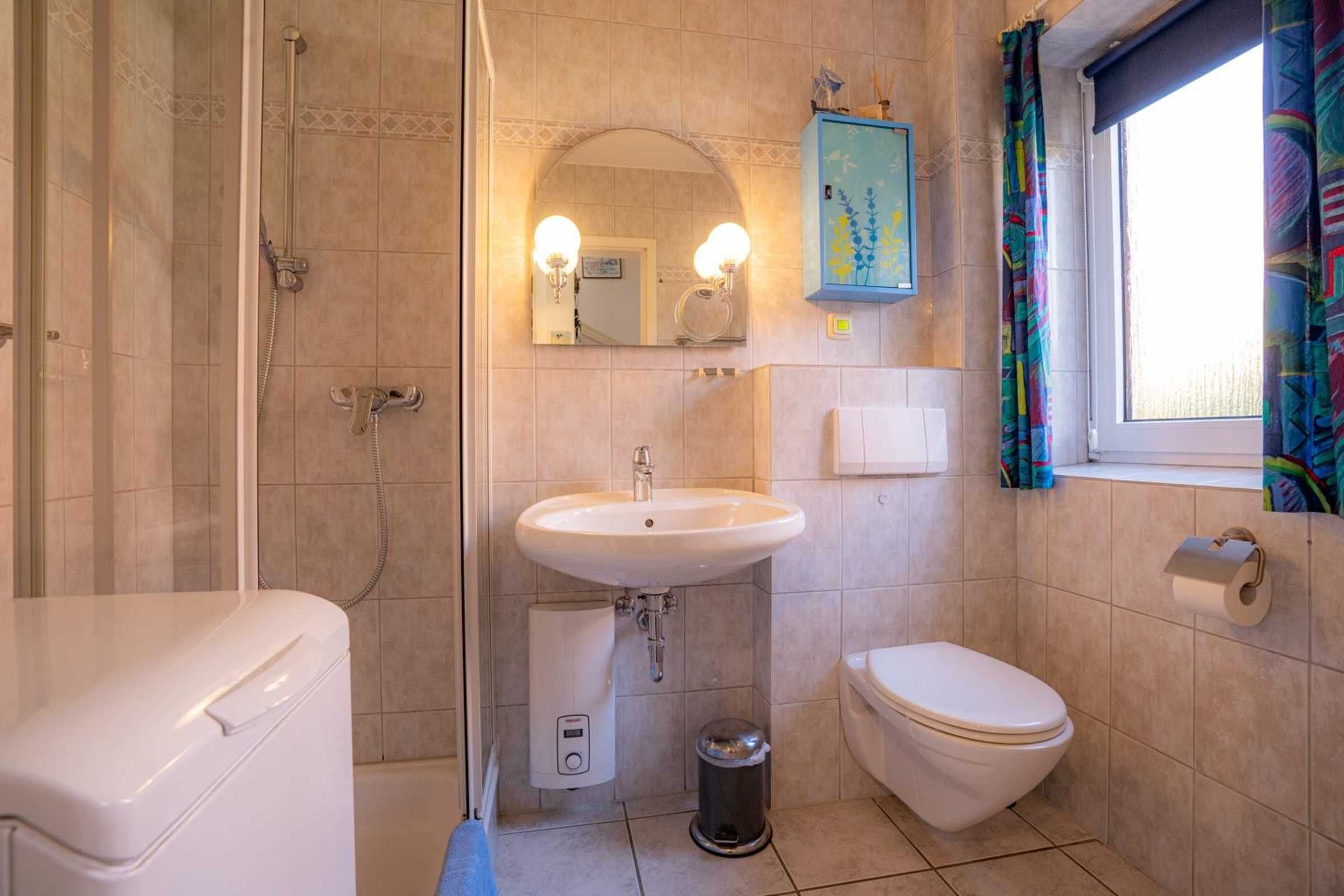 Badezimmer (Duschbad) mit Dusche, WC, Waschmaschine und Tageslicht.