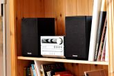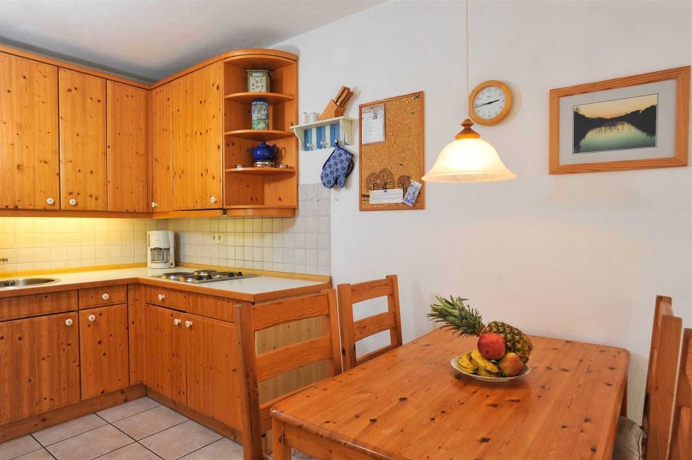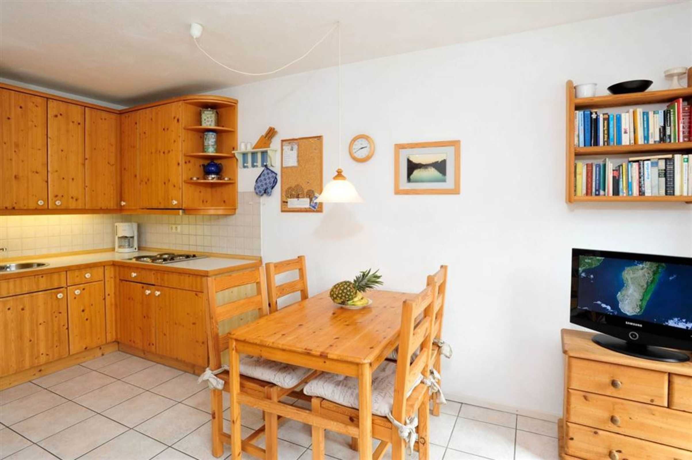 Wohnzimmer mit 2 Sofas (2er und 3er), Sessel, TV (Kabel), Radio, CD-Player und Esstisch für 4 Personen. Möblierte Südterrasse und kleiner Garten vom Wohnzimmer aus begehbar. Offene Küche mit Kühlschrank, Mikrowelle und Herd.