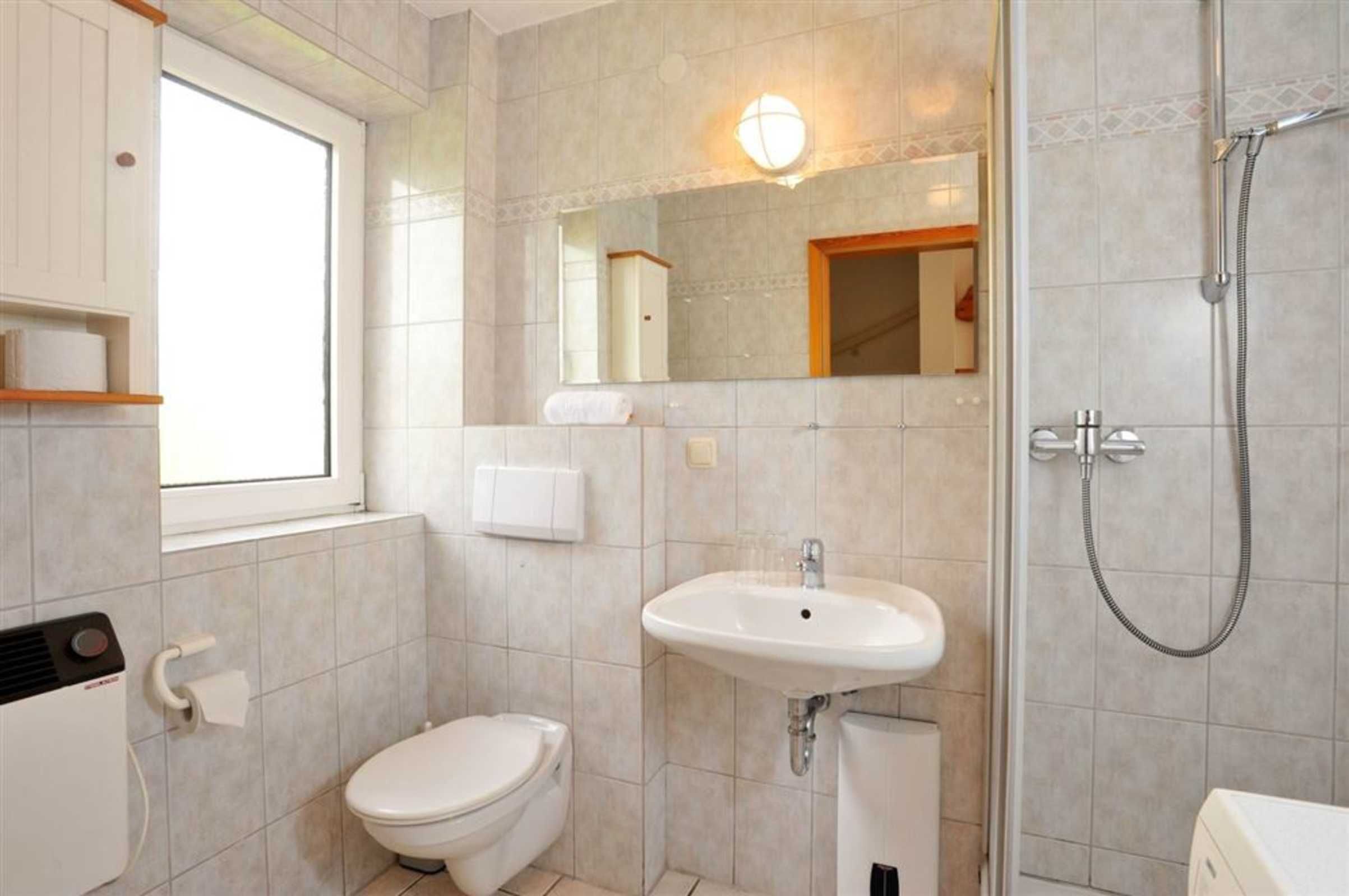 Badezimmer mit Dusche, WC, Waschmaschine und Tageslicht.