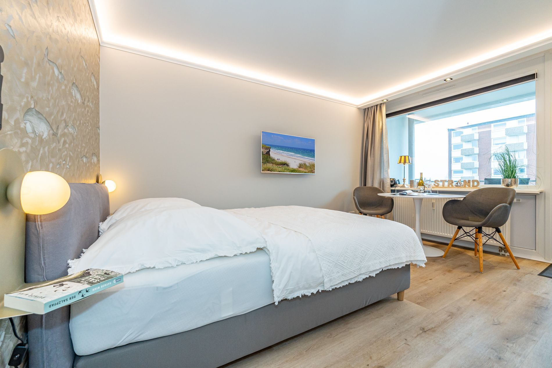 Top ausgestattete 1-Zimmer-Nichtraucher-Ferienwohnung (ca. 28 m²) in der 4. Etage zur Landseite mit Ostloggia (mit Balkonmöbeln und Auflagen) für 2 Personen.