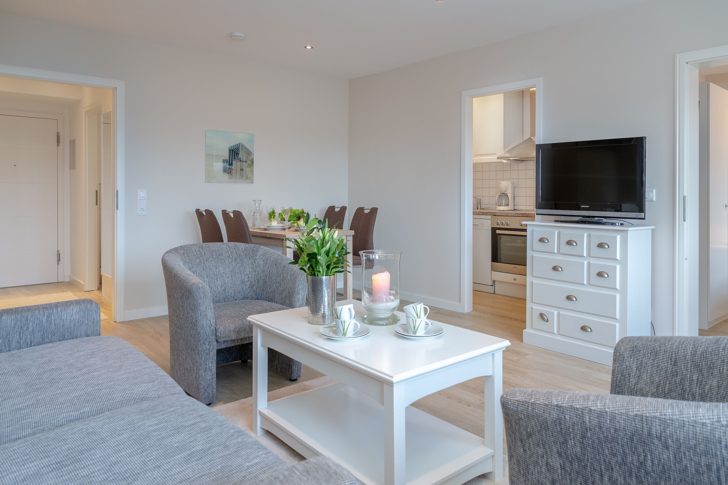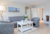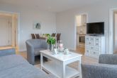 Wohnzimmer mit Doppel-Schlafcouch, 2 Sesseln, Kabel-Flachbild-TV und Radio mit Austritt zum Westbalkon.