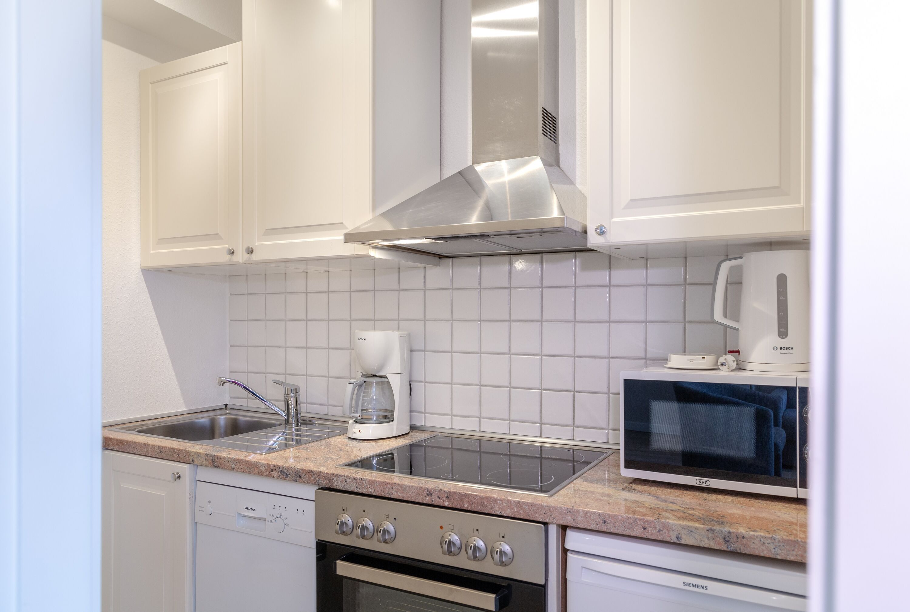 Die Küche ist mit Geschirrspüler, Mikrowelle, Cerankochfeld, Backofen und Dunstabzugshaube ausgestattet.