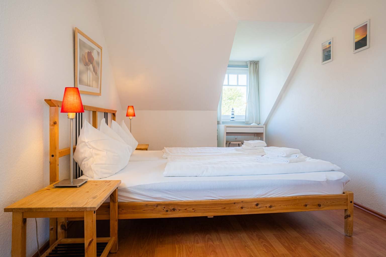 1. Schlafzimmer mit Doppelbett (2x 90x200cm), Kleiderschrank und kleinem Arbeitsplatz.
