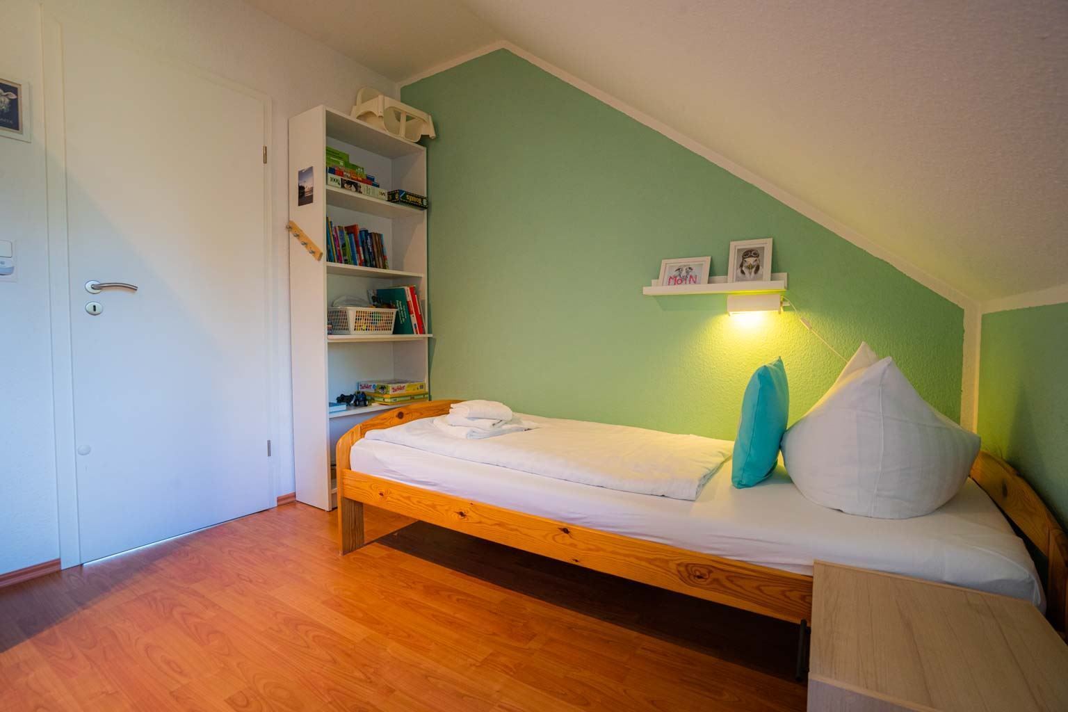 2. Schlafzimmer mit 2 Einzelbetten (je 90x200cm), Kleiderschrank, kleinem Arbeitsplatz sowie Regal mit Spielsachen und Kinderbüchern.