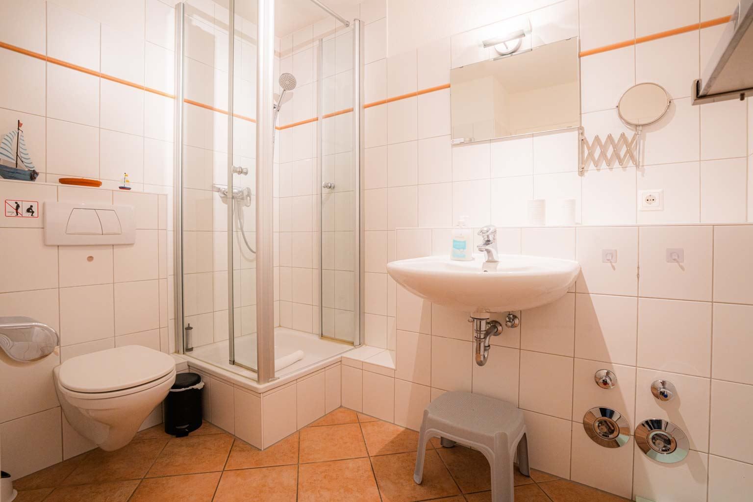 Badezimmer (Duschbad) mit Dusche, WC und Föhn.