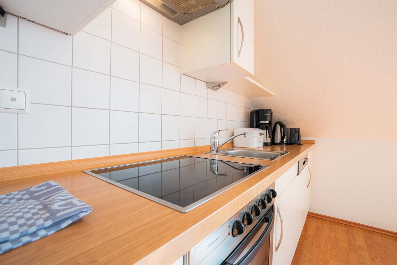 Wohnzimmer mit zwei Sofas, Ledersessel mit Fußhocker, großem TV (Sat), BluRay-Player, Bluetooth-Soundanlage, Esstisch mit 6 Stühlen und direktem Zugang zum großen möblierten Südbalkon mit Meerblick bis zu den Pfahlbauten. Offene Küche mit Backofen, Mikrowelle, Kühl-Gefrier-Kombination und Geschirrspüler.