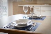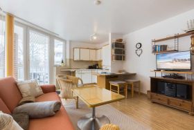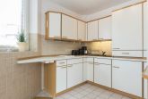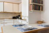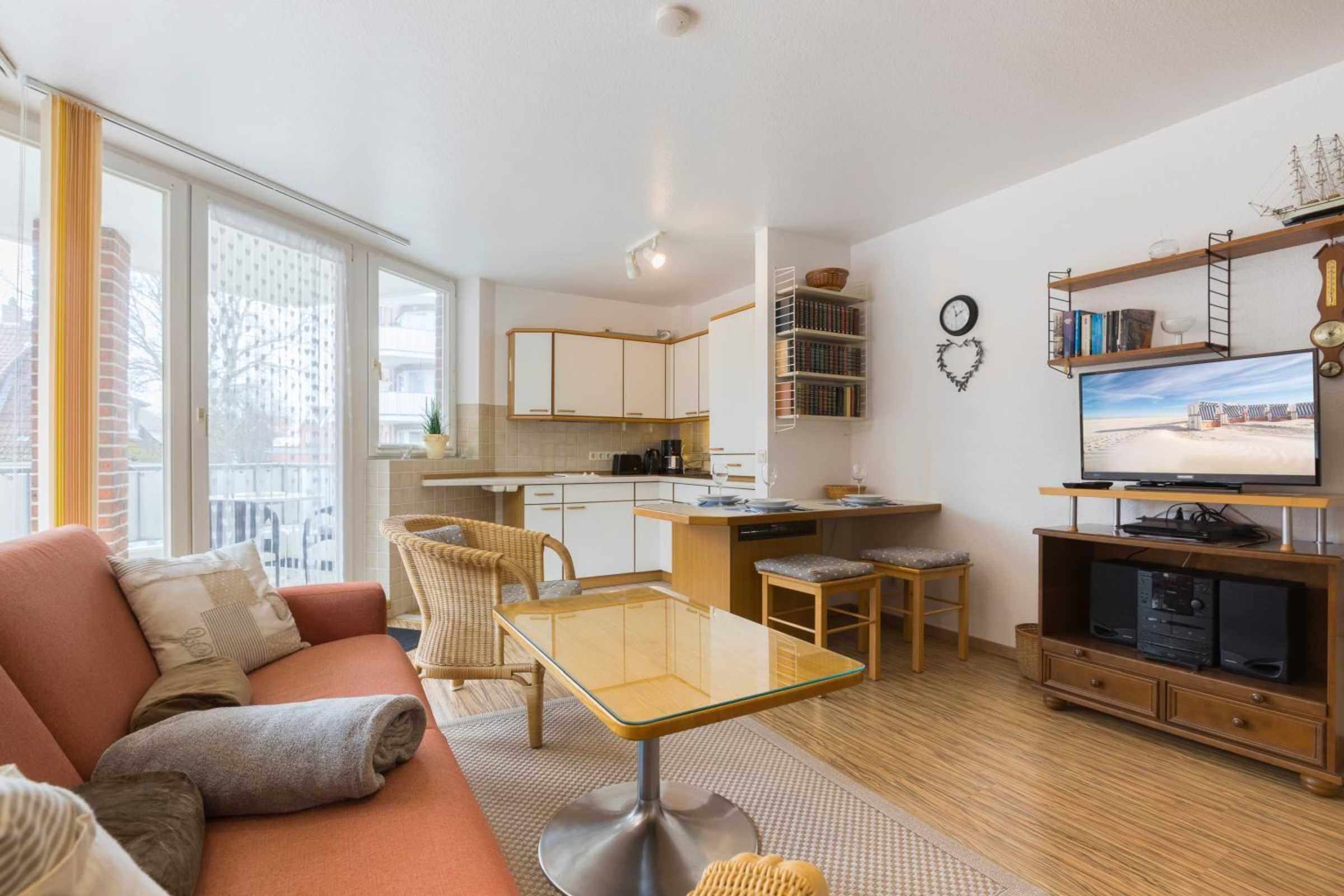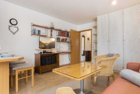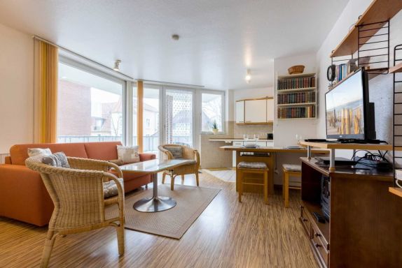 Wohnzimmer mit ausklappbarem (Schlaf-) Sofa (140x200cm), 2 Sesseln, Esstisch für 3-4 Personen, TV (Kabel), DVD-Player und Stereo-Anlage. Direkter Zugang zum möblierten Eck-Balkon nach Westen. Offene Küche mit Mikrowelle mit Backfuntion, Kühlschrank mit Gefrierfach und Geschirrspüler.