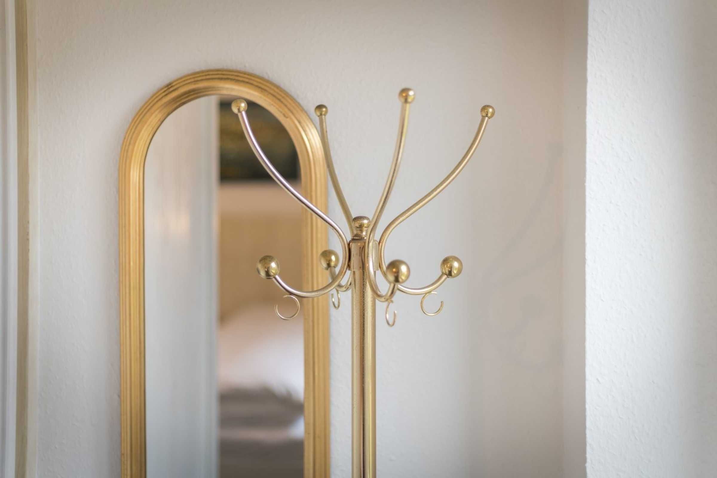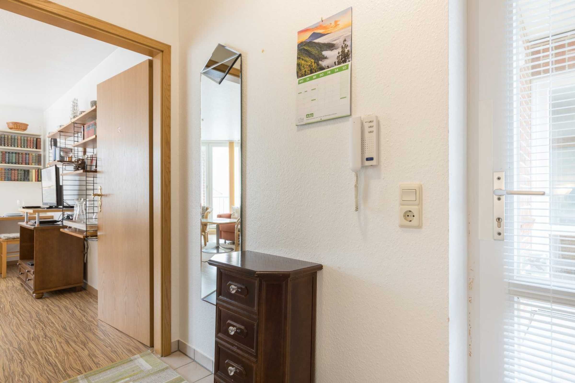 Flur mit Garderobe, Spiegel und Haushaltsschrank mit Staubsauger im Eingangsbereich. Vor dem Wohnungseingang befindet sich ein eigener Laubengang.