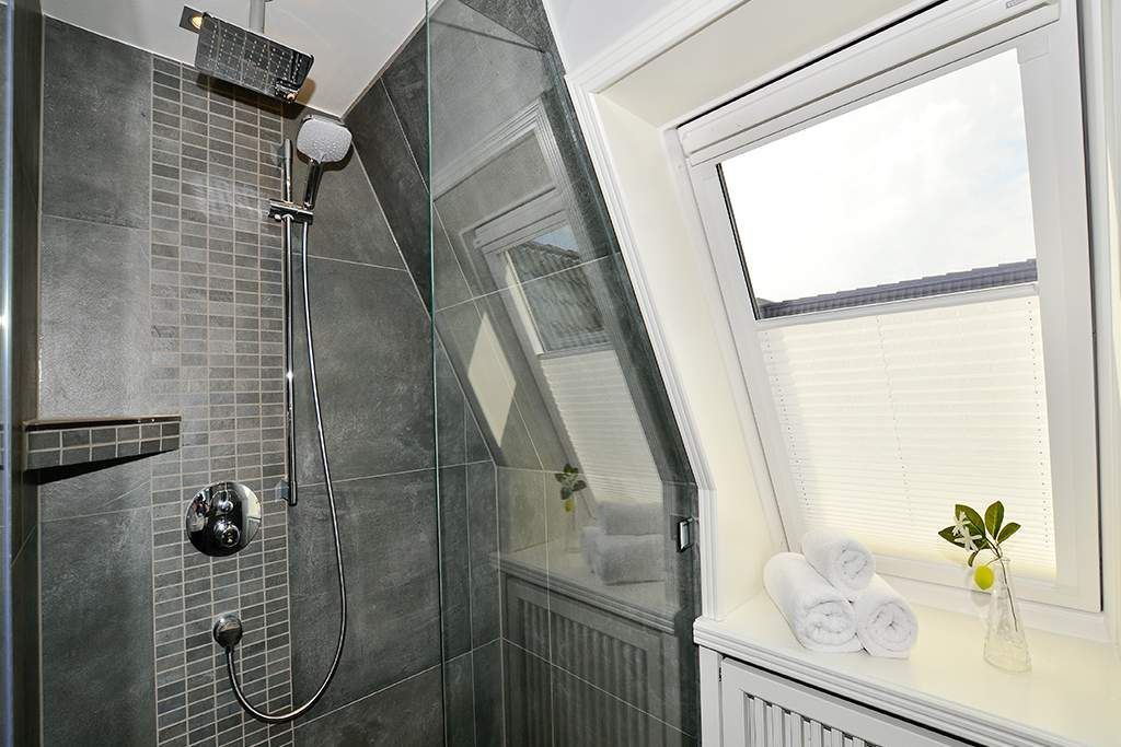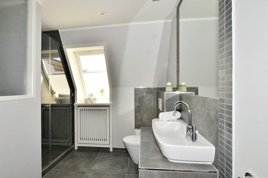 Im neuen Bad befinden sich eine Dusche mit flachem Einstieg, ein Waschtisch, ein WC und ein Handtuchtrockner.