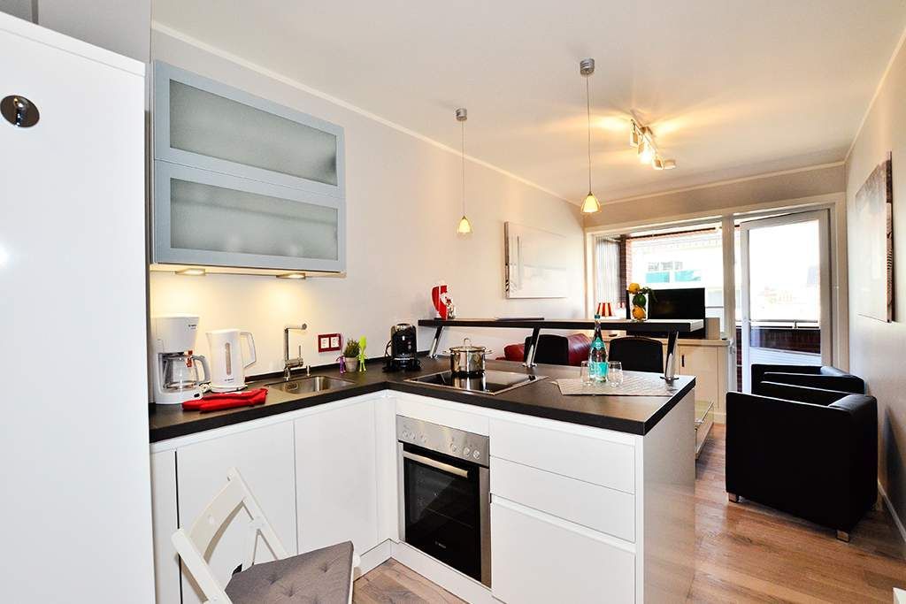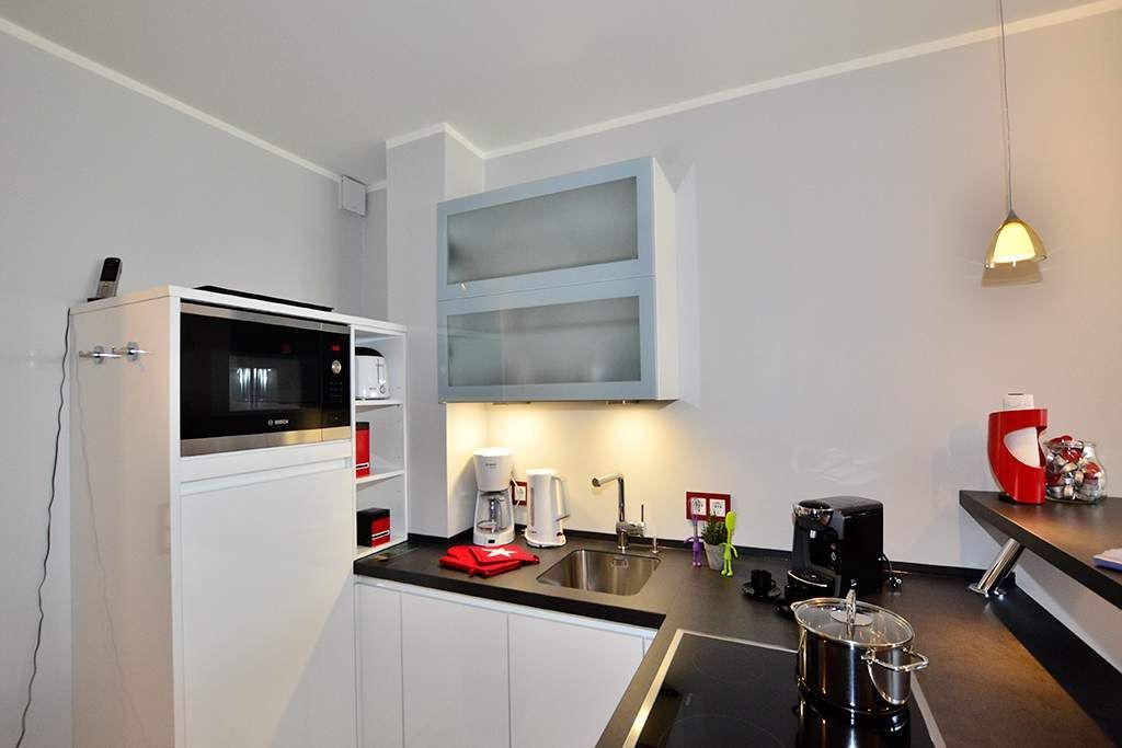 Die neue, moderne Küchenzeile ist ausgestattet mit einem Geschirrspüler, einer Mikrowelle, einem Cerankochfeld, Kühlschrank mit 3-Sterne-Gefrierschrank. Kaffeemaschine, Wasserkocher und Toaster gehören zur Grundausstattung.