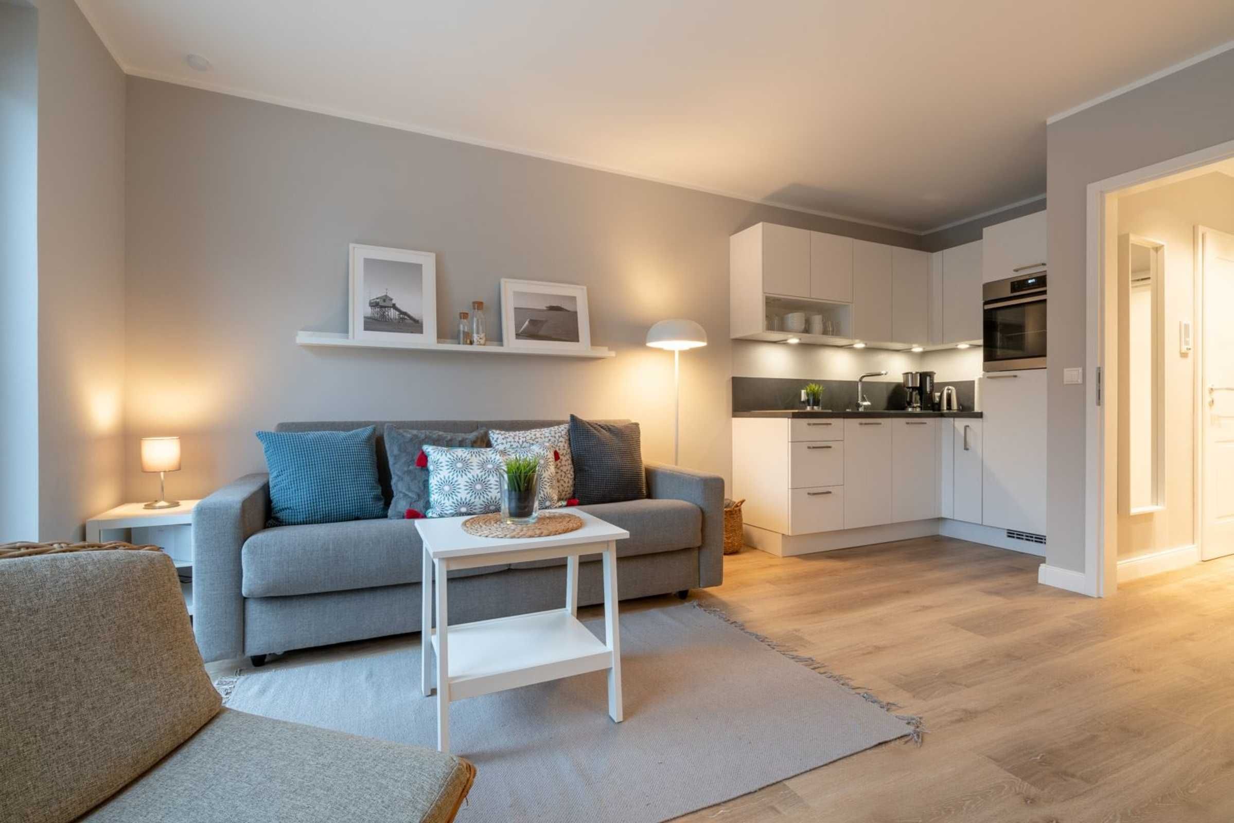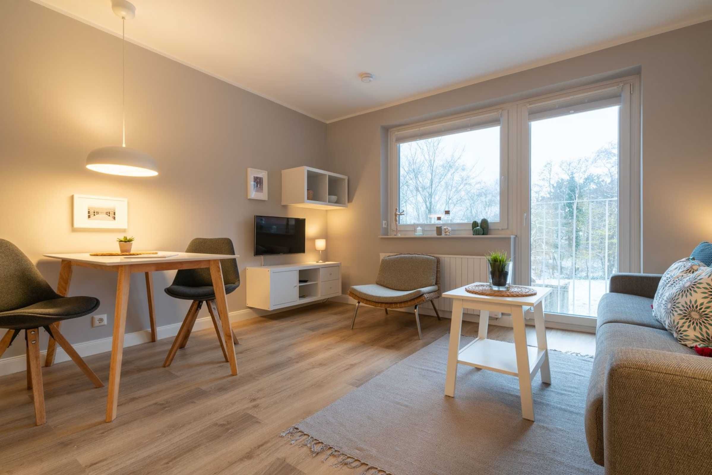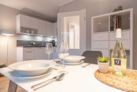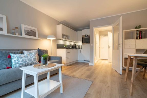 Wohn- und Schlafzimmer mit ausklappbarem Schlafsofa (160x195cm, mit rückenfreundlichem Ergoflex-Lattenrost und Matratze), Sessel, Esstisch für 2 Pesonen, TV (Sat) und CD-Player mit Radio. Französischer Balkon. Offene Küche mit Herd mit 2 Kochstellen, Backofen, Geschirrspüler und Kühlschrank mit Gefrierfach.