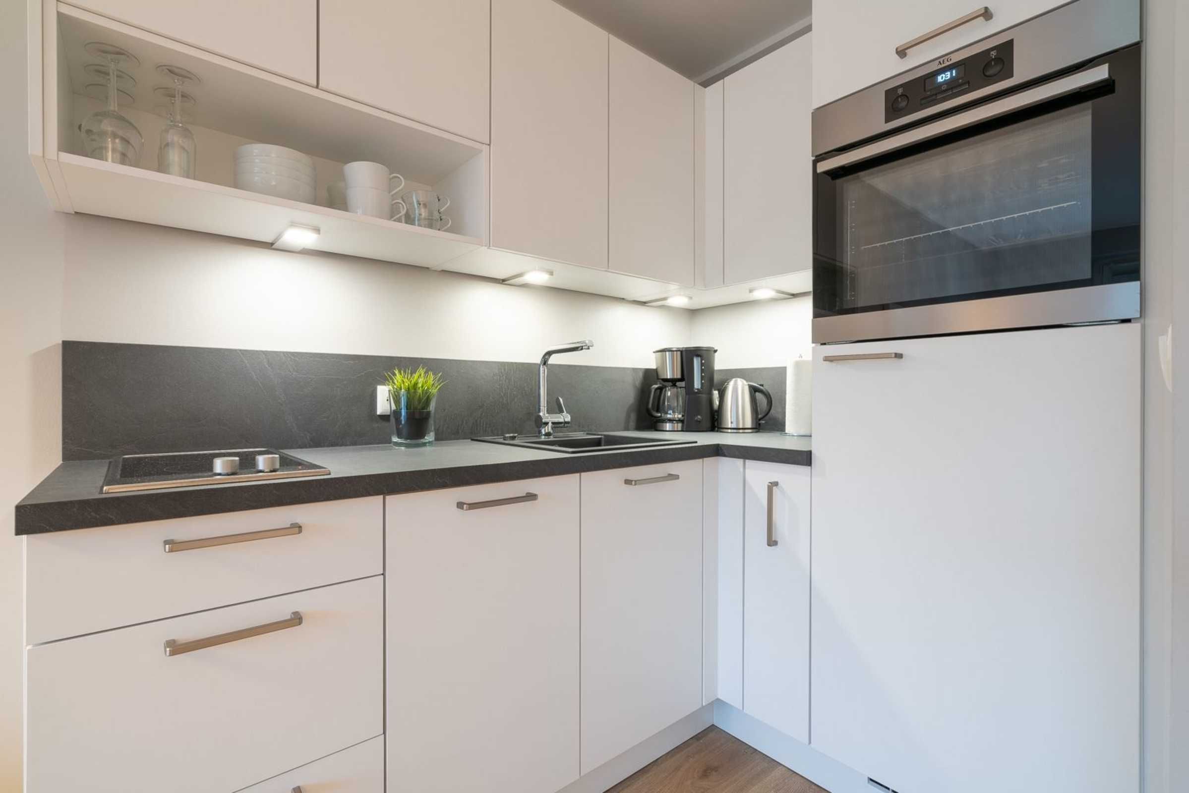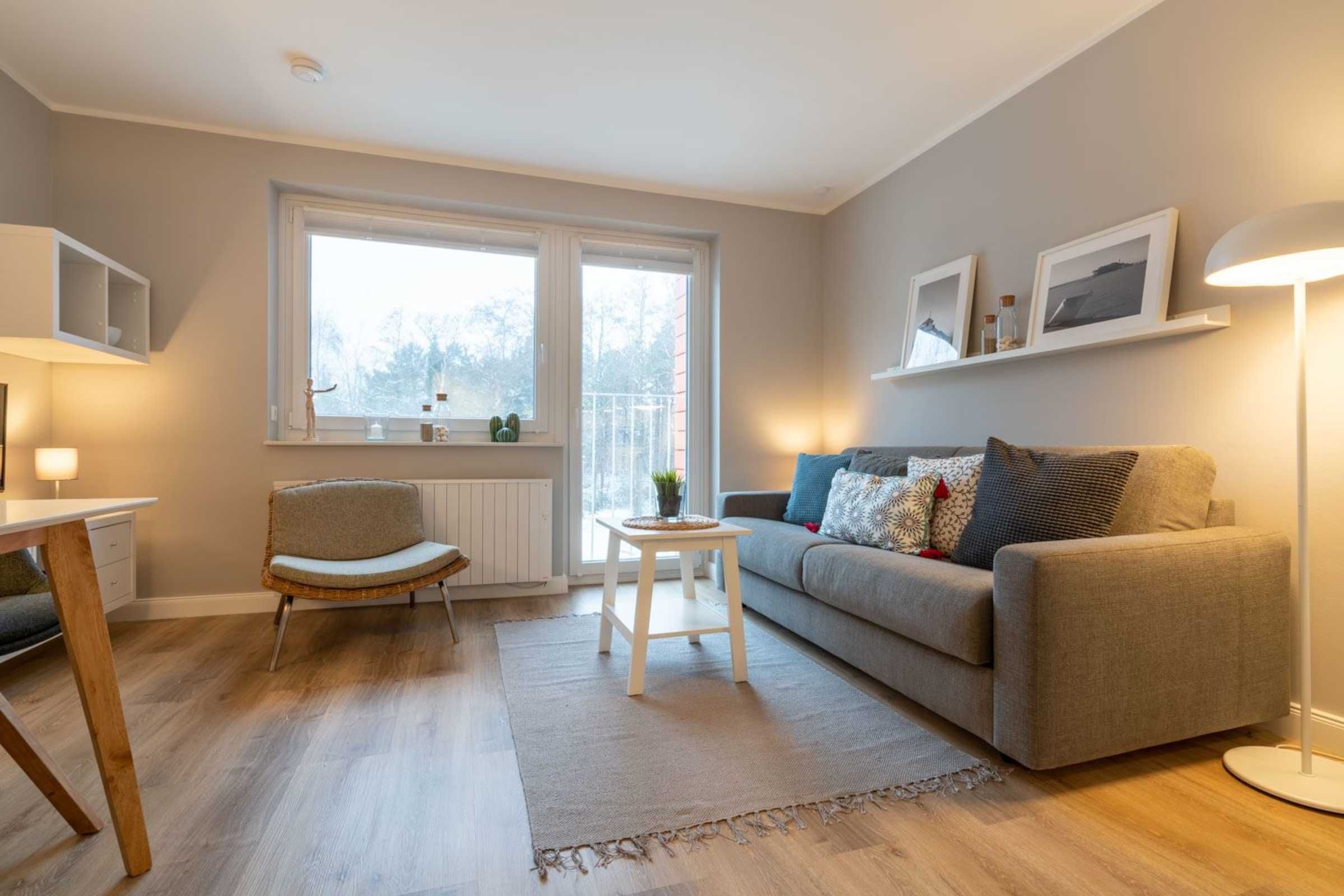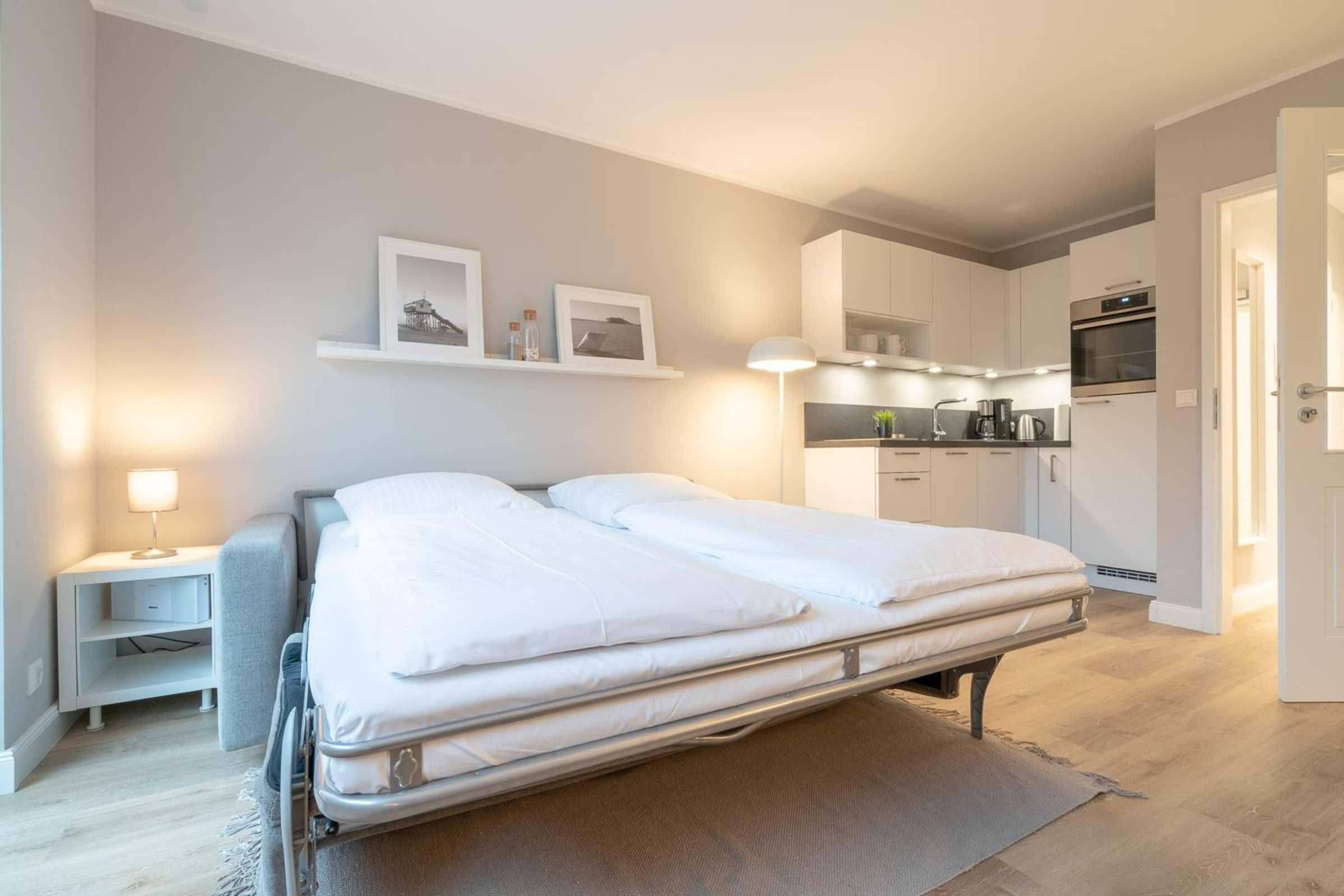 Wohn- und Schlafzimmer mit ausklappbarem Schlafsofa (160x195cm, mit rückenfreundlichem Ergoflex-Lattenrost und Matratze), Sessel, Esstisch für 2 Pesonen, TV (Sat) und CD-Player mit Radio. Französischer Balkon. Offene Küche mit Herd mit 2 Kochstellen, Backofen, Geschirrspüler und Kühlschrank mit Gefrierfach.
