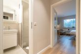Flur mit Spiegel im Eingangsbereich. Separater Abstellraum mit Garderobenschrank, Regalen und Staubsauger. Die Fenster haben Verdunklungsplissees.