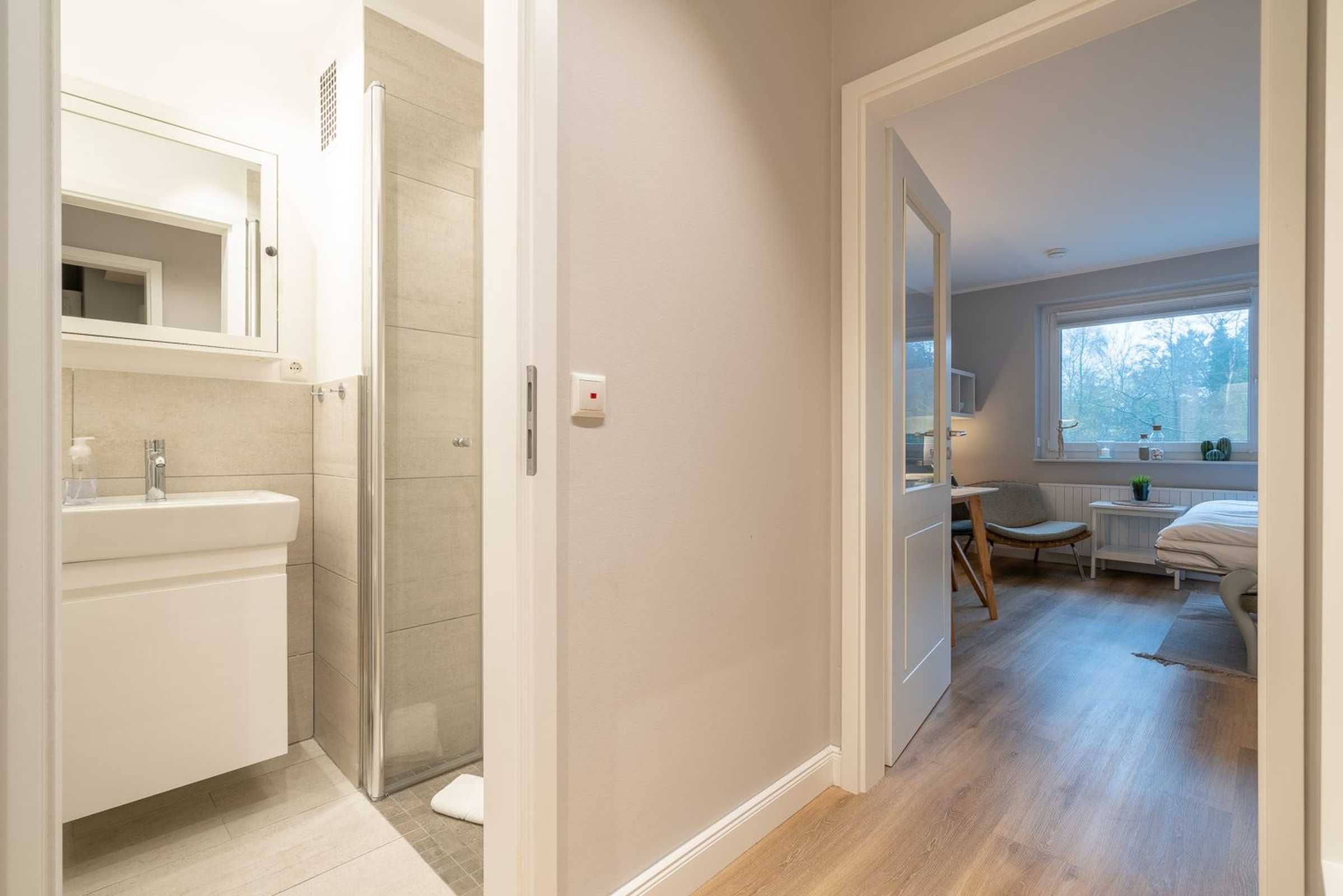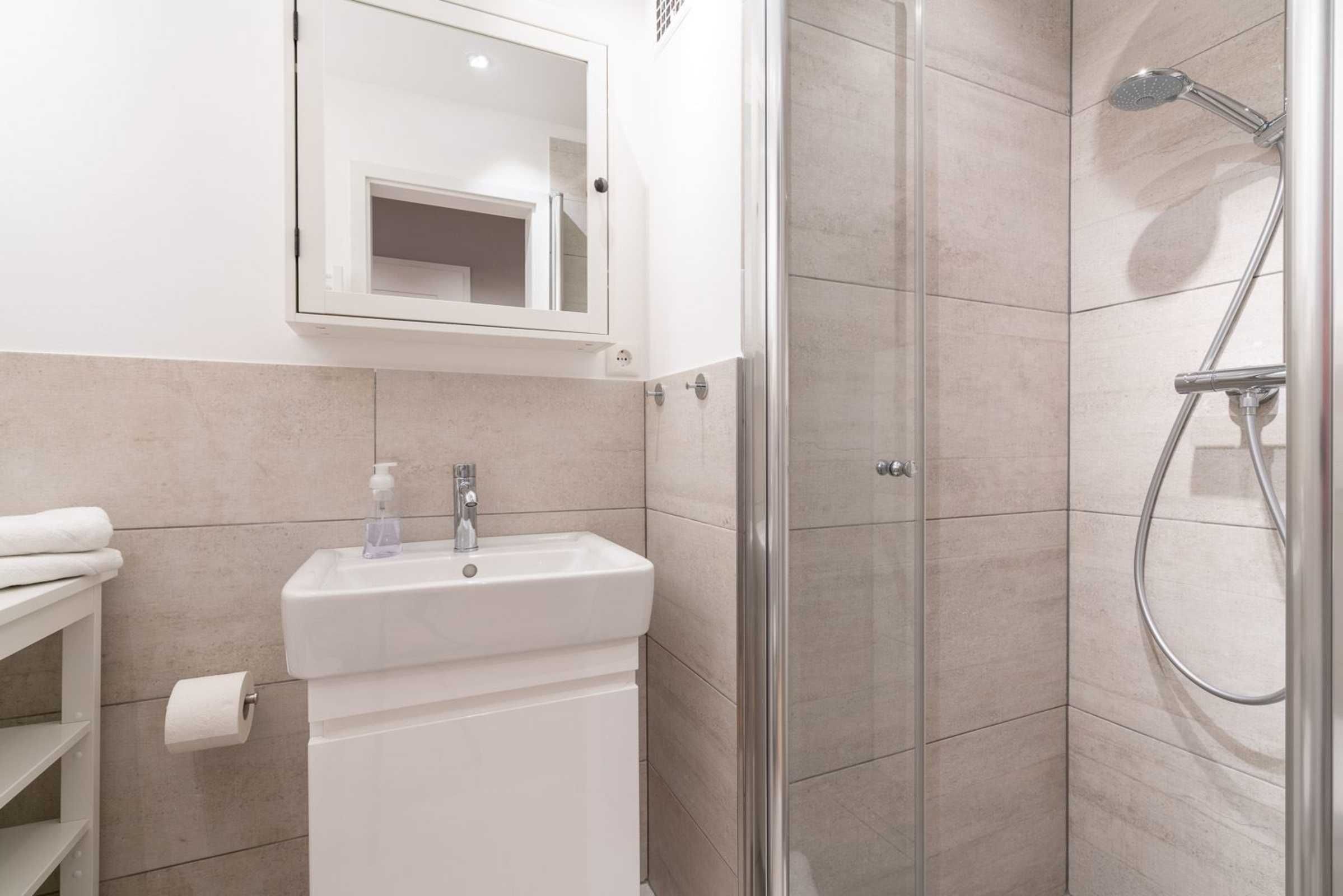 Badezimmer (Duschbad) mit Dusche, WC und Föhn.
