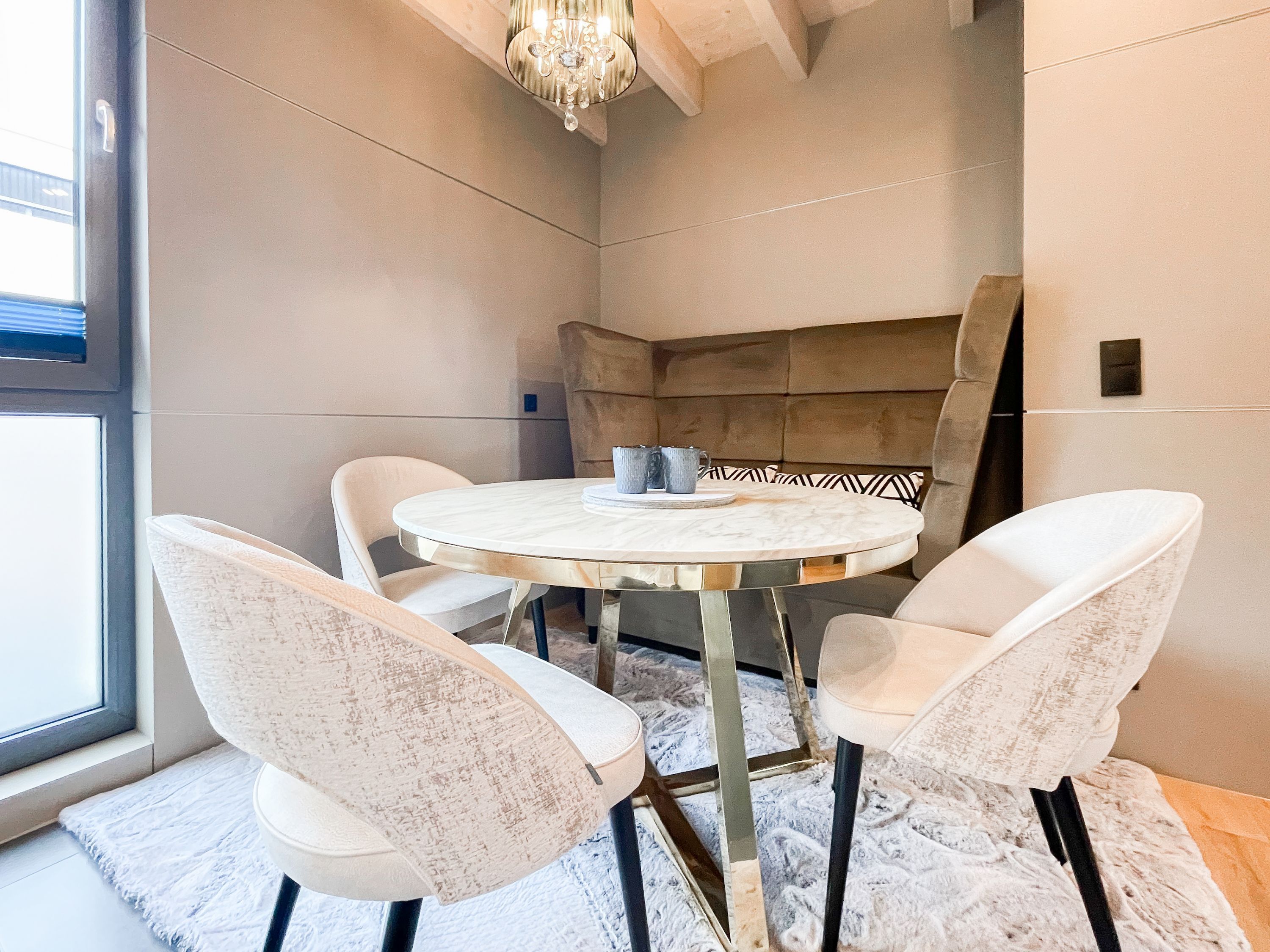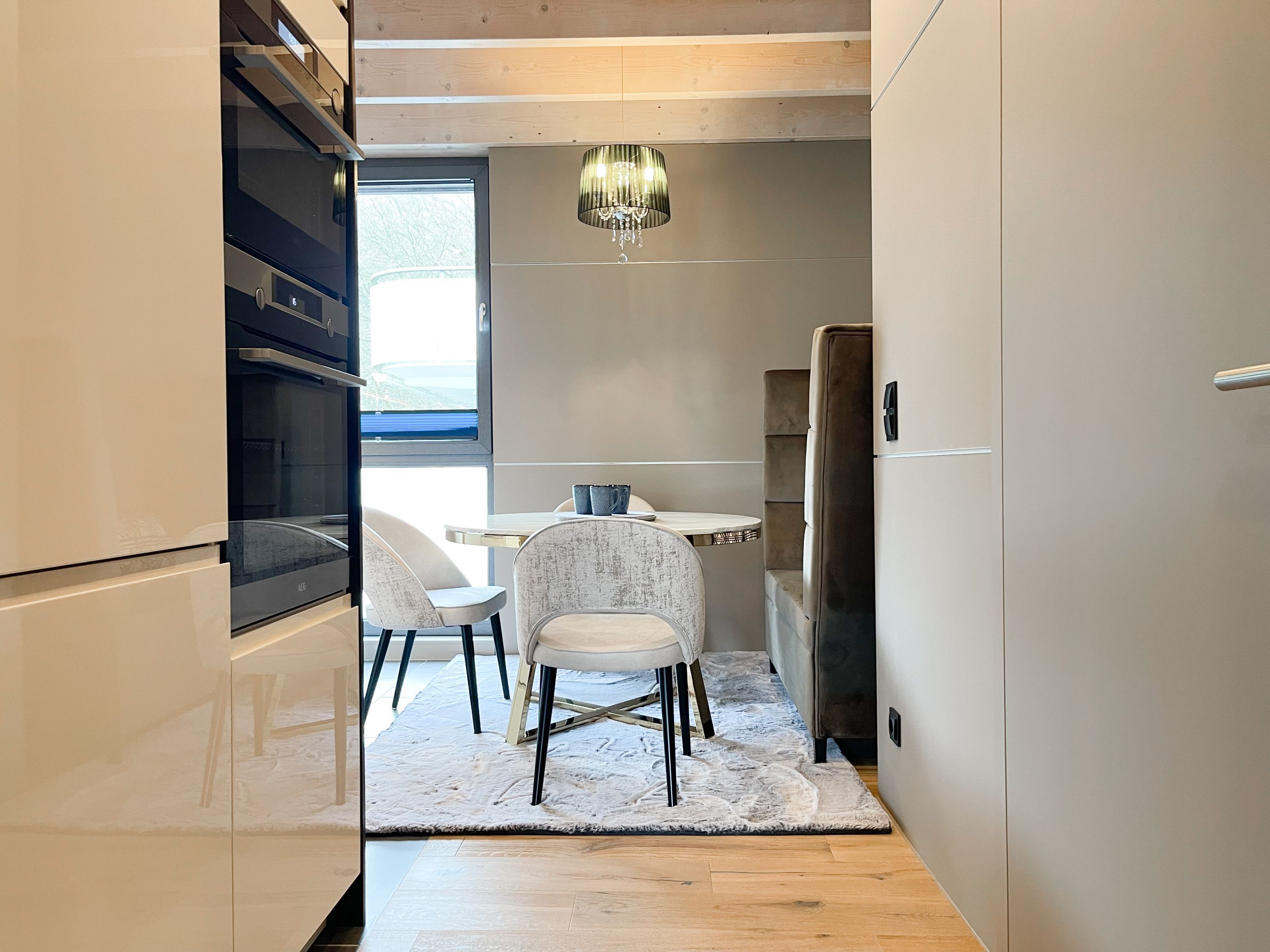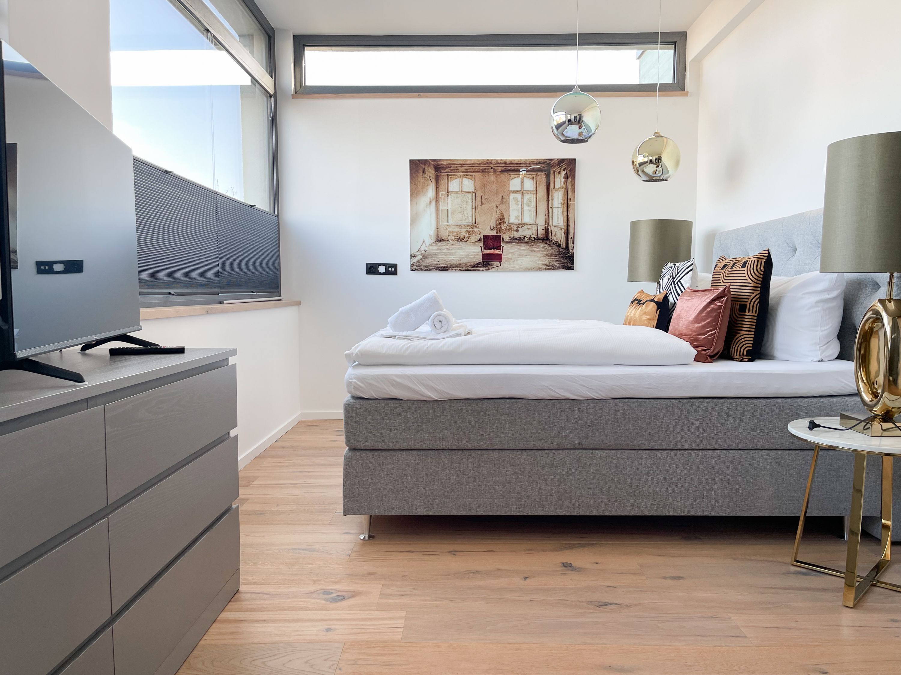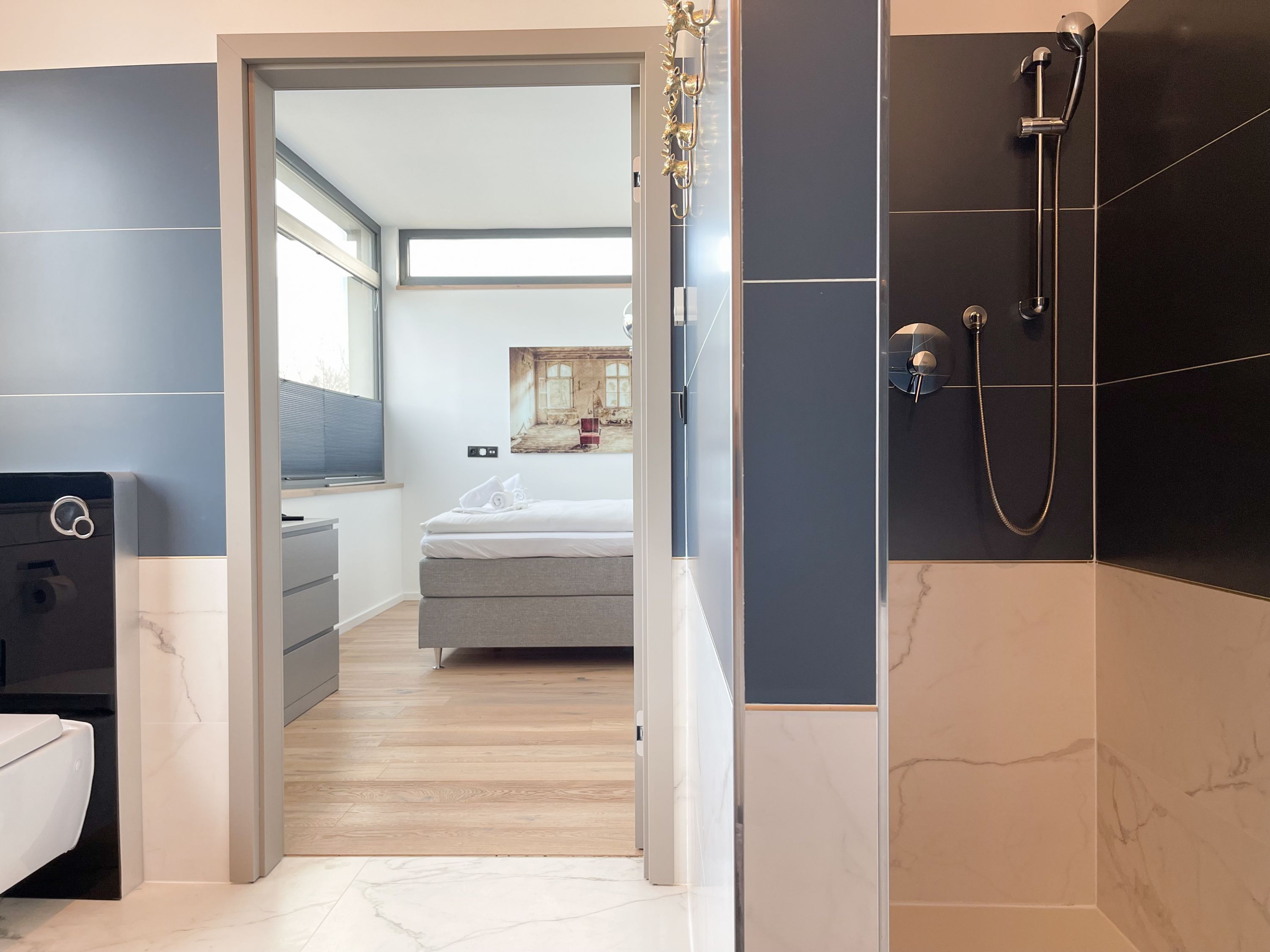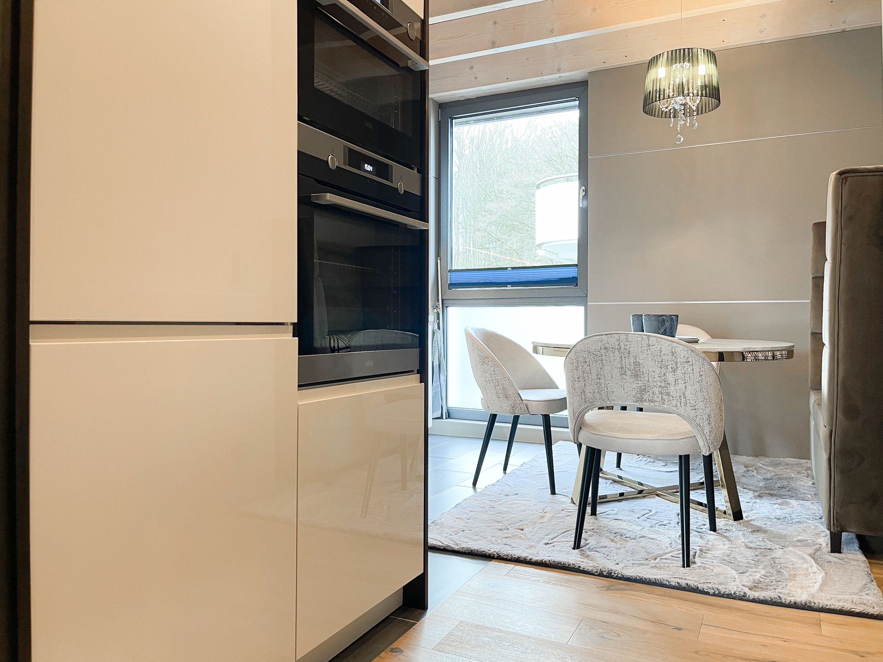 Das traumhafte Penthouse gewährleistet einen hohen Wohnstandard in einem herrlichen Ambiente und bietet jeglichen Komfort für 4 Personen, um einen entspannten Urlaub in Strandnähe zu verleben. Das Penthouse befindet sich im 2. Obergeschoss und verfügt über zwei separate Schlafzimmer mit Boxspringbetten (180x200 und 160x200), TV und teilweise Plissees zur Abdunkelung der Räumlichkeiten (keine vollständige Verdunkelung) sowie ein exklusives Bad mit Walk In Dusche, das sich zwischen den beiden Schlafzimmern befindet. Zusätzlich steht ein separates Gäste WC zur Verfügung. Der großzügige Wohnbereich mit bodentiefen Fensterflächen zum Südbalkon, ist mit einem gemütlichen Sofa, 2 Sesseln und TV ausgestattet. WLAN steht selbstverständlich zur kostenlosen Nutzung zur Verfügung. Die hochmoderne Wohnküche ist bestens ausgestattet. Gekocht wird in der modernen Wohnküche in bester Ausstattung, die mit einen stylischen Sofa, Tisch und 3 Stühlen eingerichtet ist und nicht nur zum Essen, sondern auch zum gemütlichen Beisammensein einlädt.
