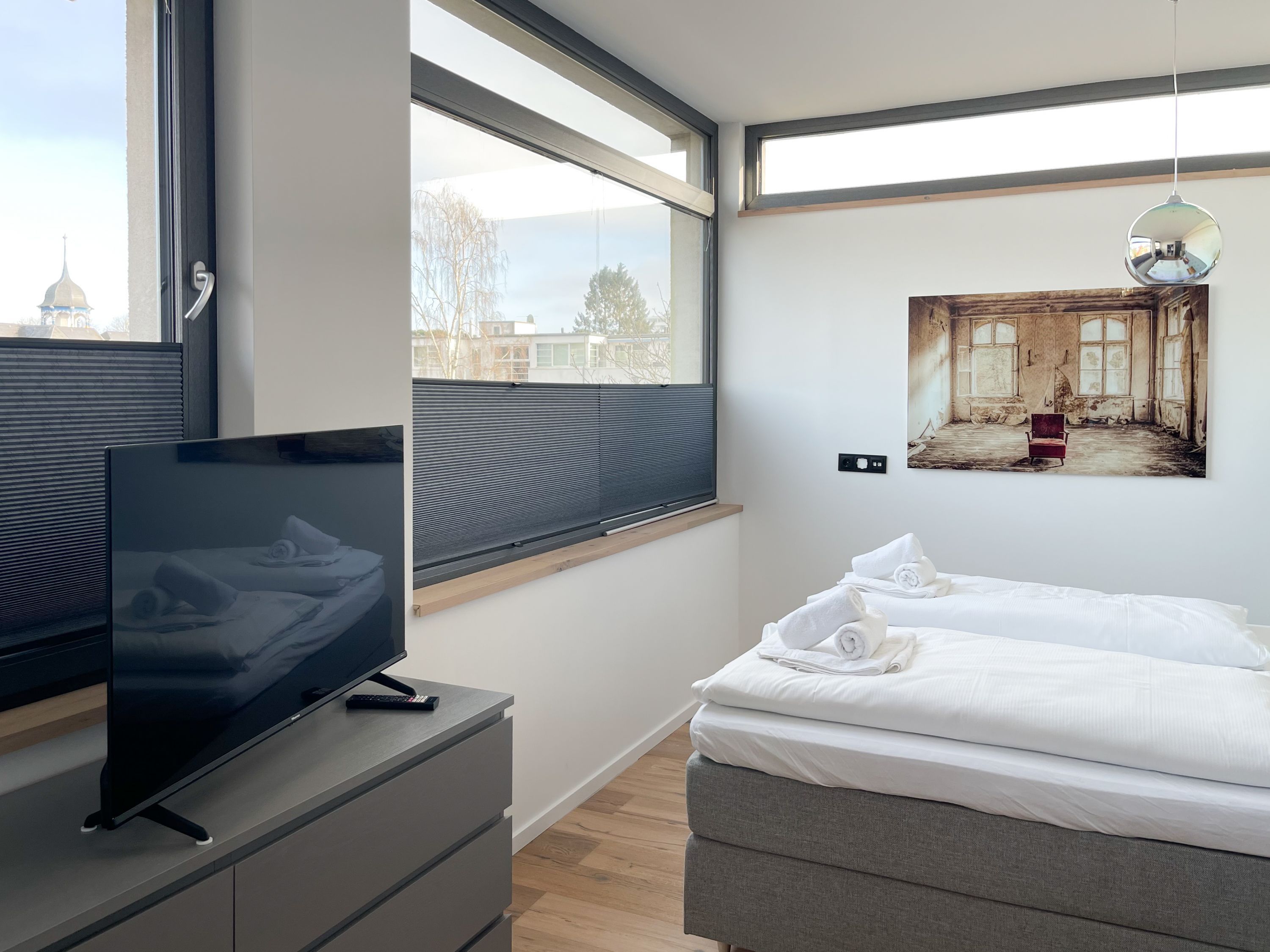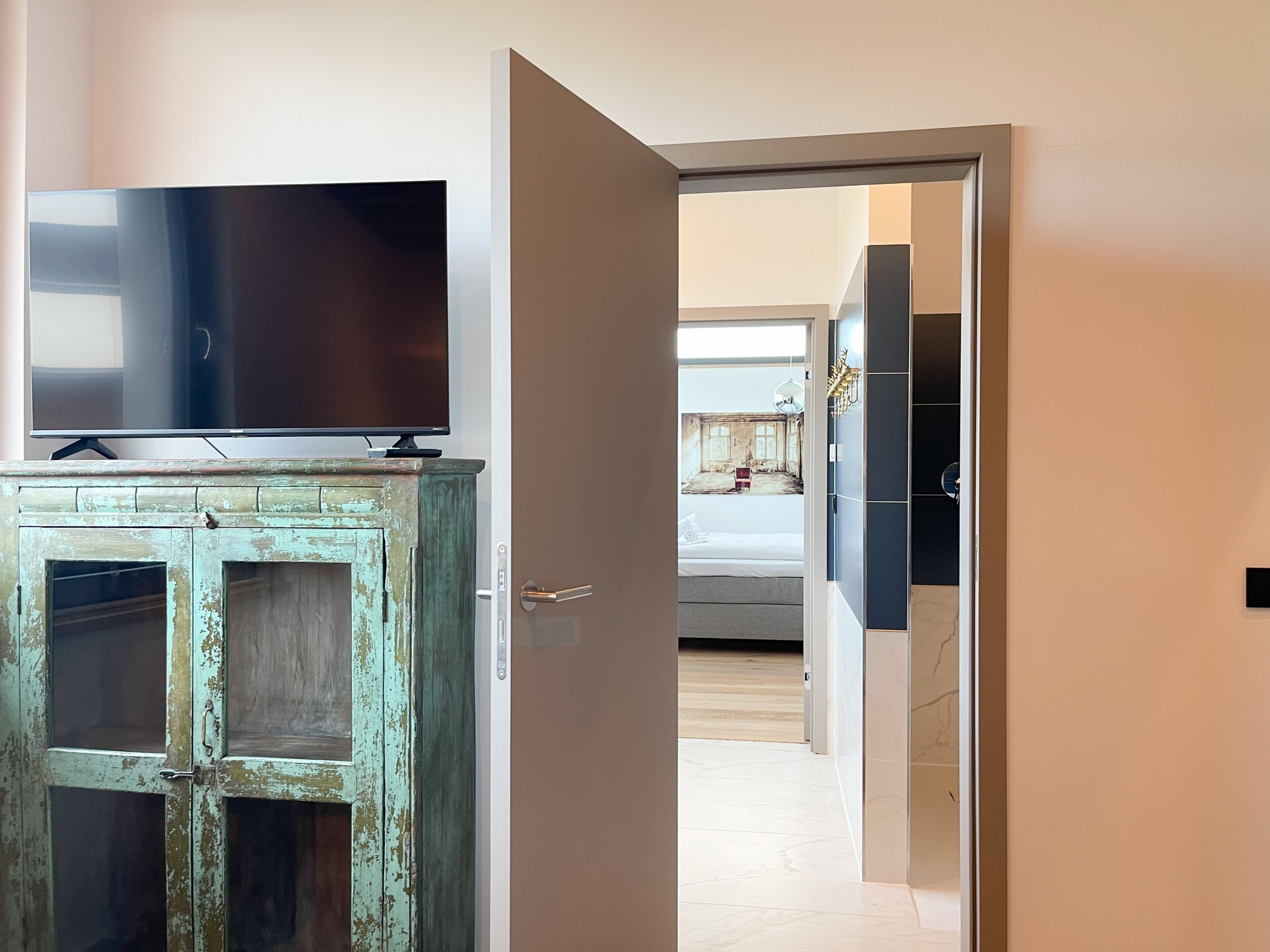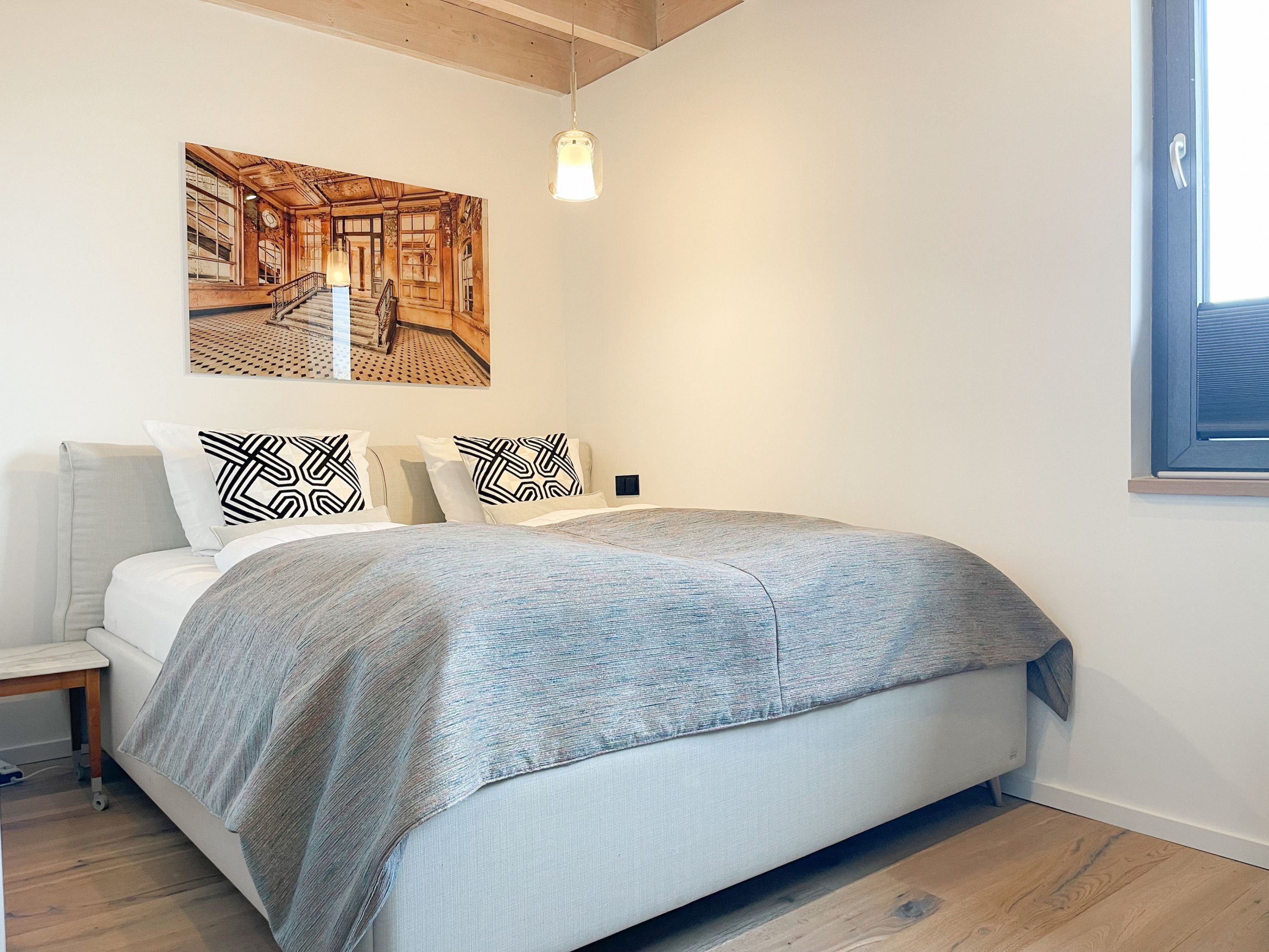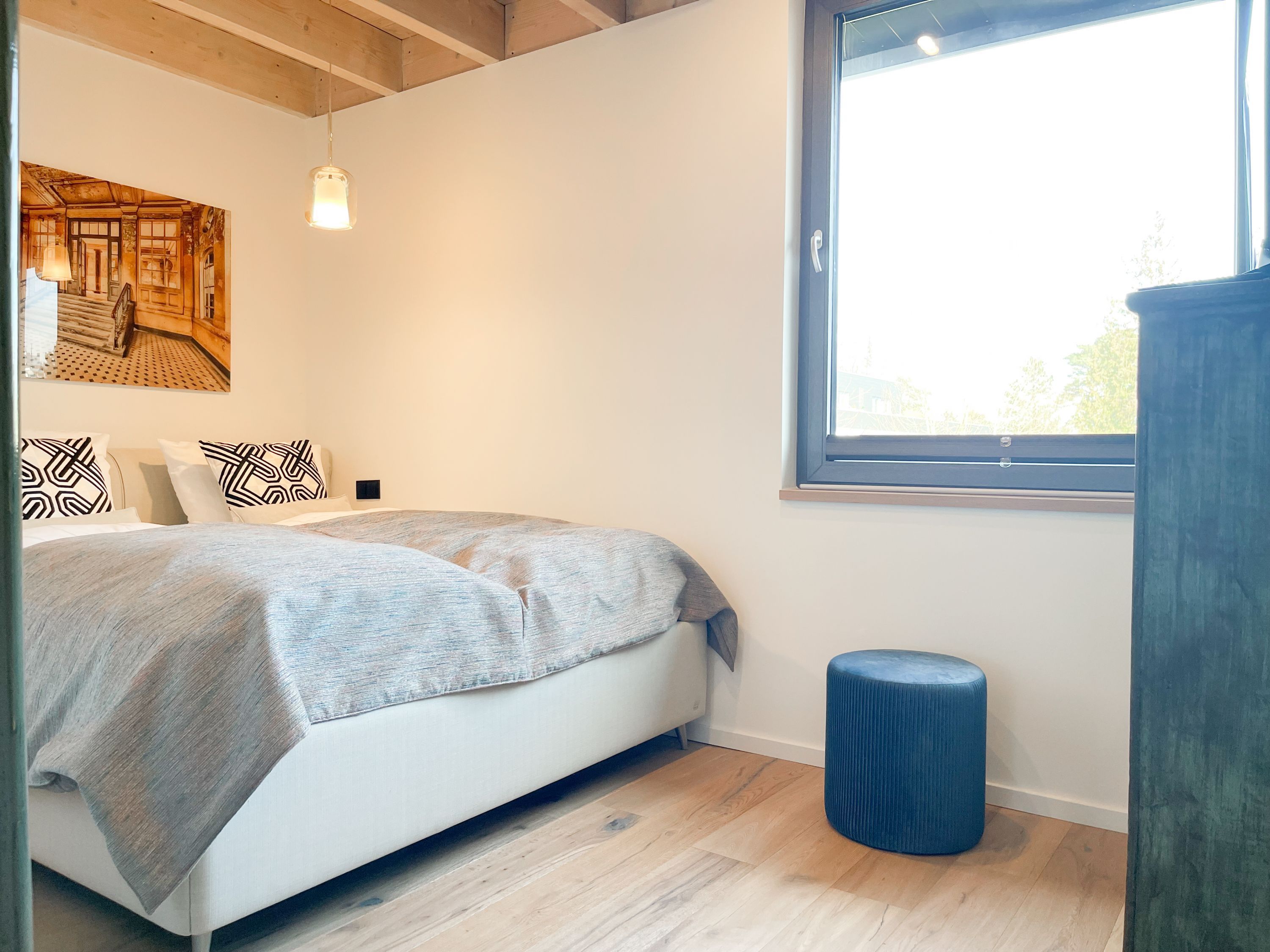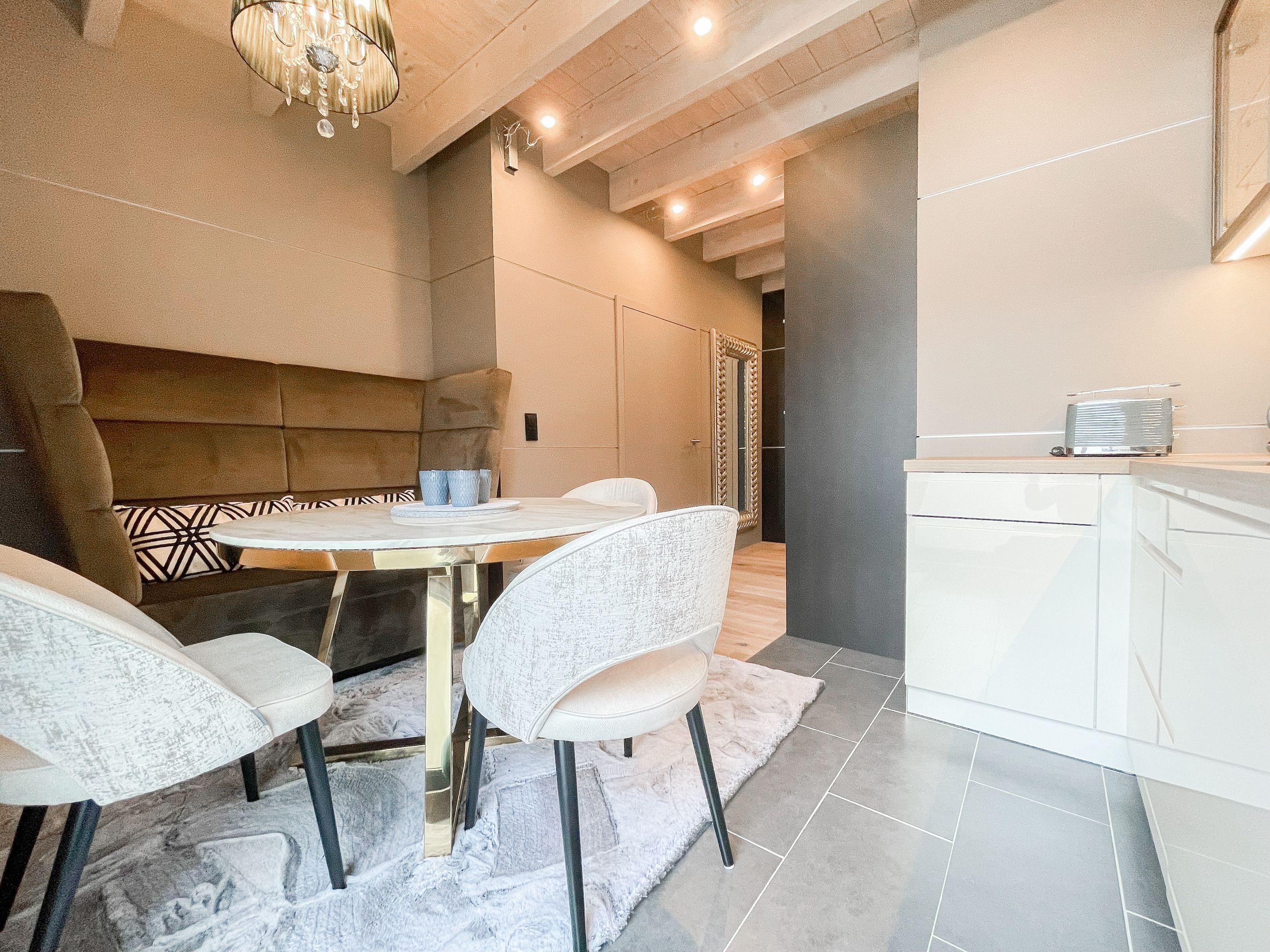 Das traumhafte Penthouse gewährleistet einen hohen Wohnstandard in einem herrlichen Ambiente und bietet jeglichen Komfort für 4 Personen, um einen entspannten Urlaub in Strandnähe zu verleben. Das Penthouse befindet sich im 2. Obergeschoss und verfügt über zwei separate Schlafzimmer mit Boxspringbetten (180x200 und 160x200), TV und teilweise Plissees zur Abdunkelung der Räumlichkeiten (keine vollständige Verdunkelung) sowie ein exklusives Bad mit Walk In Dusche, das sich zwischen den beiden Schlafzimmern befindet. Zusätzlich steht ein separates Gäste WC zur Verfügung. Der großzügige Wohnbereich mit bodentiefen Fensterflächen zum Südbalkon, ist mit einem gemütlichen Sofa, 2 Sesseln und TV ausgestattet. WLAN steht selbstverständlich zur kostenlosen Nutzung zur Verfügung. Die hochmoderne Wohnküche ist bestens ausgestattet. Gekocht wird in der modernen Wohnküche in bester Ausstattung, die mit einen stylischen Sofa, Tisch und 3 Stühlen eingerichtet ist und nicht nur zum Essen, sondern auch zum gemütlichen Beisammensein einlädt.