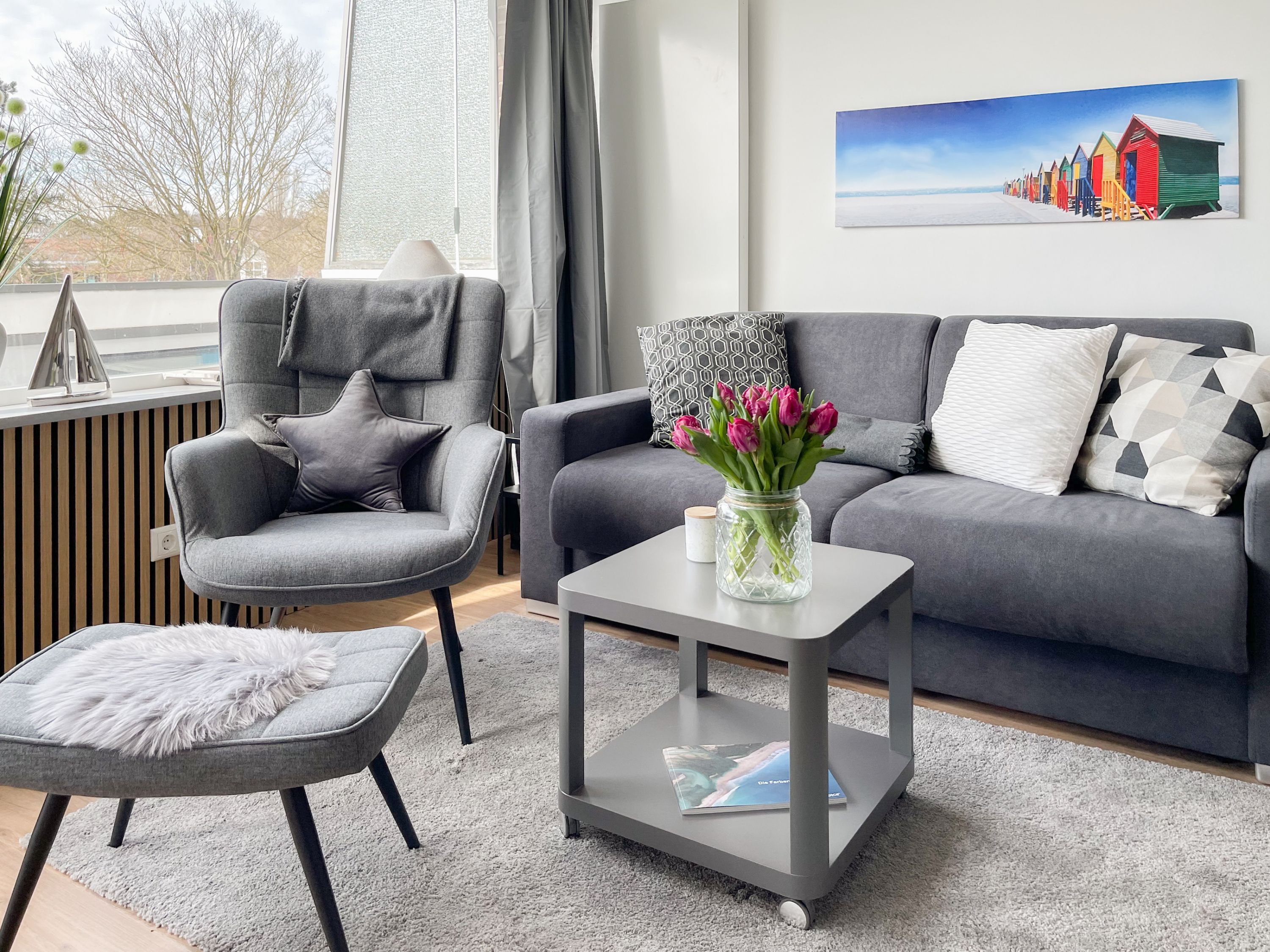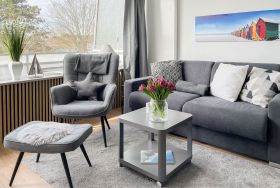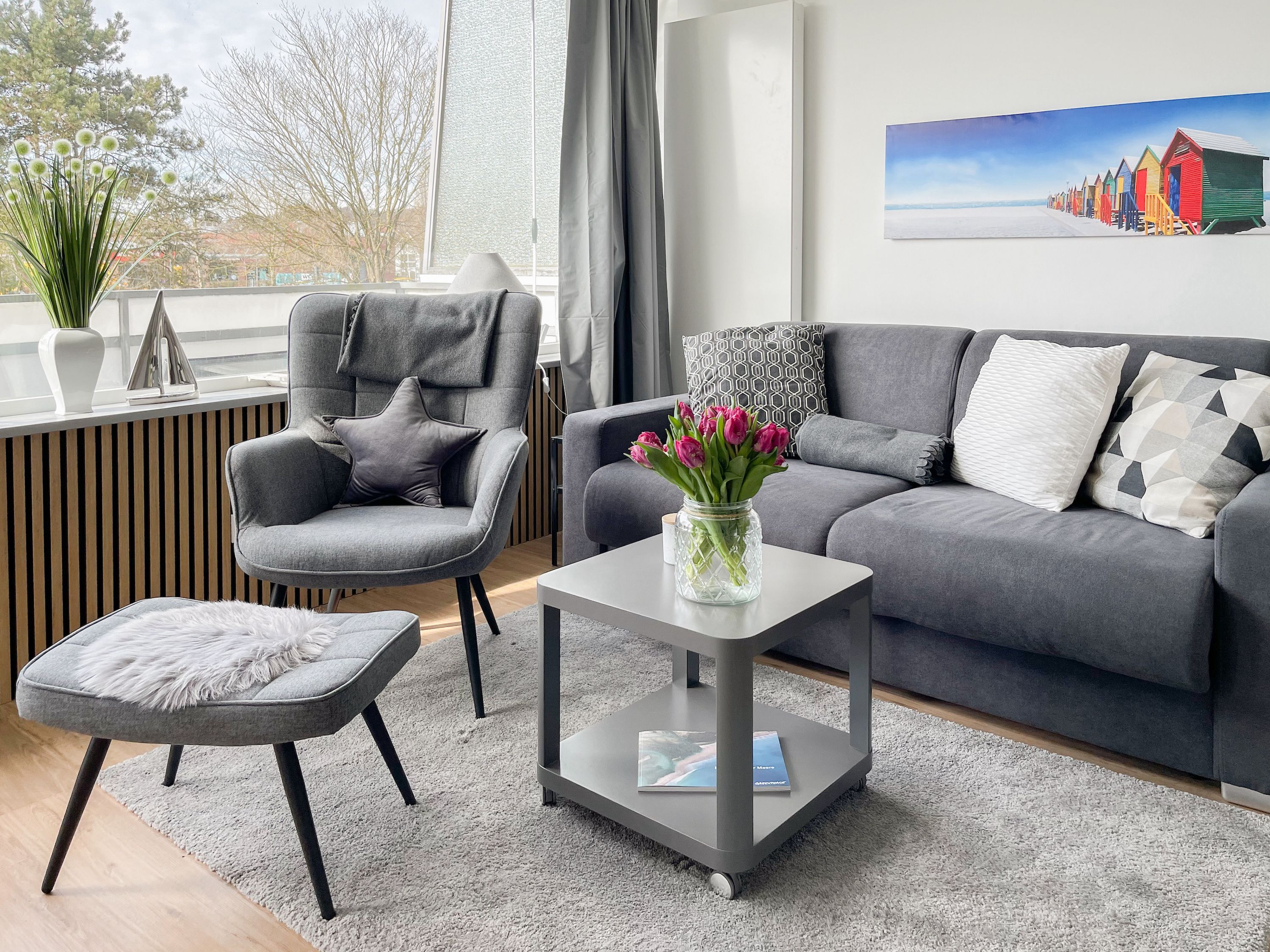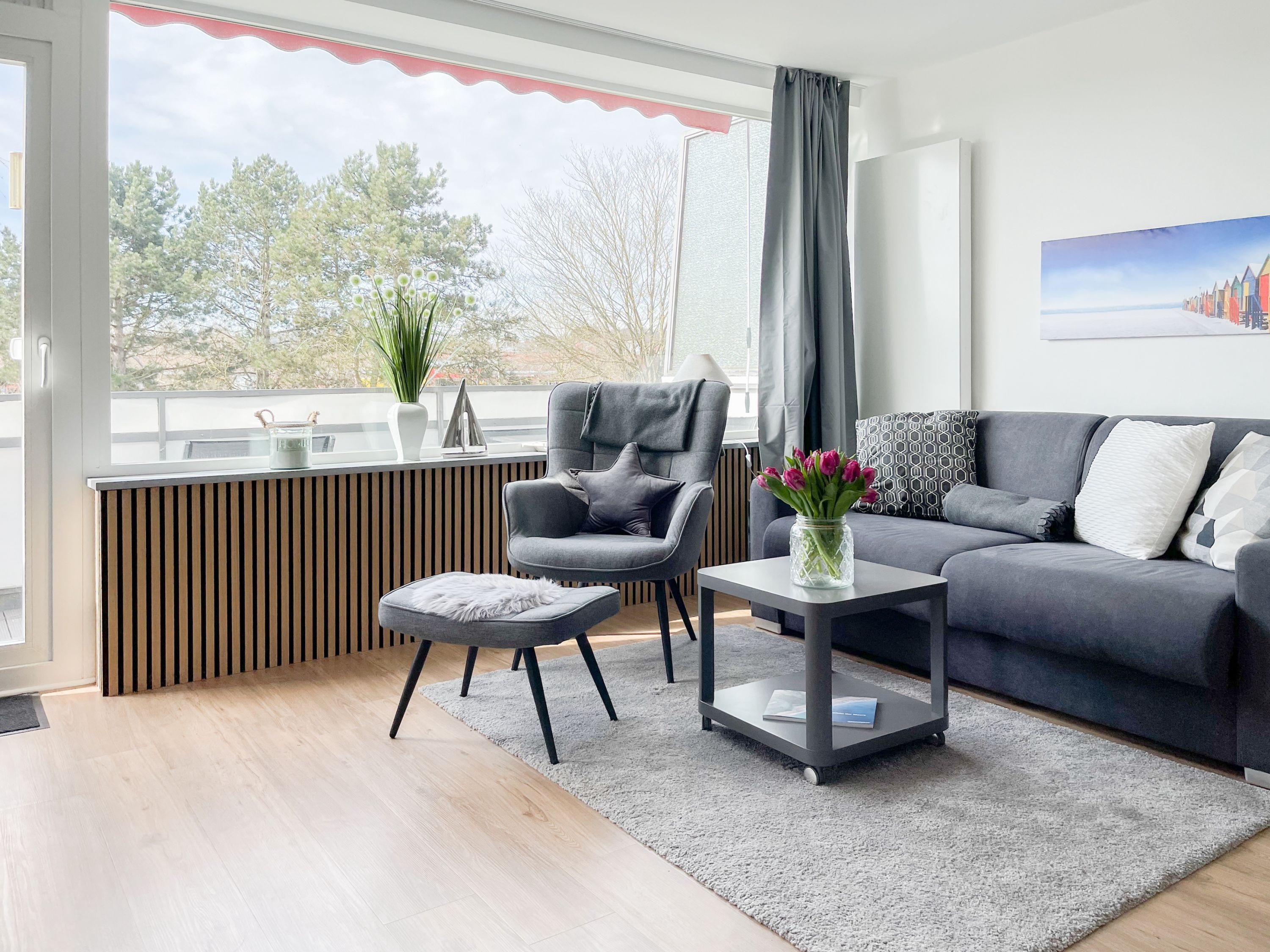 Die Ferienwohnung im 1. Obergeschoss besticht durch ihr gelungenes Raumkonzept und lädt 2-3 Personen zum Wohlfühlen in Strandnähe ein. Der herrliche Sonnenbalkon befindet sich direkt vor dem Wohnbereich und ist mit Gartenmöbeln und einer Markise ausgestattet, um zu jeder Tageszeit erholsame Stunden an der frischen Luft zu genießen. Es erwartet Sie ein heller, freundlicher Wohnraum mit großzügigen Fensterflächen, geschmackvoll gestaltet und hochwertig eingerichtet mit einem Sofa mit Schlaffunktion, TV, Bluetoothradio und einem Essbereich für 4 Personen. WLAN steht selbstverständlich zur kostenlosen Nutzung zur Verfügung. Die offene Küche ist bestens ausgestattet, unter anderem mit Spülmaschine, Mikrowelle, Backofen, Ceranfeld und vielem mehr. Das Schlafzimmer ist mit Schiebetüren vom Wohnbereich getrennt und bietet ein hochwertiges Boxpringbett (180x200), elektrische Außenjalousien und einen Kleiderschrank mit ausreichend Stauraum für die Urlaubsgarderobe. Das neue sehr hochwertige Bad verfügt über Dusche, WC, Waschtisch, Fön, Handtuchtrockner und ein Oberlichtfenster.