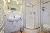 Im Bad befinden sich eine Dusche, ein WC, ein Waschtisch und ein Handtuchtrockner.