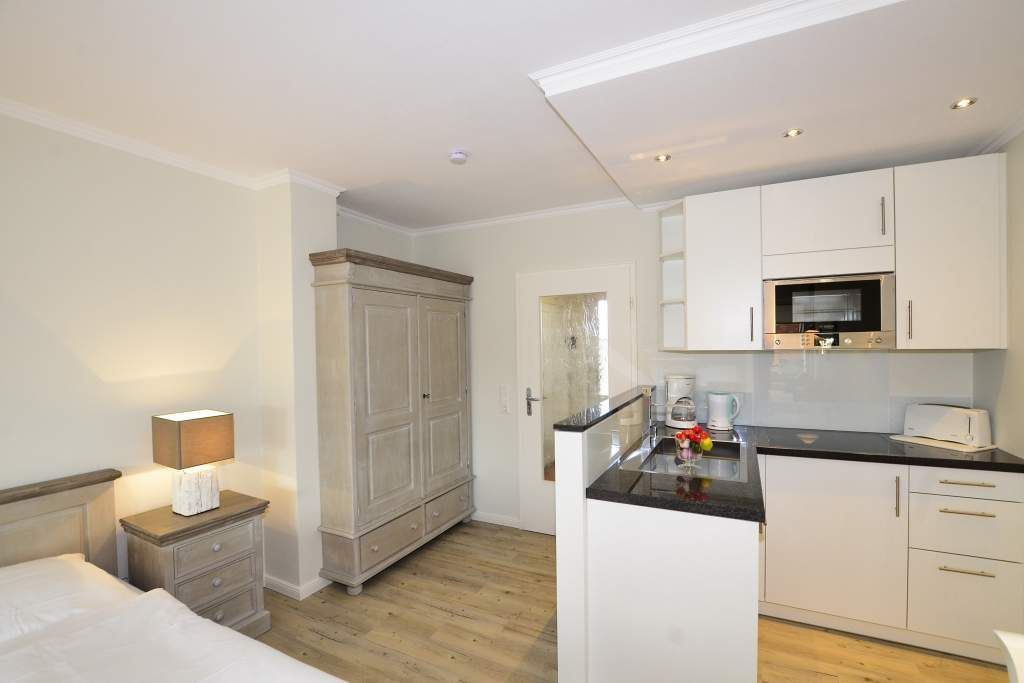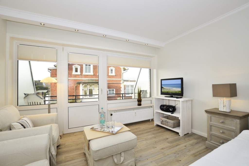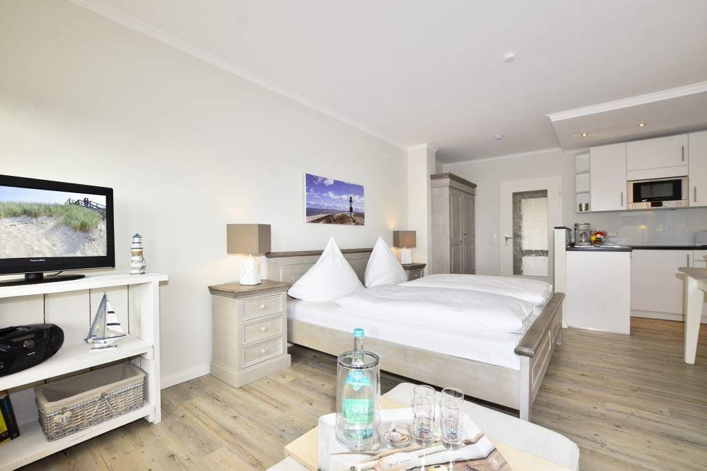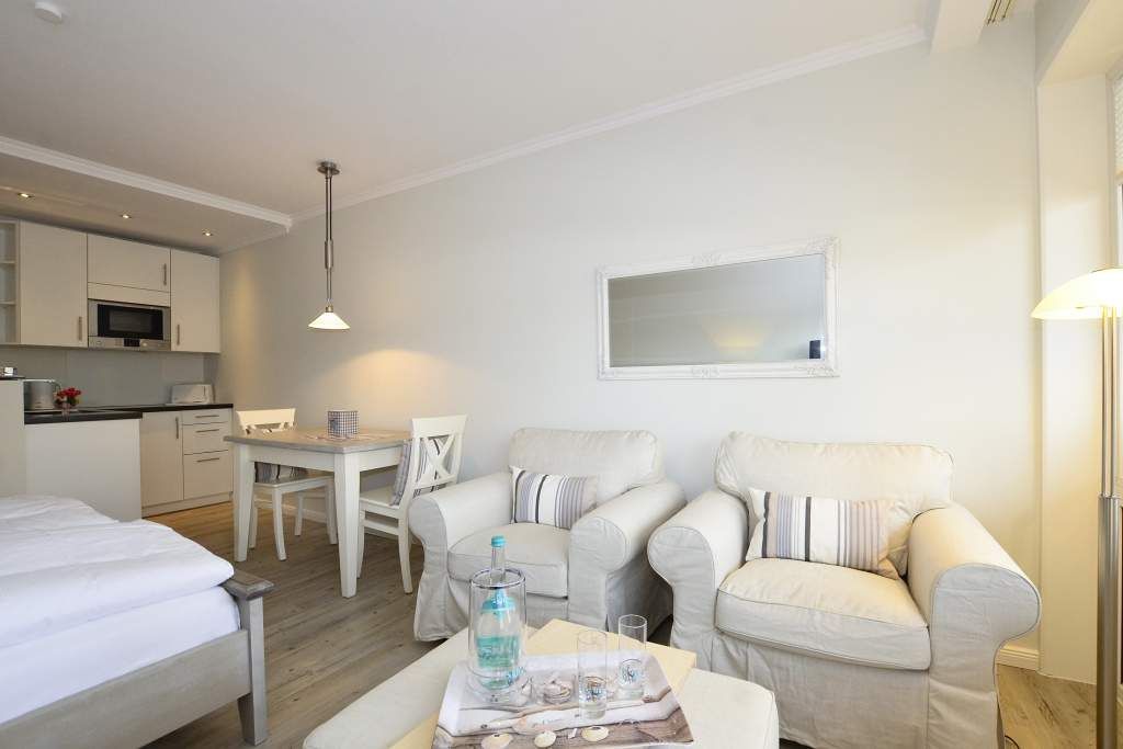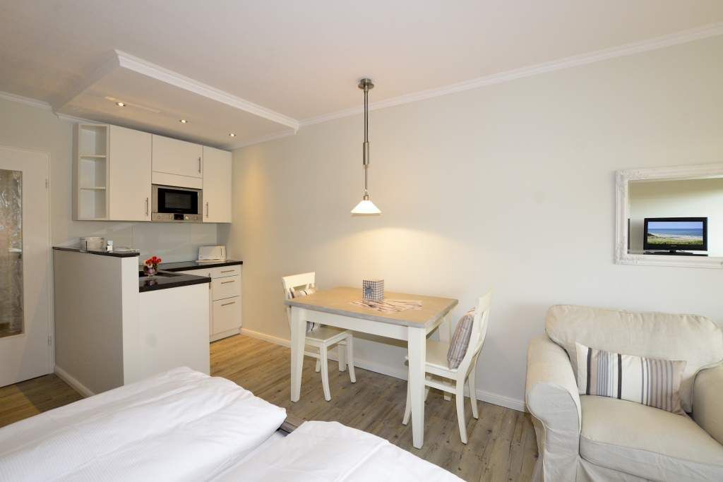 Der Wohn-/Schlafraum besteht aus zwei komfortablen und gemütlichen Sesseln mit großem Fußhocker, einer separaten Essecke und feststehendem, neuen Doppelbett (Einzelmatratzen 0,90 x 2,00 m), großer Kabel-Flachbild-TV, Radio/CD und neuer offener Küche. Telefon mit kostenloser Telefonflatrate ins deutsche Festnetz und W-Lan (ohne Gewähr) sind vorhanden.