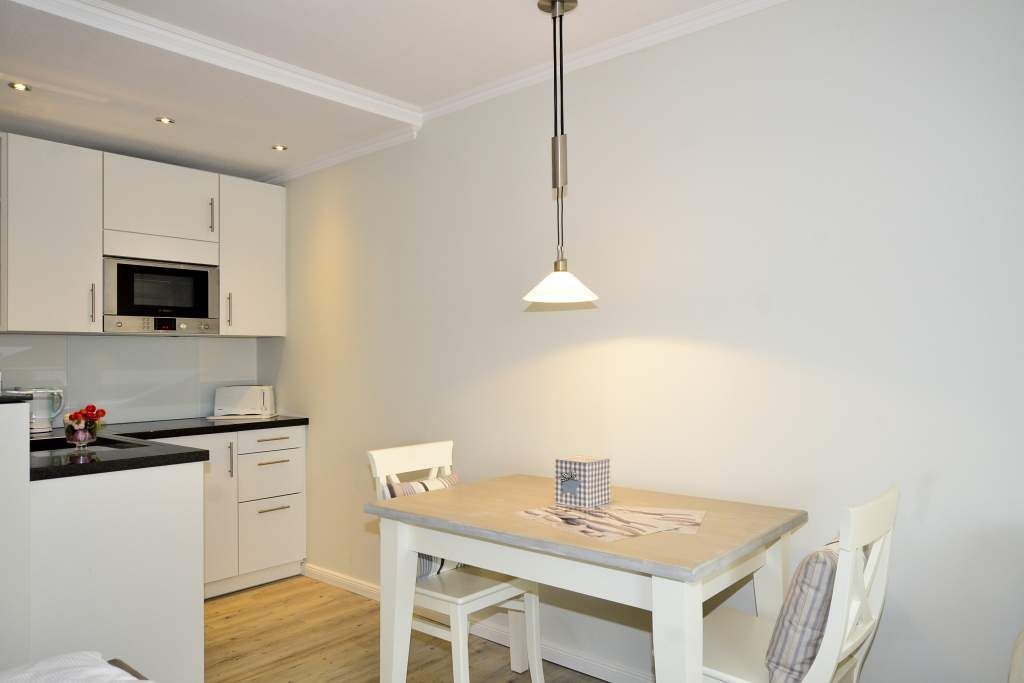 Die vollausgestattete Küche hat einen Geschirrspüler, eine Nespresso-Maschine, ein 4-Platten-Ceranfeld, eine Mikrowelle mit Backofenfunktion und eine Arbeitsplatte aus edlem, dunklem Granit. Kaffeemaschine, Wasserkocher und Toaster gehören zur Grundausstattung.