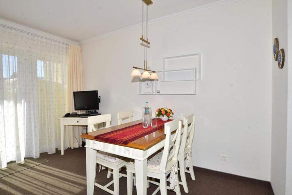 Der Wohnraum besteht aus einer Sitzecke (Schlafcouch und Sessel), einem Essplatz, Flachbild-TV, Telefon und W-Lan.