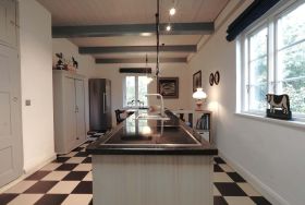 Die große, offene Küche hat einen geräumigen Frühstückstisch und alle wichtigen Geräte (großer Kühlschrank mit Gefrierfach, Herd mit Backofen, Geschirrspüler etc.). Mikrowelle, Kaffeevollautomat (DeLonghi) und Filterkaffee-Maschine, Wasserkocher und ein Toaster befinden sich in der historischen Herd-Nische. Der angrenzende Hauswirtschaftsraum beherbergt Waschmaschine und Trockner.