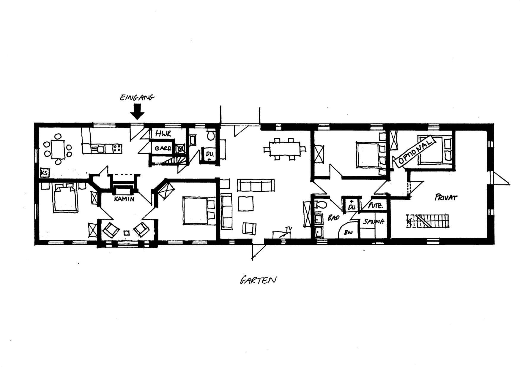 Das Ferienhaus verfügt über drei Schlafzimmer (drei Doppelbetten mit 180 × 200 cm) und zwei Badezimmer (ein Dusch- und Wannenbad mit Sauna und ein weiteres Duschbad). Bei noch mehr Platzbedarf kann auf Wunsch ein viertes Schlafzimmer (Doppelbett 160 x 200 cm) hinzugebucht werden.