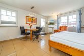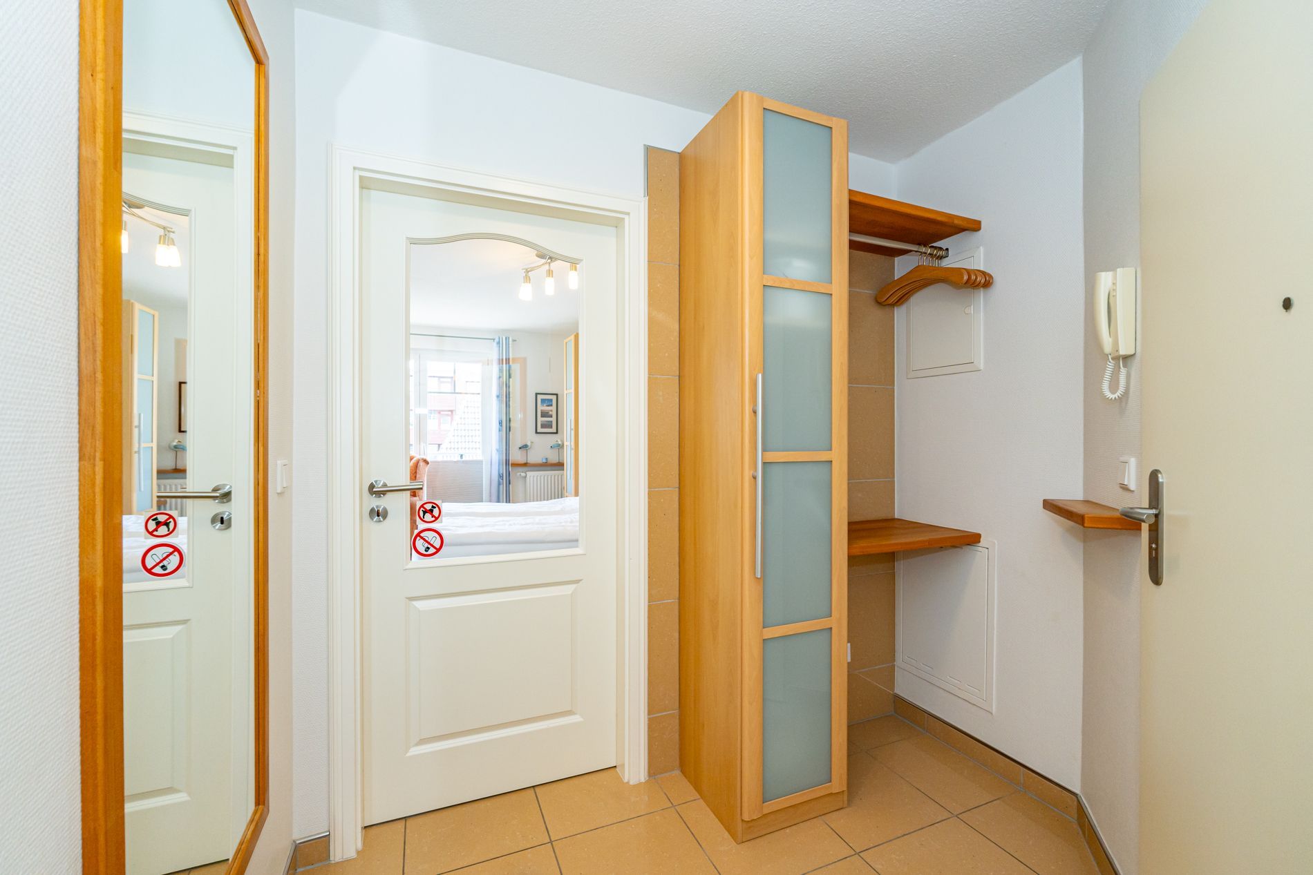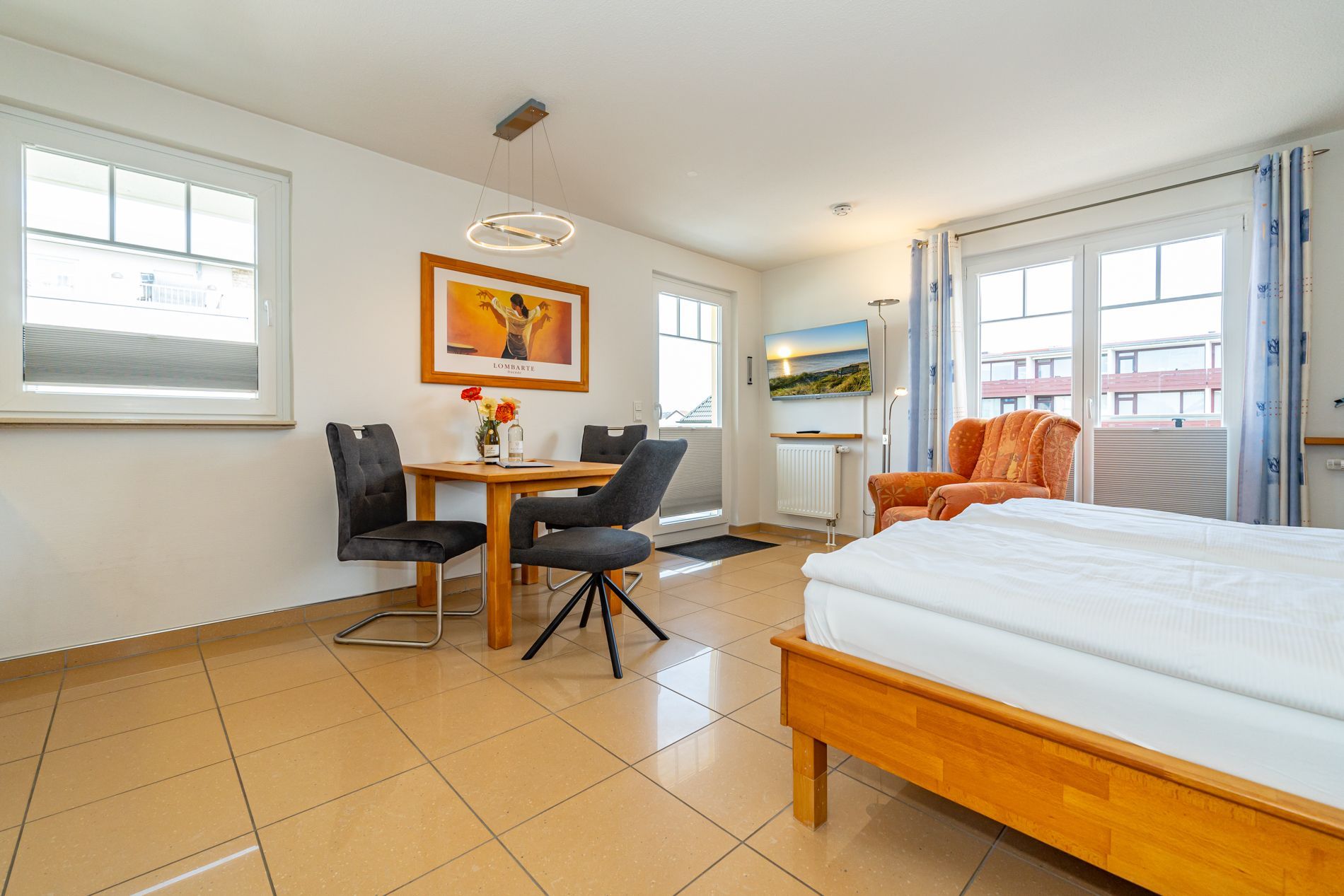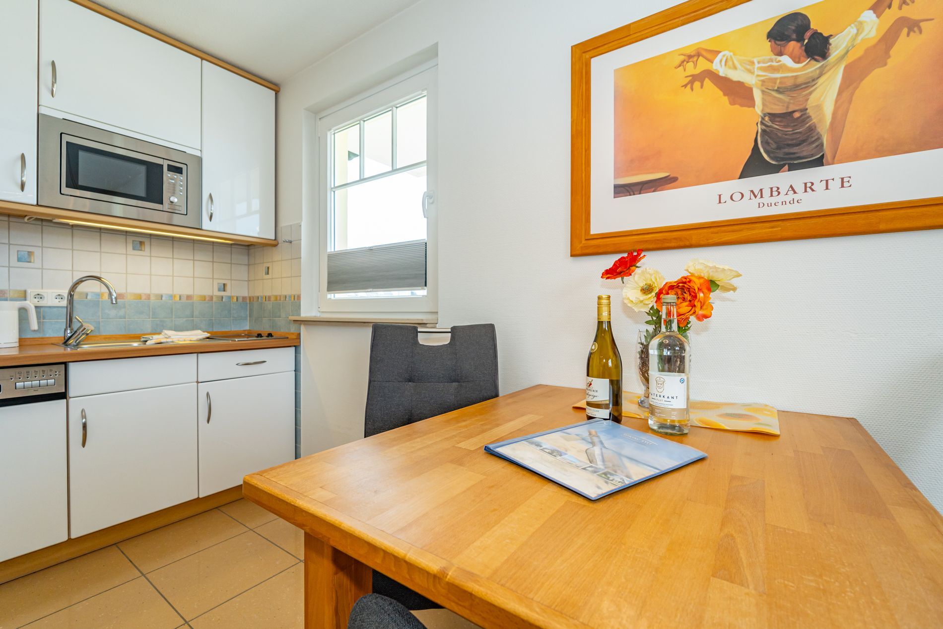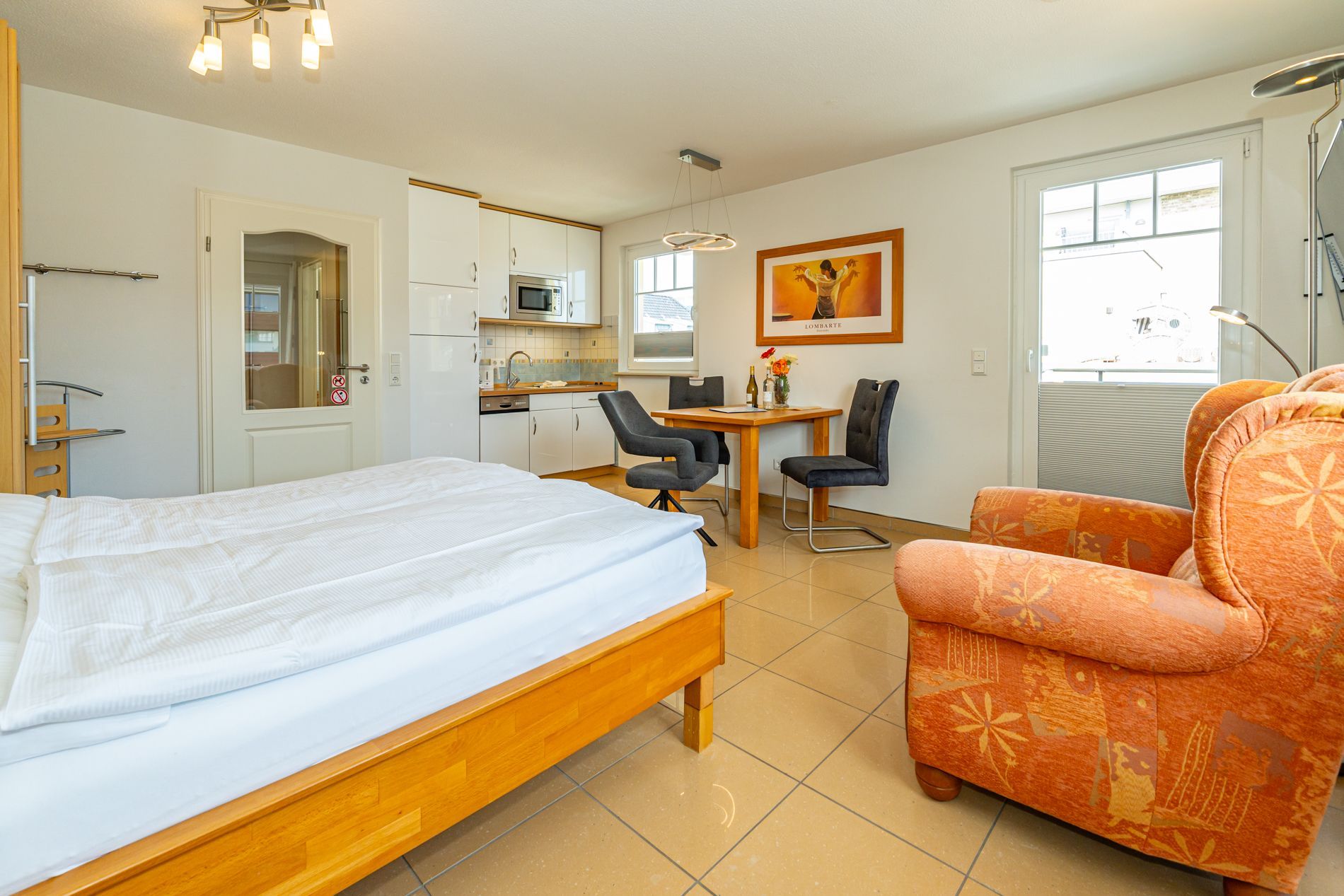 Gemütliche 1-Zimmer-Nichtraucher-Ferienwohnung mit gehobenem Komfort ca. 35 m² in der 2. Etage. Die Ferienwohnung ist ausgestattet mit feststehendem Doppelbett (7-Zonen-Latexmatratzen und 2 neue Topper), 2 gemütliche Sesseln mit Kabel-TV, Essecke, Telefon und W-Lan mit kostenfreier Flatrate ins dt. Festnetz, Küchenzeile mit Geschirrspüler, Mikrowelle, Ceranfeld, Kaffeemaschine, Wasserkocher und Toaster gehören zur Grundausstattung, Duschbad/WC und Nordostbalkon. In dieser Ferienwohnung sind das Rauchen und das Mitbringen von Haustieren nicht gestattet. Tiefgaragenplatz für Euro 14,00 pro Tag buchbar.