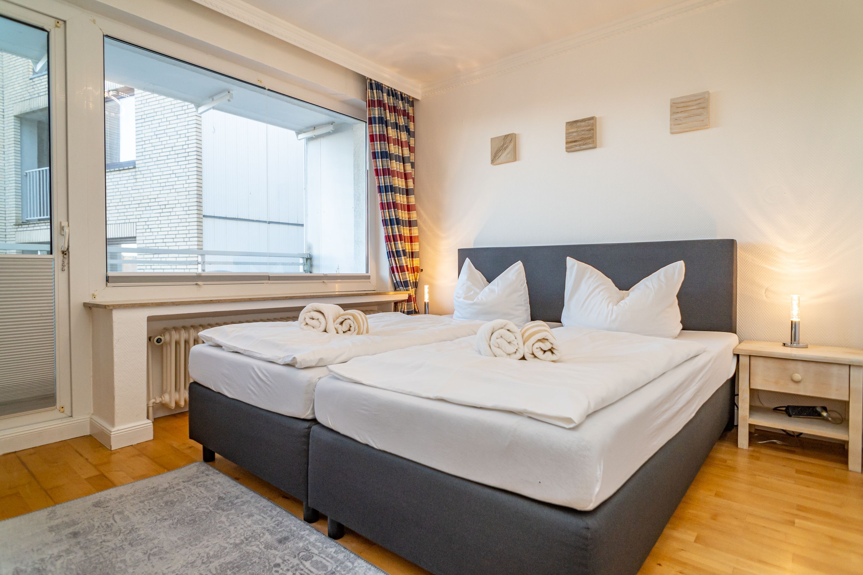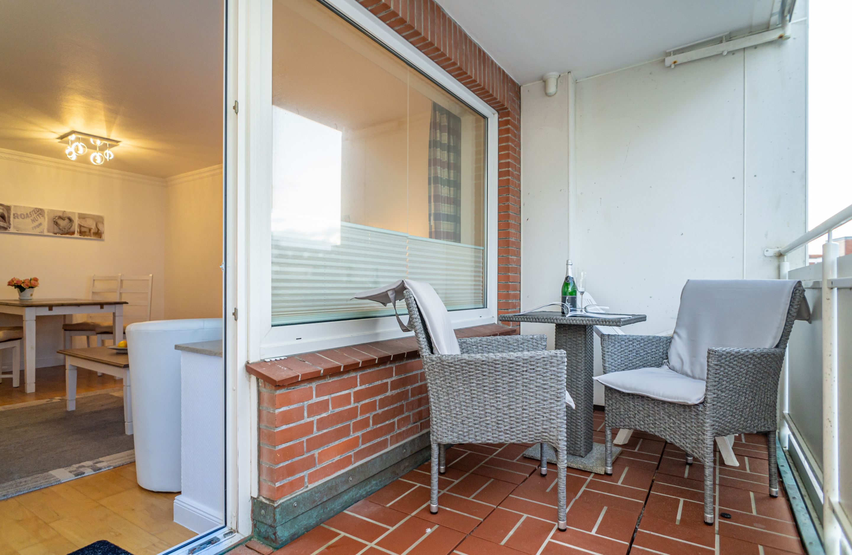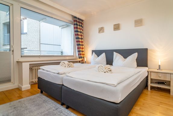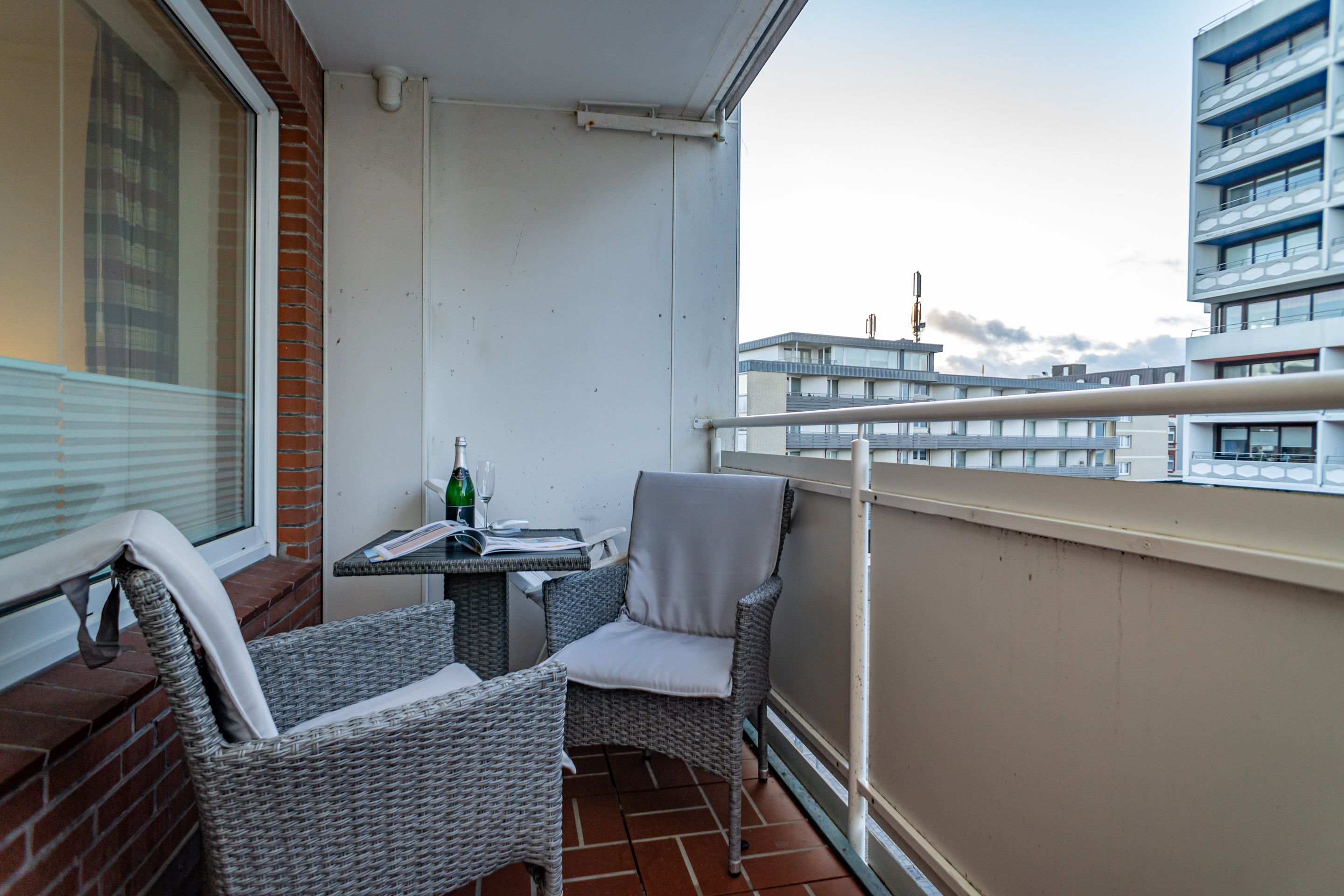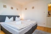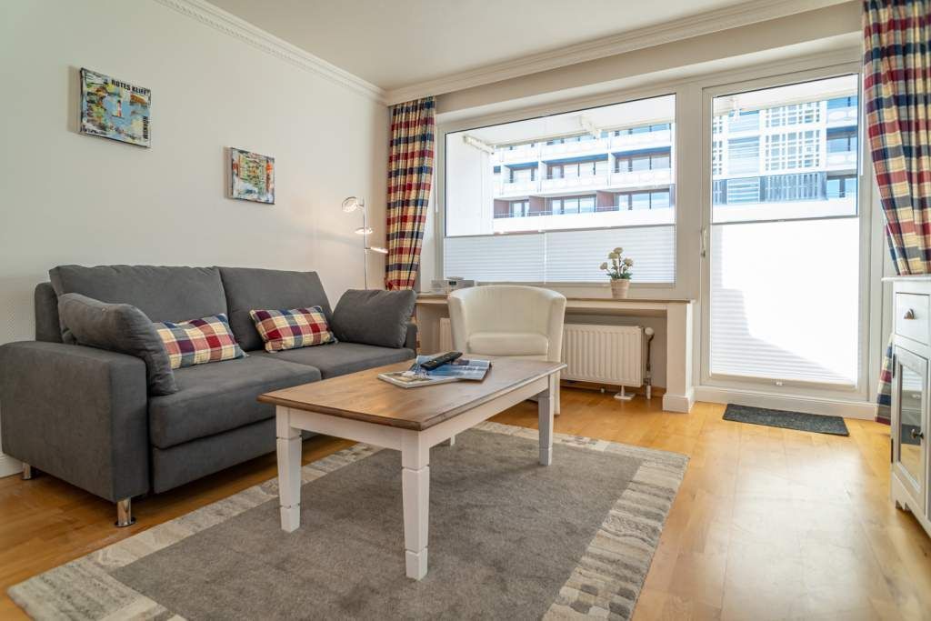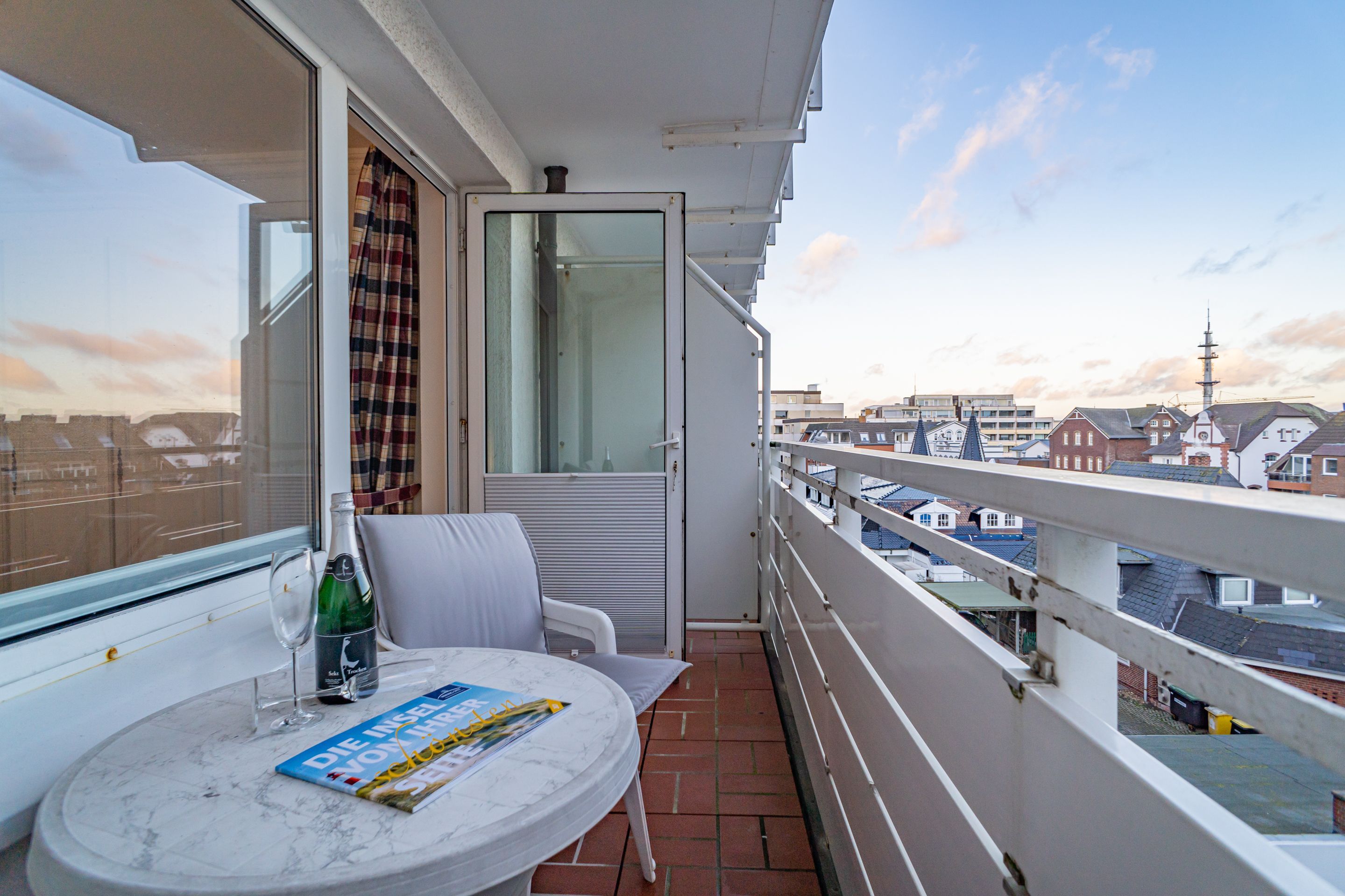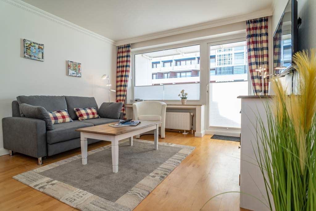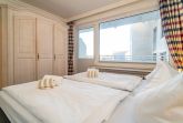 2-Zimmer-Nichtraucher-Ferienwohnung, ca. 48 qm, in der 3. Etage mit Ostbalkon (Morgensonne, mit Balkonmöbeln und Auflagen) und Westloggia (Nachmittagssonne, mit Balkonmöbel und Auflagen) für max. 3 Personen.
