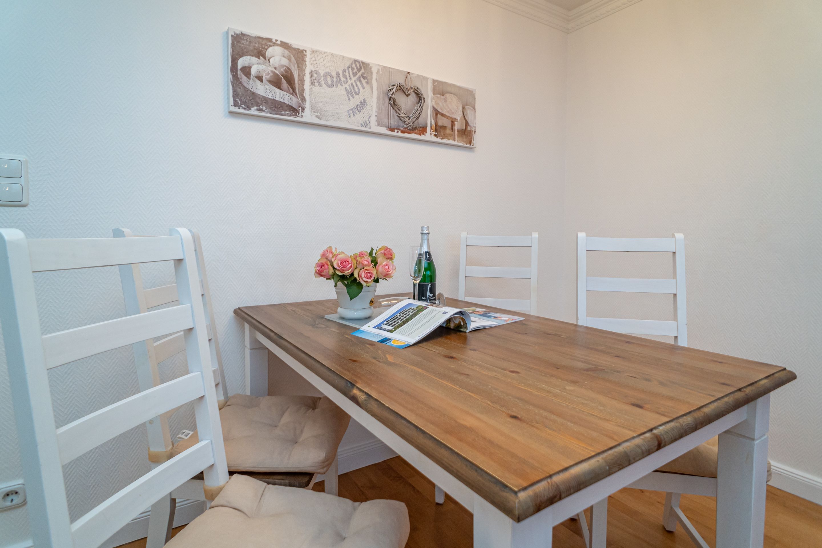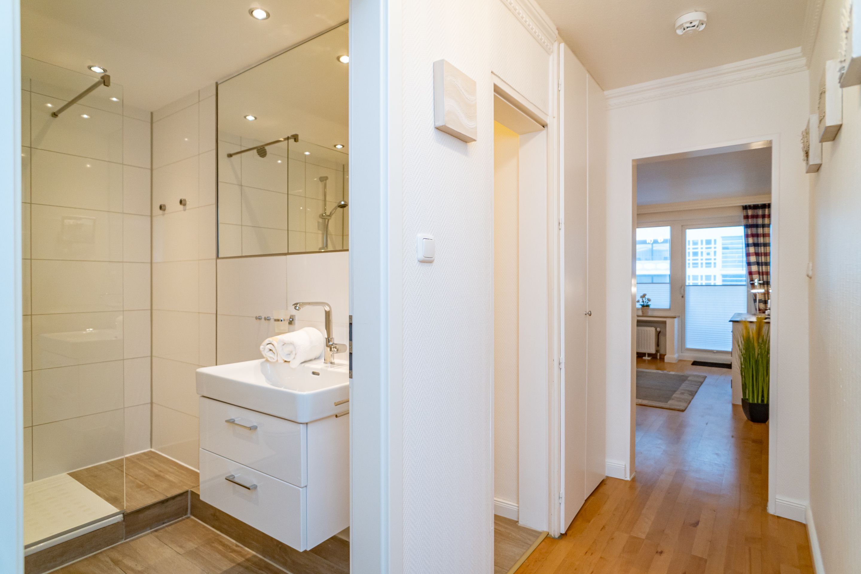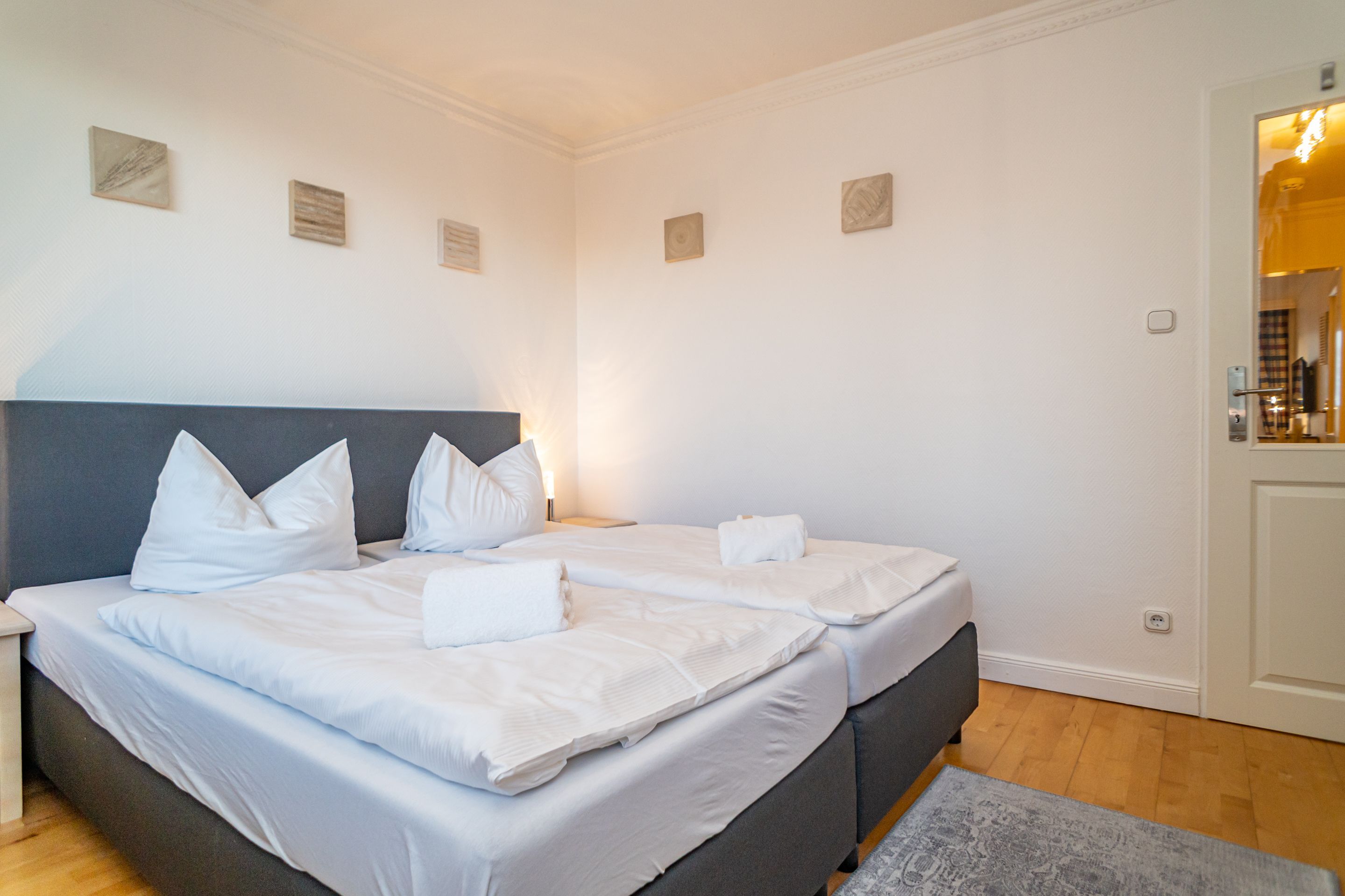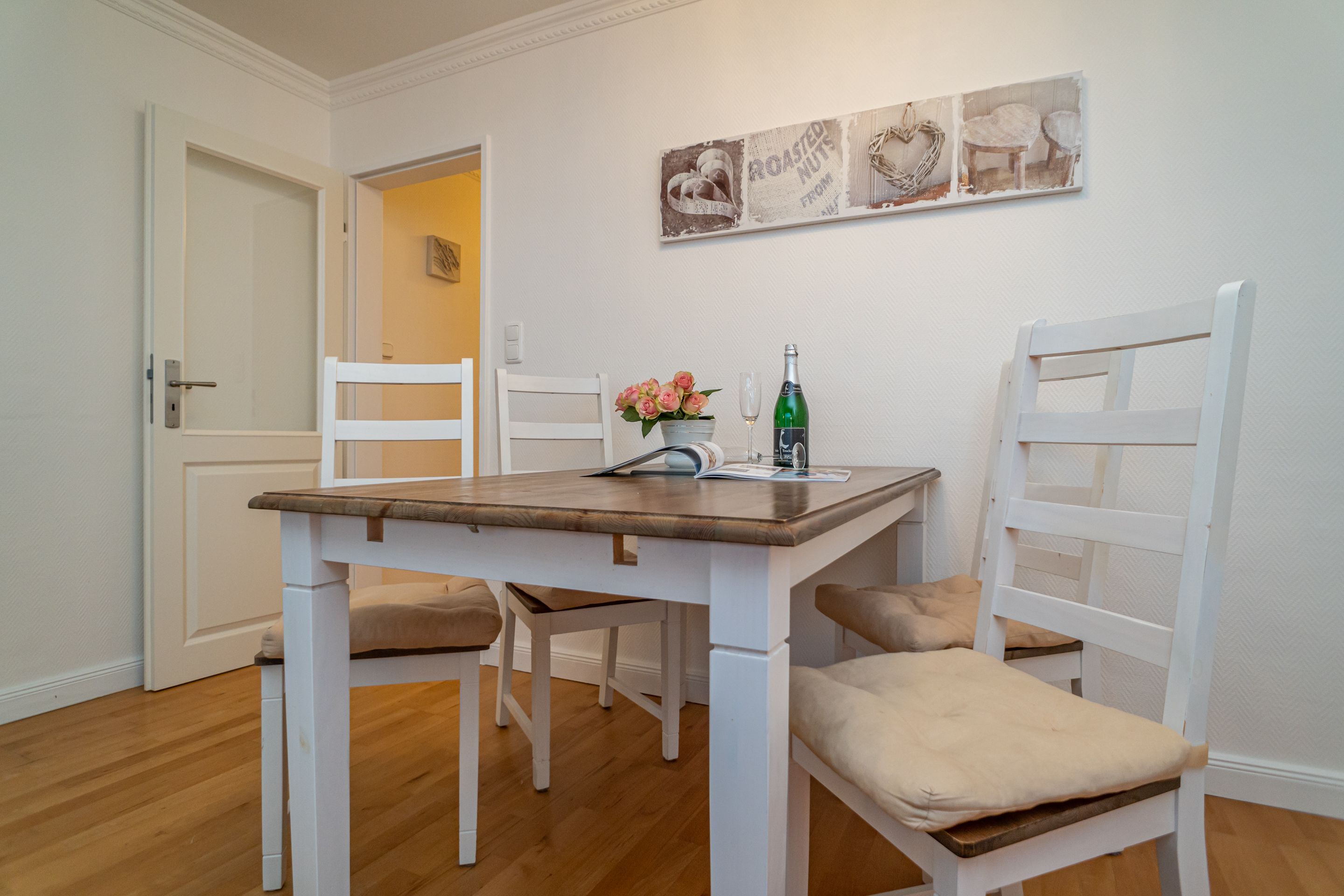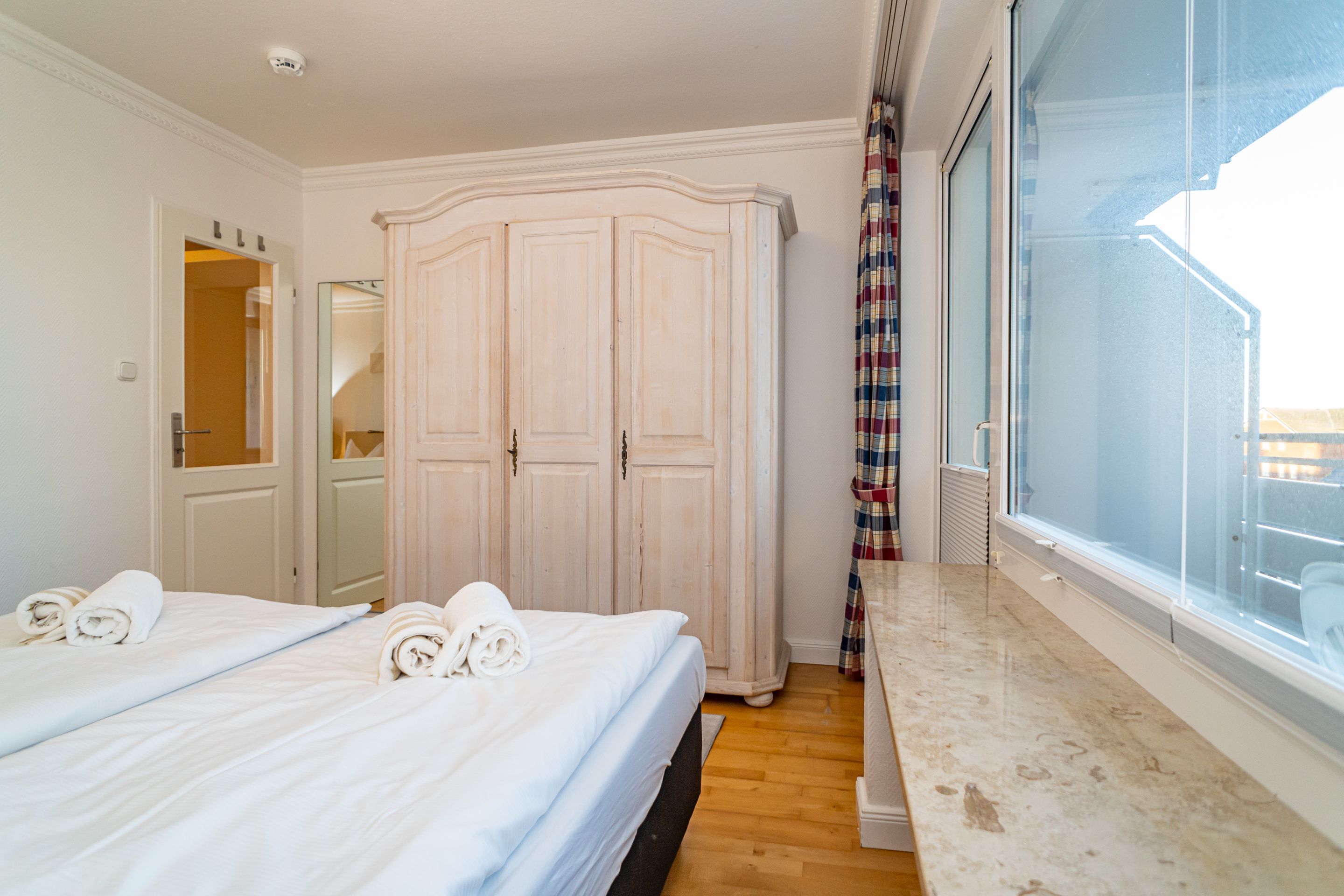 2-Zimmer-Nichtraucher-Ferienwohnung, ca. 48 qm, in der 3. Etage mit Ostbalkon (Morgensonne, mit Balkonmöbeln und Auflagen) und Westloggia (Nachmittagssonne, mit Balkonmöbel und Auflagen) für max. 3 Personen.