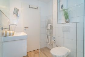 Im Bad befinden sich eine Dusche, ein WC und ein Waschtisch.
