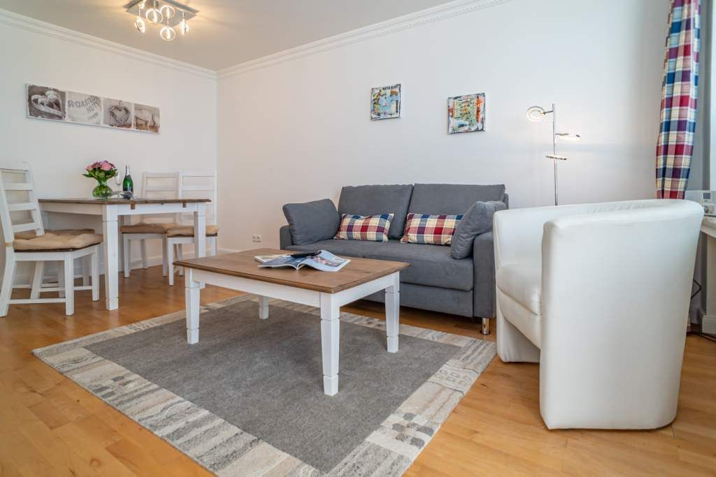 Der Wohnraum besteht aus einer Sitzecke mit einer Schlafcouch (Liegefläche 1,60 x 2,00 m), einem Essplatz und einem Kabel-Flachbild-TV und WLan (ohne Gewähr).