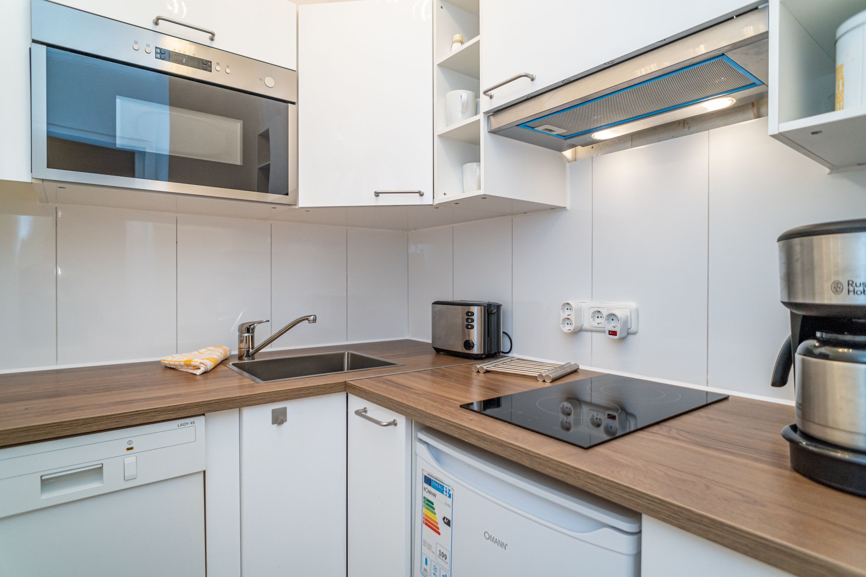 Die Küche hat ein Ceranfeld mit 2 Kochfeldern, einen Kühlschrank, eine Mikrowelle mit Grillfunktion und einen Geschirrspüler. Kaffeemaschine, Wasserkocher und Toaster gehören zur Grundausstattung.