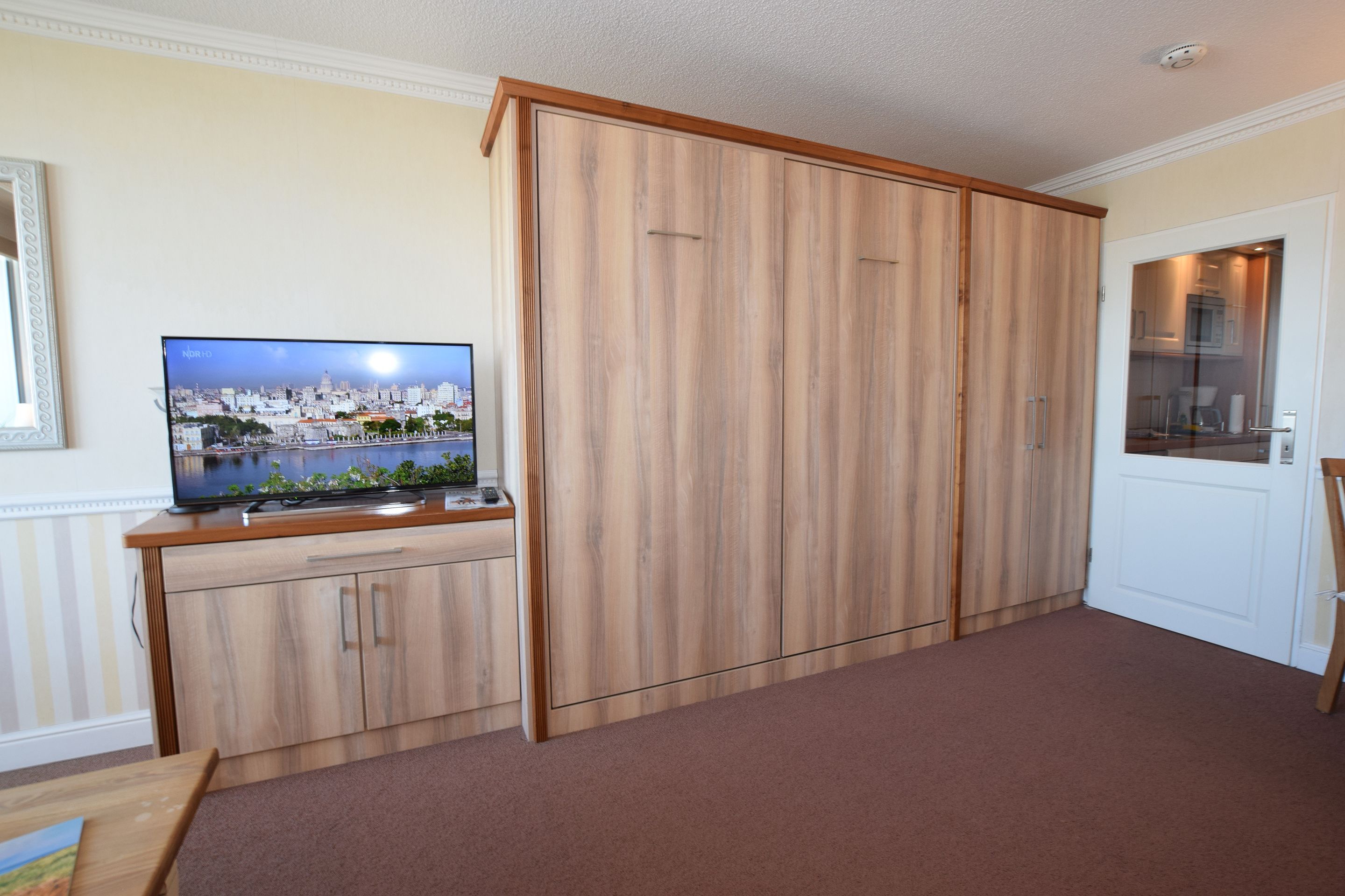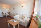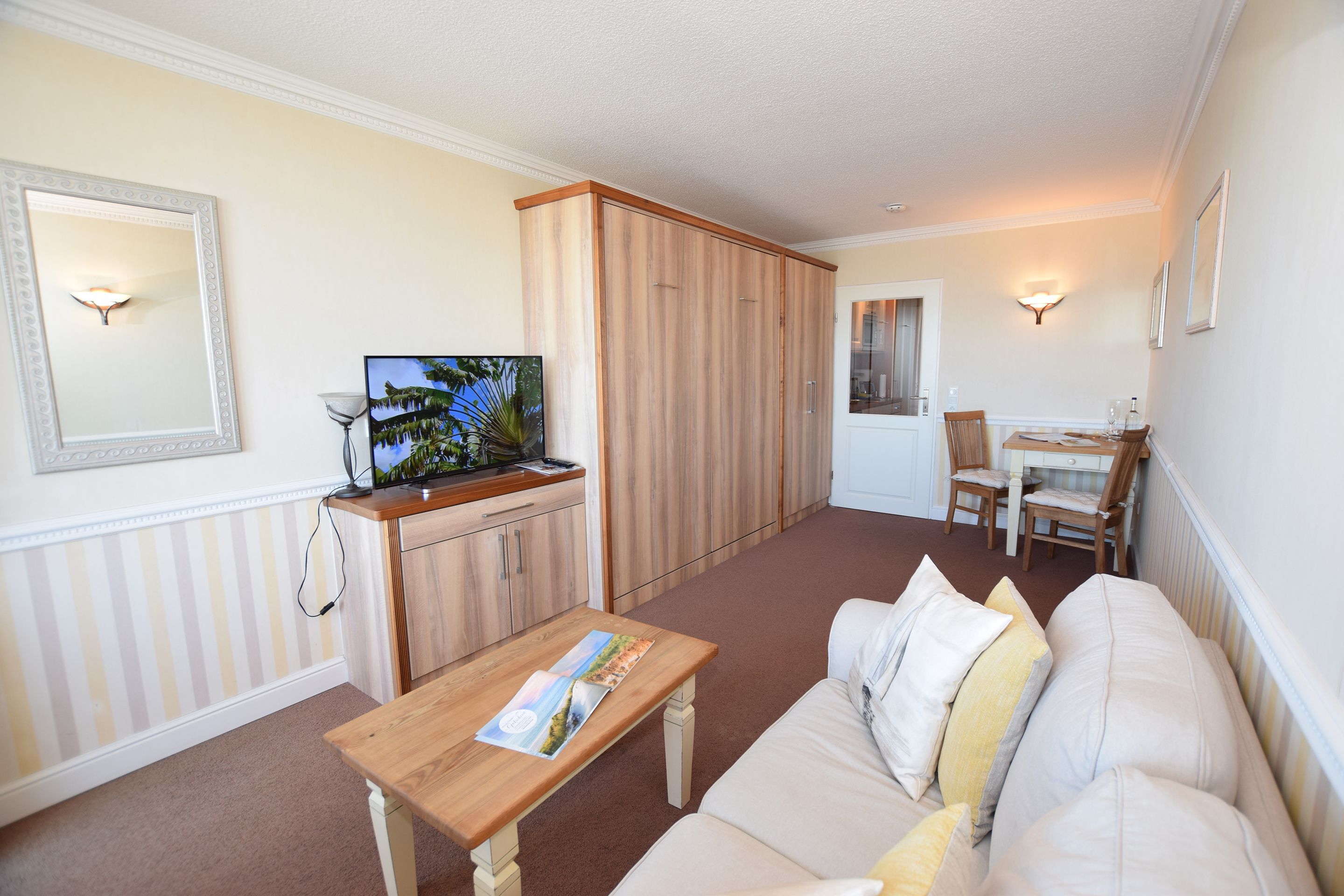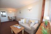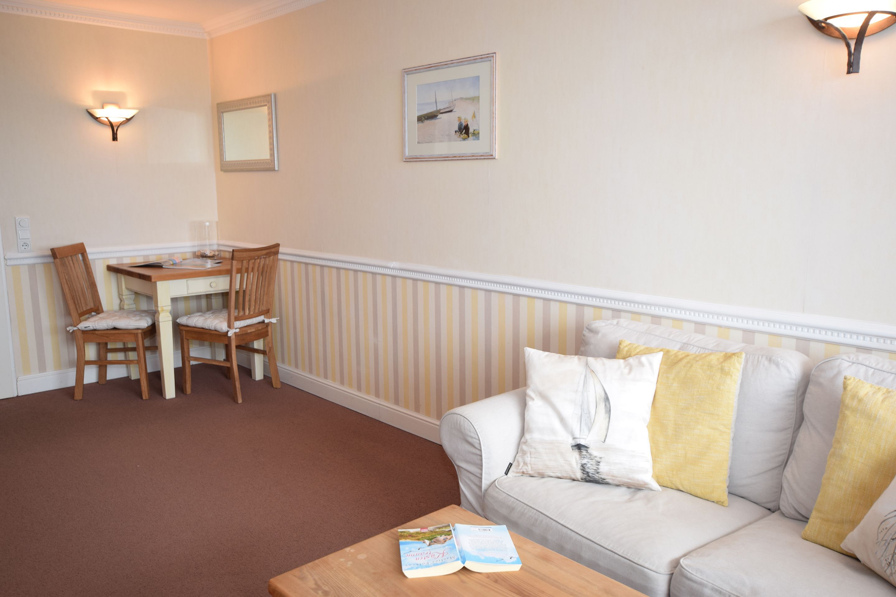 Der gemütliche Wohn-/Schlafraum besteht aus einem 2-Sitzer-Sofa, einem Sessel, einem Essplatz, einem Doppelschrankbett (einzeln klappbar), Flachbild-TV. Die Küchenzeile hat ein Induktionskochfeld, einen Geschirrspüler, eine Mikrowelle und einen Kühlschrank. Kaffeemaschine, Wasserkocher und Toaster gehören zur Grundausstattung.