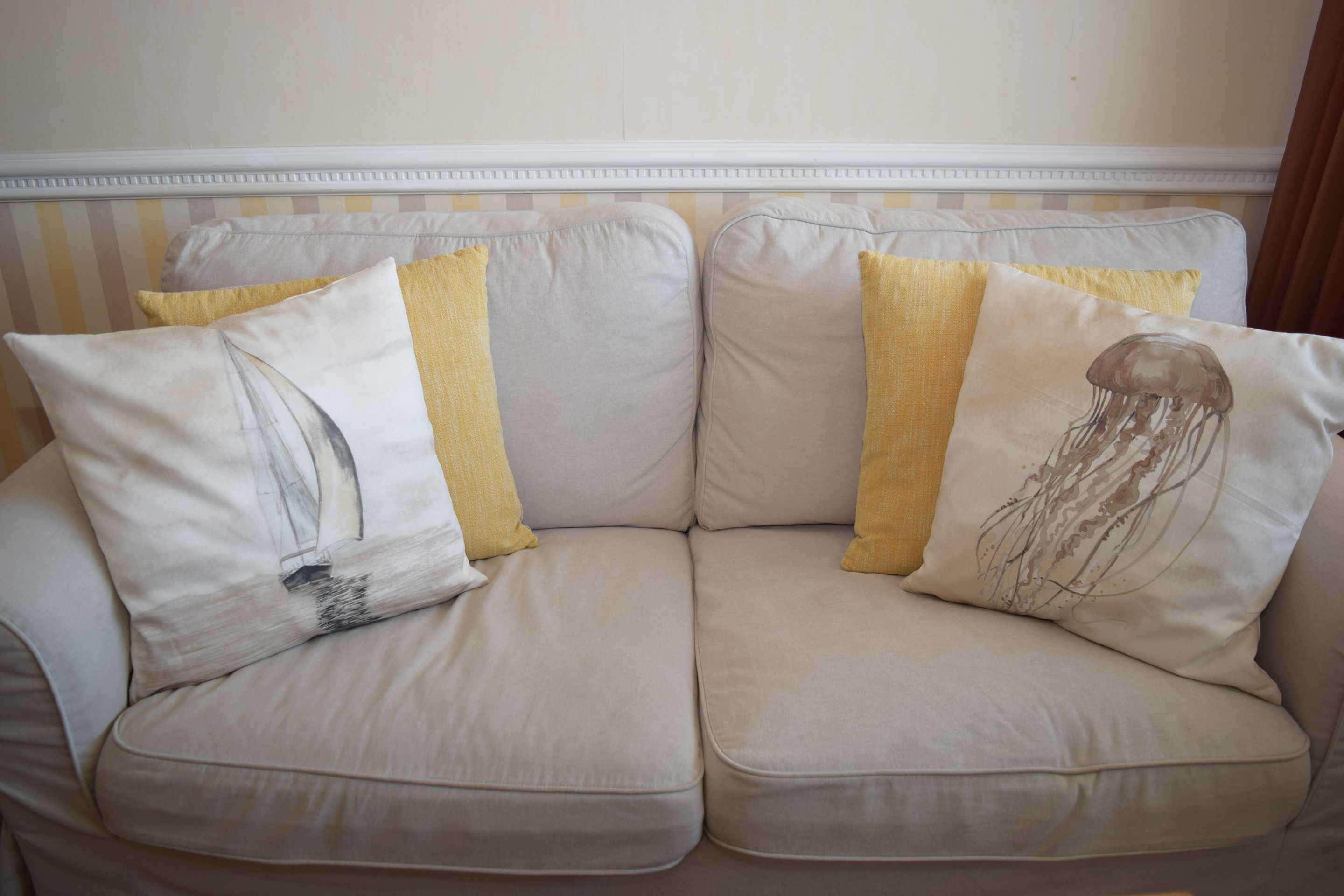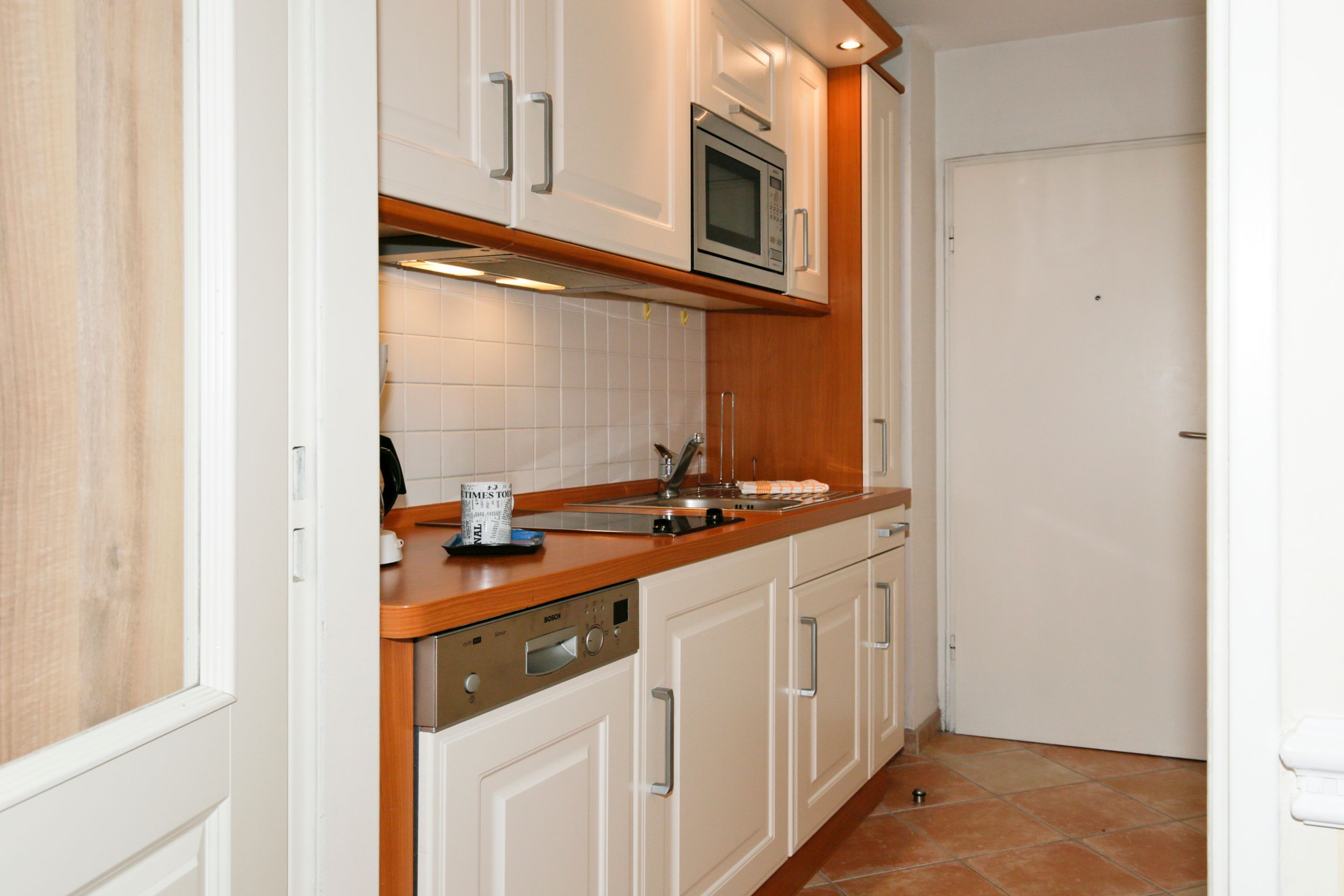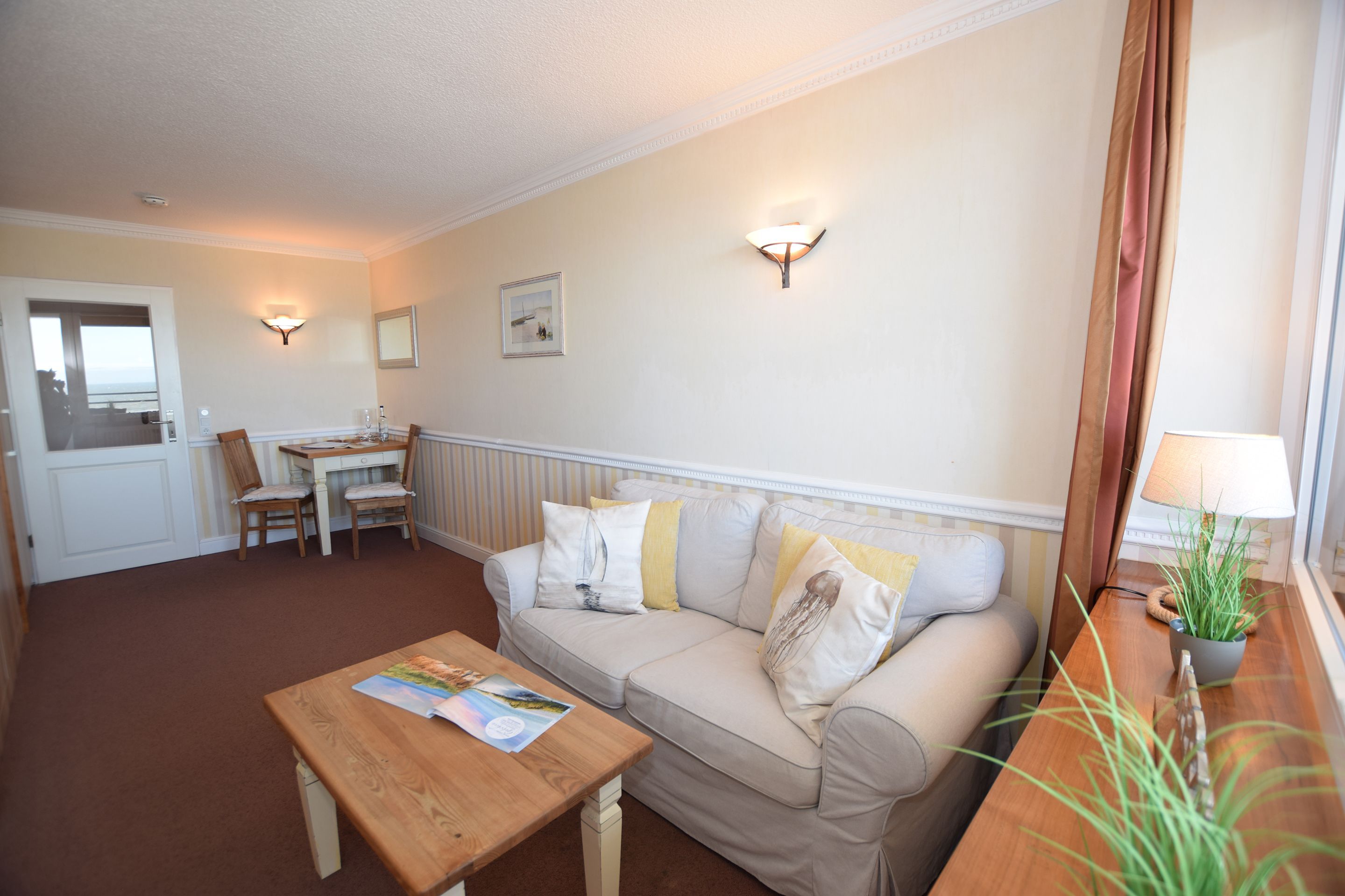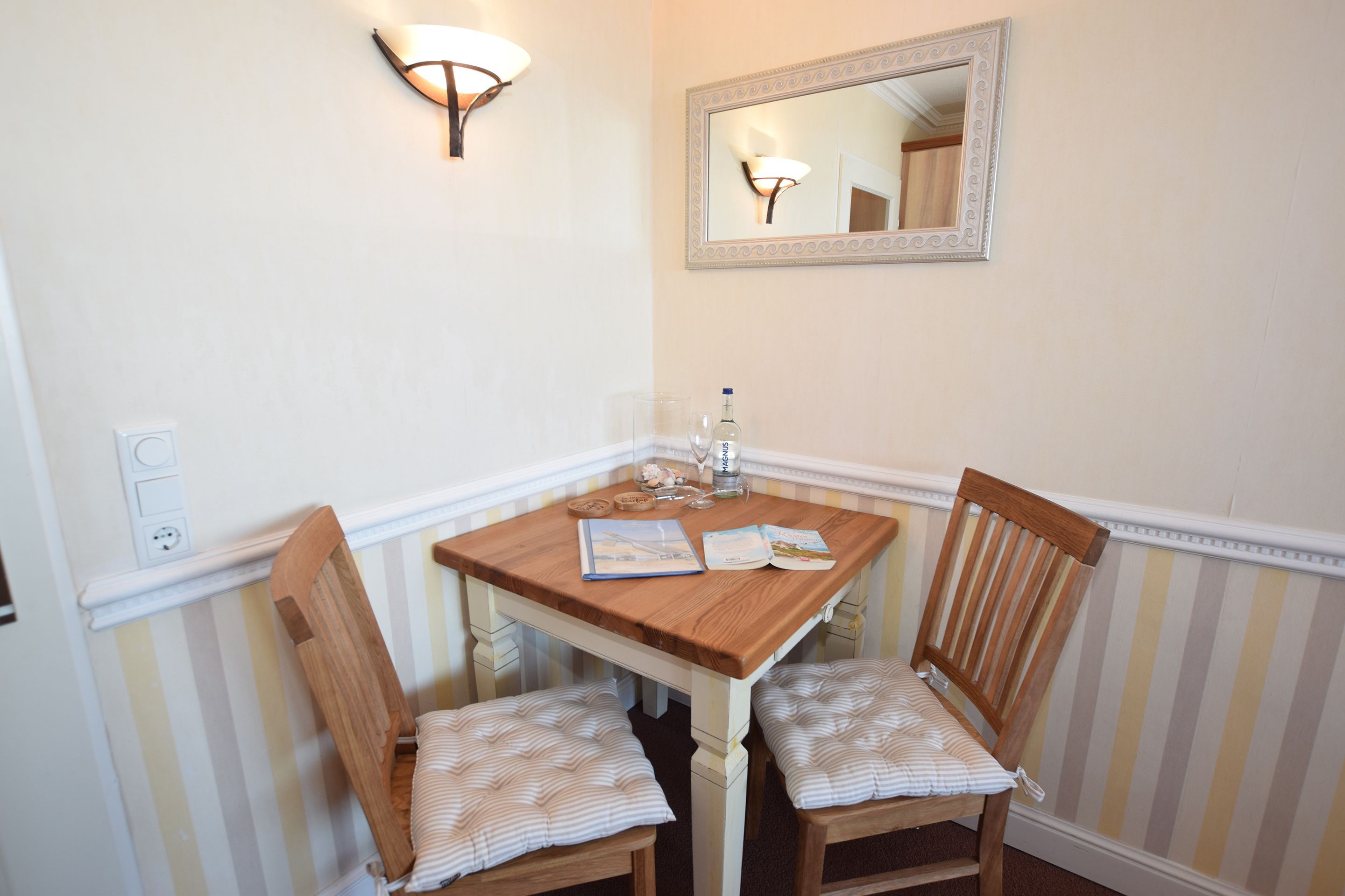 Der gemütliche Wohn-/Schlafraum besteht aus einem 2-Sitzer-Sofa, einem Sessel, einem Essplatz, einem Doppelschrankbett (einzeln klappbar), Flachbild-TV. Die Küchenzeile hat ein Induktionskochfeld, einen Geschirrspüler, eine Mikrowelle und einen Kühlschrank. Kaffeemaschine, Wasserkocher und Toaster gehören zur Grundausstattung.