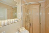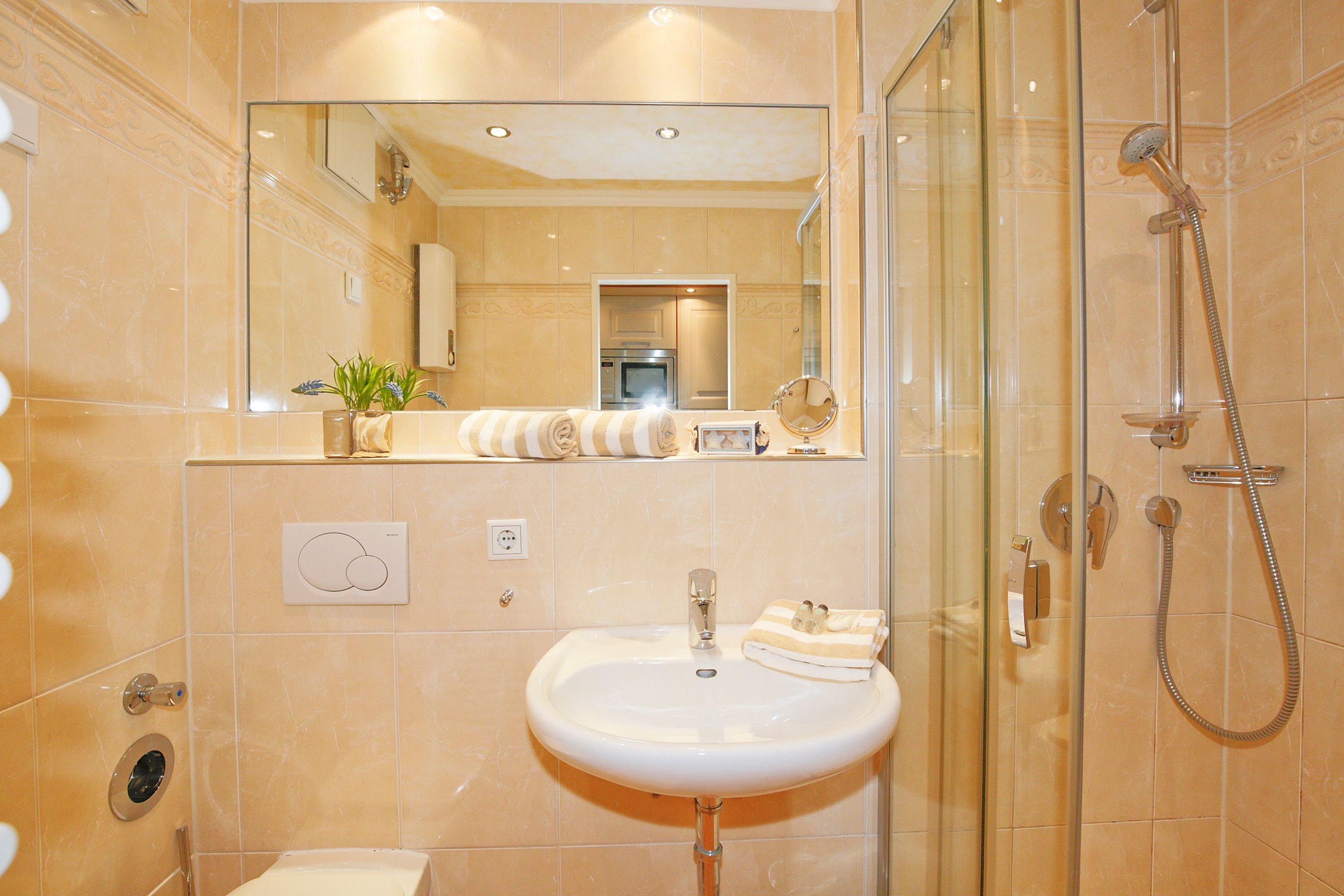 Im Bad befinden sich eine Dusche, ein WC, ein Waschtisch und ein Fön.