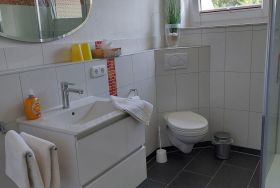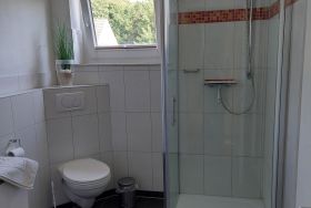 Das großzügige Duschbad ist hell und freundlich gestaltet.