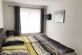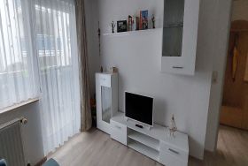 Schlafcouch ( 1,60 x 2,00 m ), Couchtisch, Flachbild- TV, Schrank, Eßbereich mit 3 Stühlen