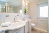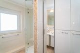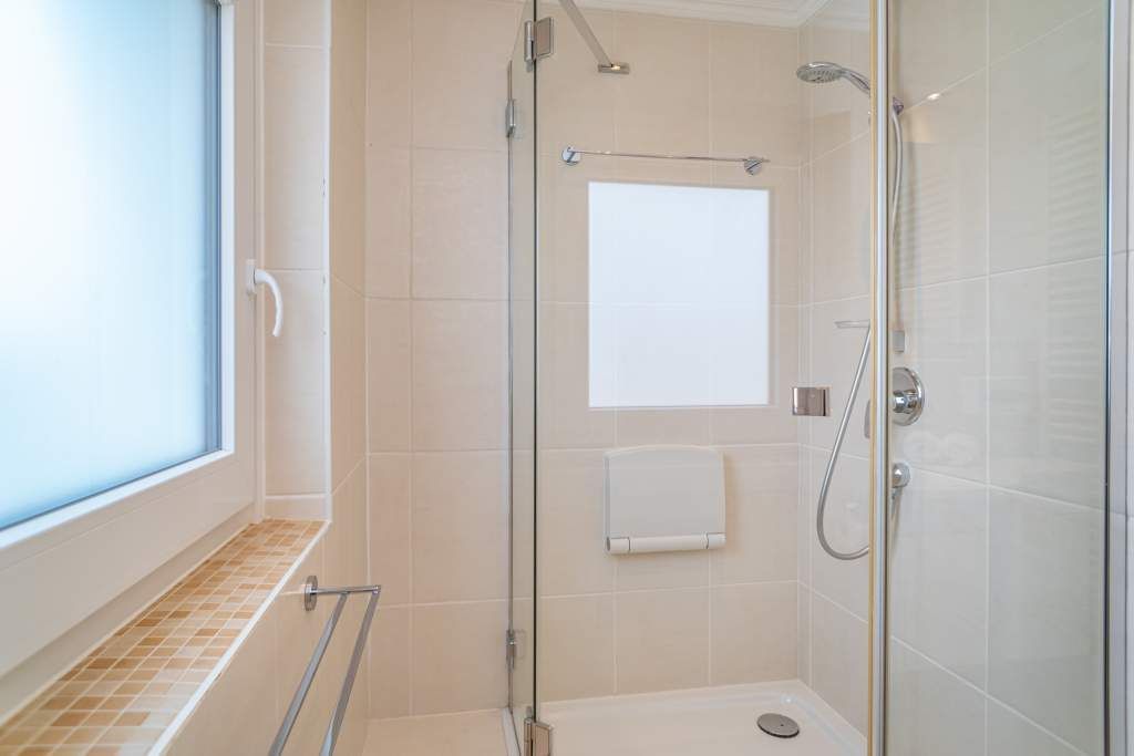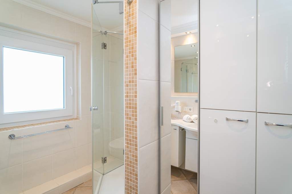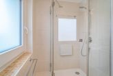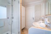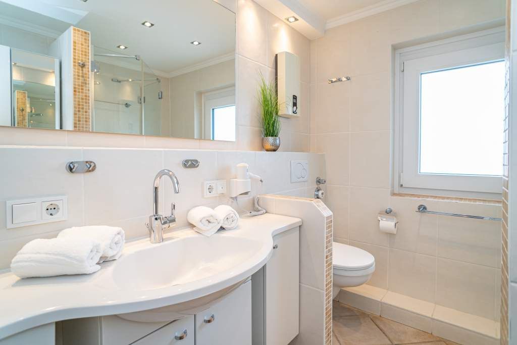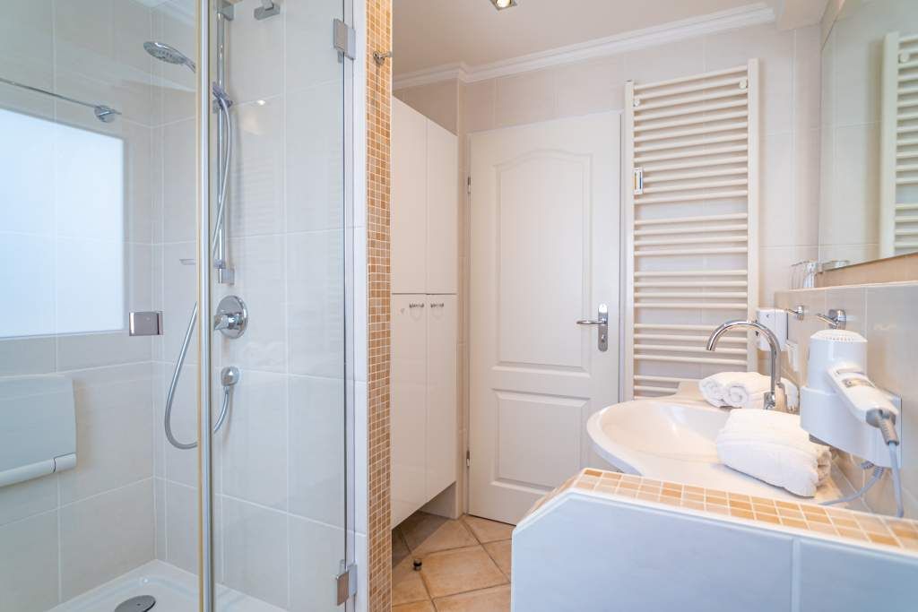 Das Badezimmer ist mit geräumiger Dusche, Waschtisch, Handtuchtrockner, Fön und Fenster ausgestattet.