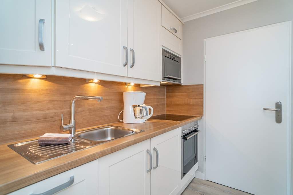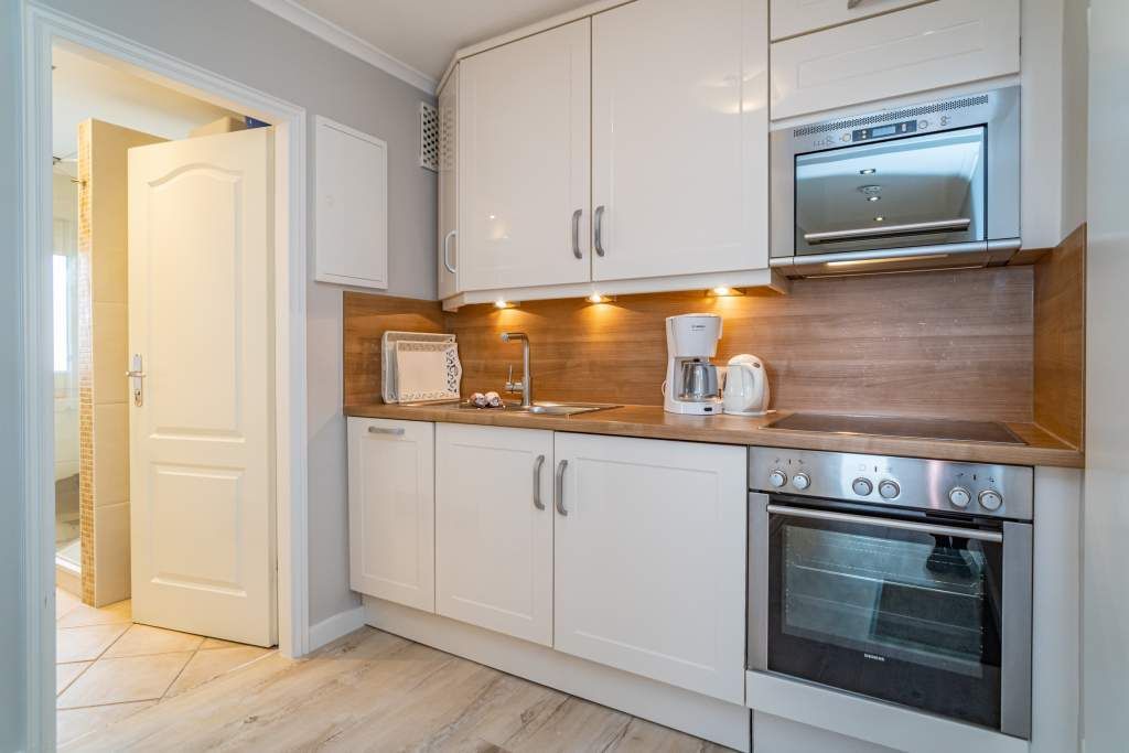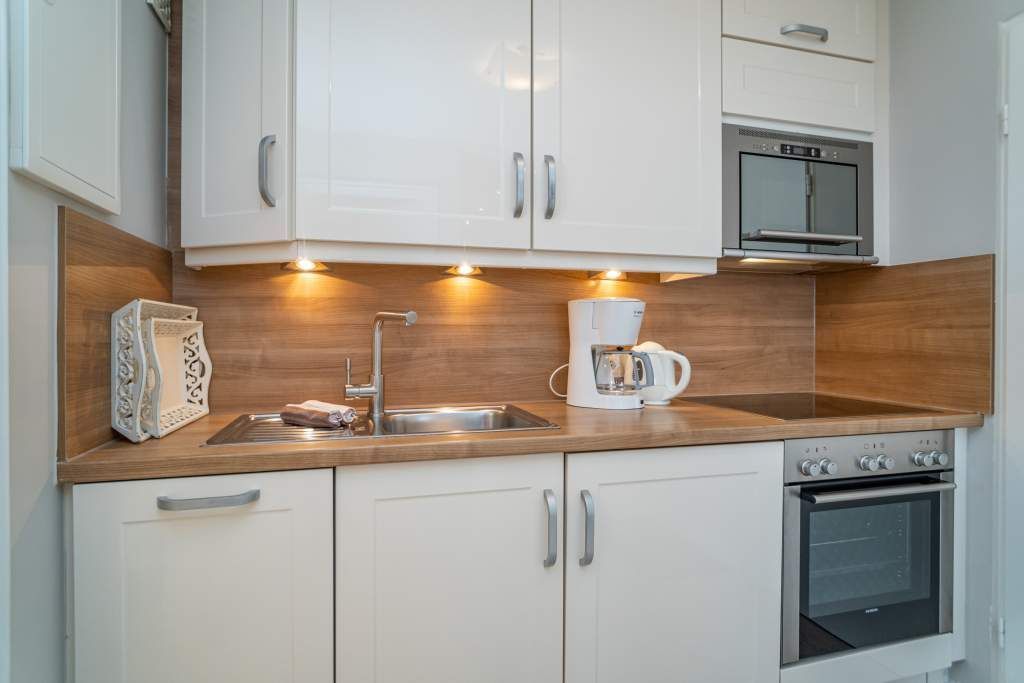 Die Küchenzeile hat einen Geschirrspüler, eine Mikrowelle, eine Nespresso-Maschine, einen Herd mit Backofen und Ceranfeld. Kaffeemaschine, Wasserkocher und Toaster gehören zur Grundausstattung.