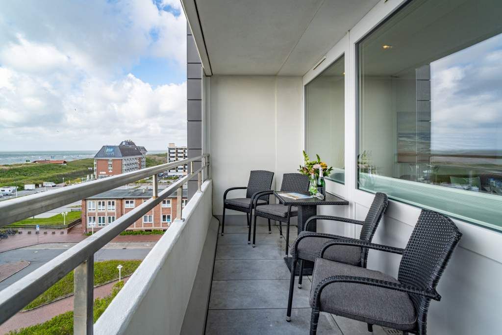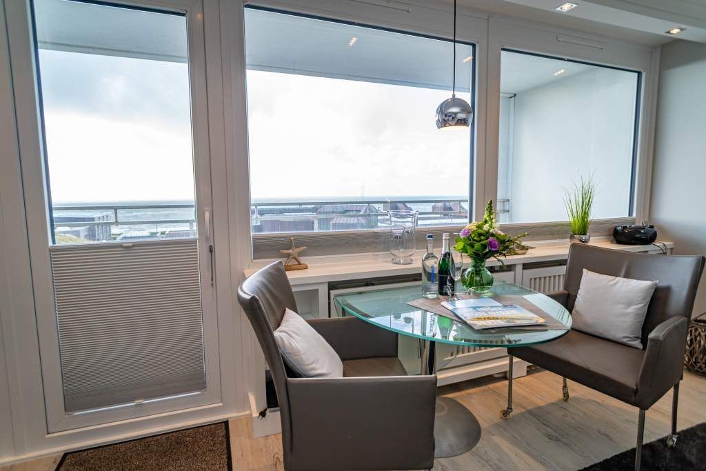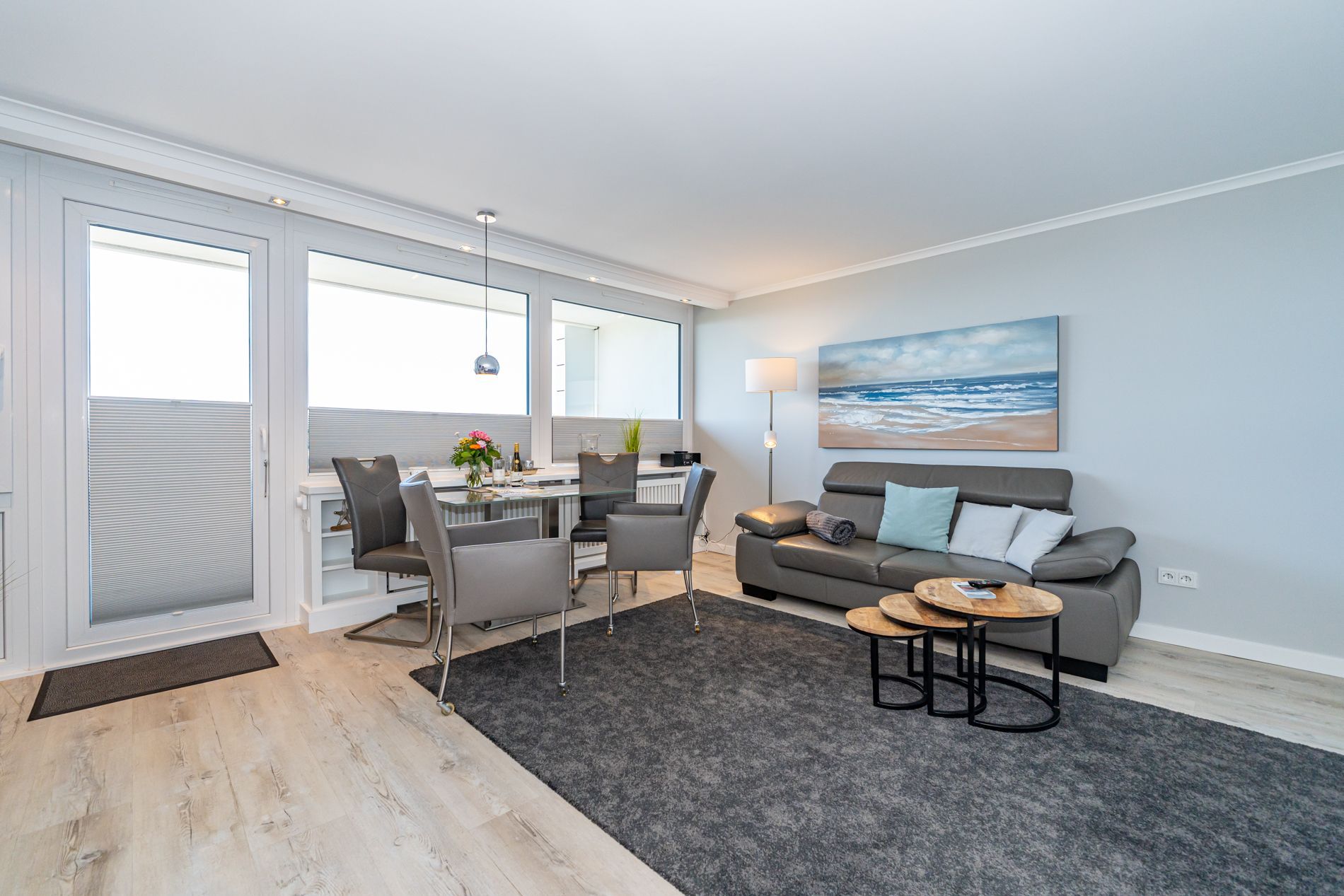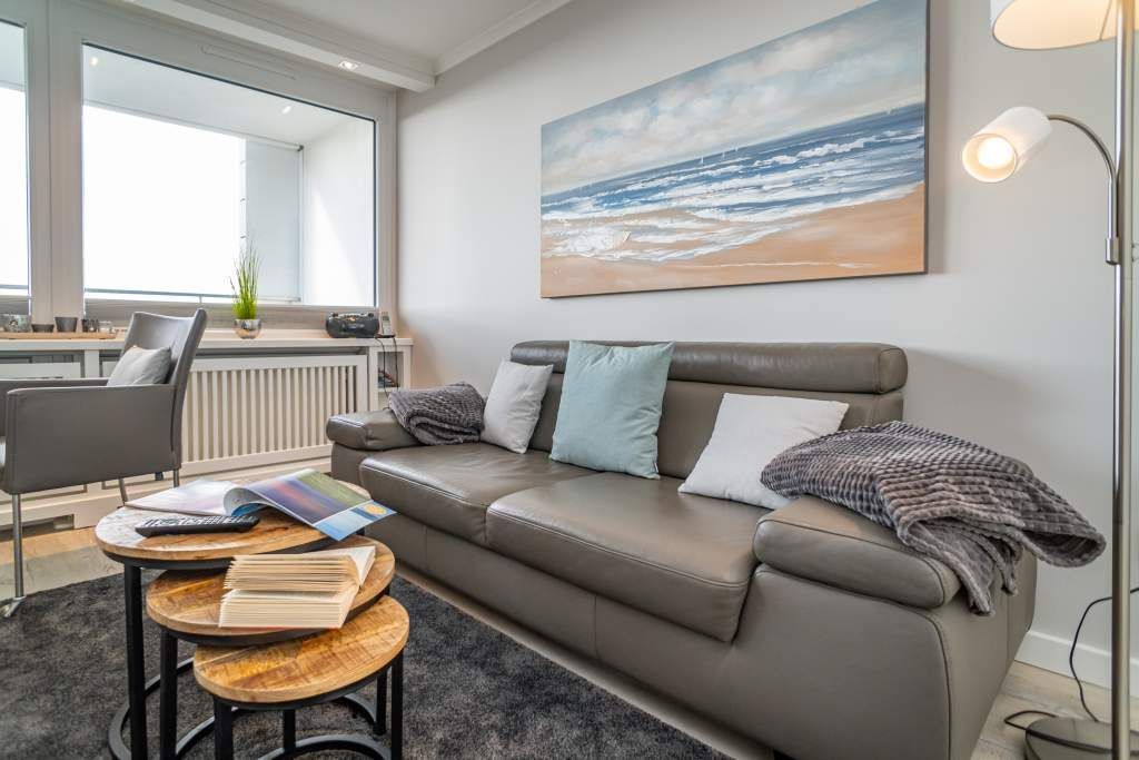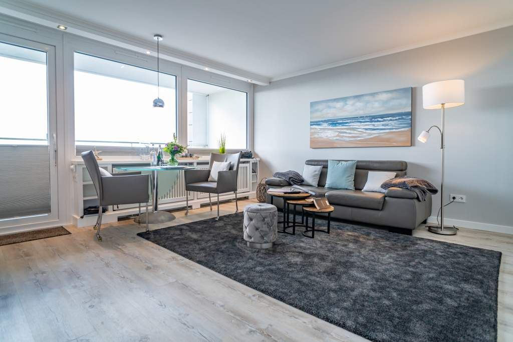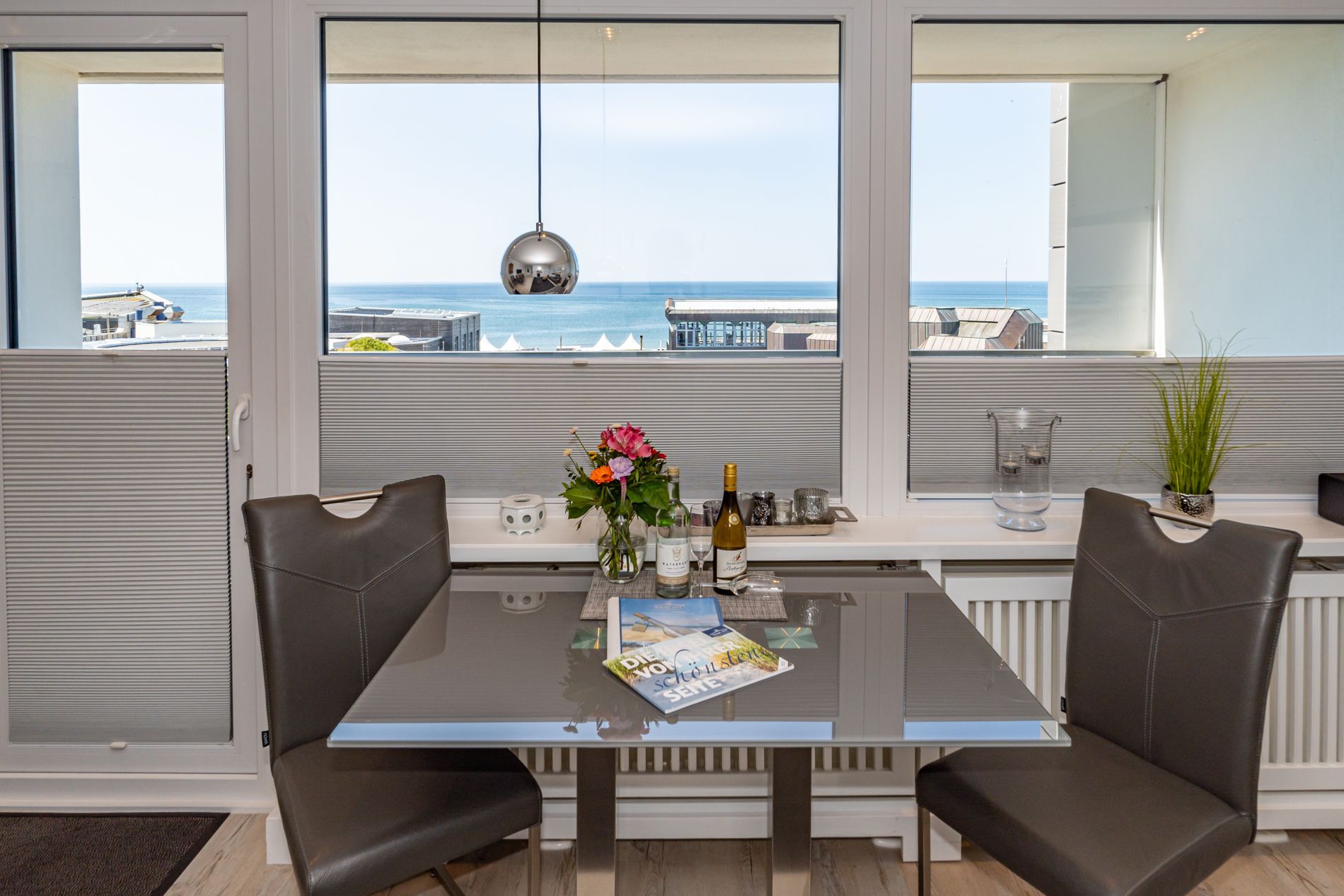 Gut eingerichtete, komplett mit Fliesen und Venyl-Laminat ausgestattete 2-Zimmer-Nichtraucher-Ferienwohnung, ca. 51 qm, in der 5. Etage zur Seeseite mit herrlichem Meerblick und Westloggia (Nachmittags- und Abendsonne mit Balkonmöbeln und Auflagen) für max. 4 Personen.