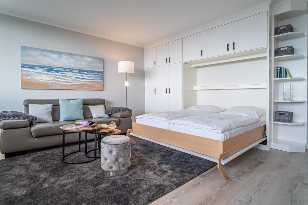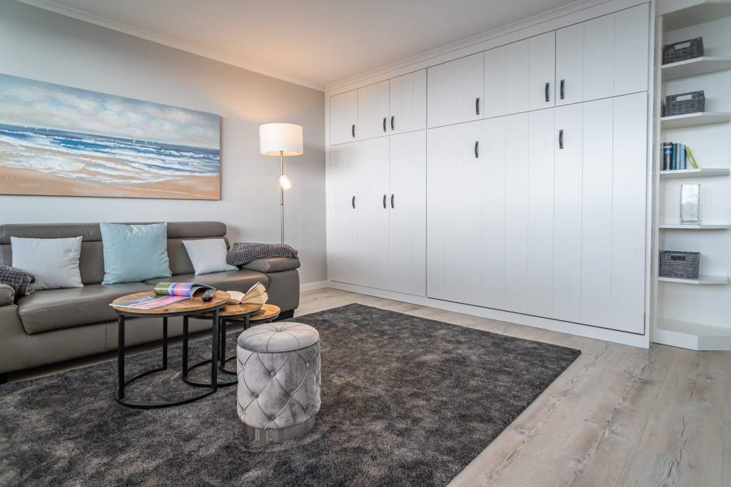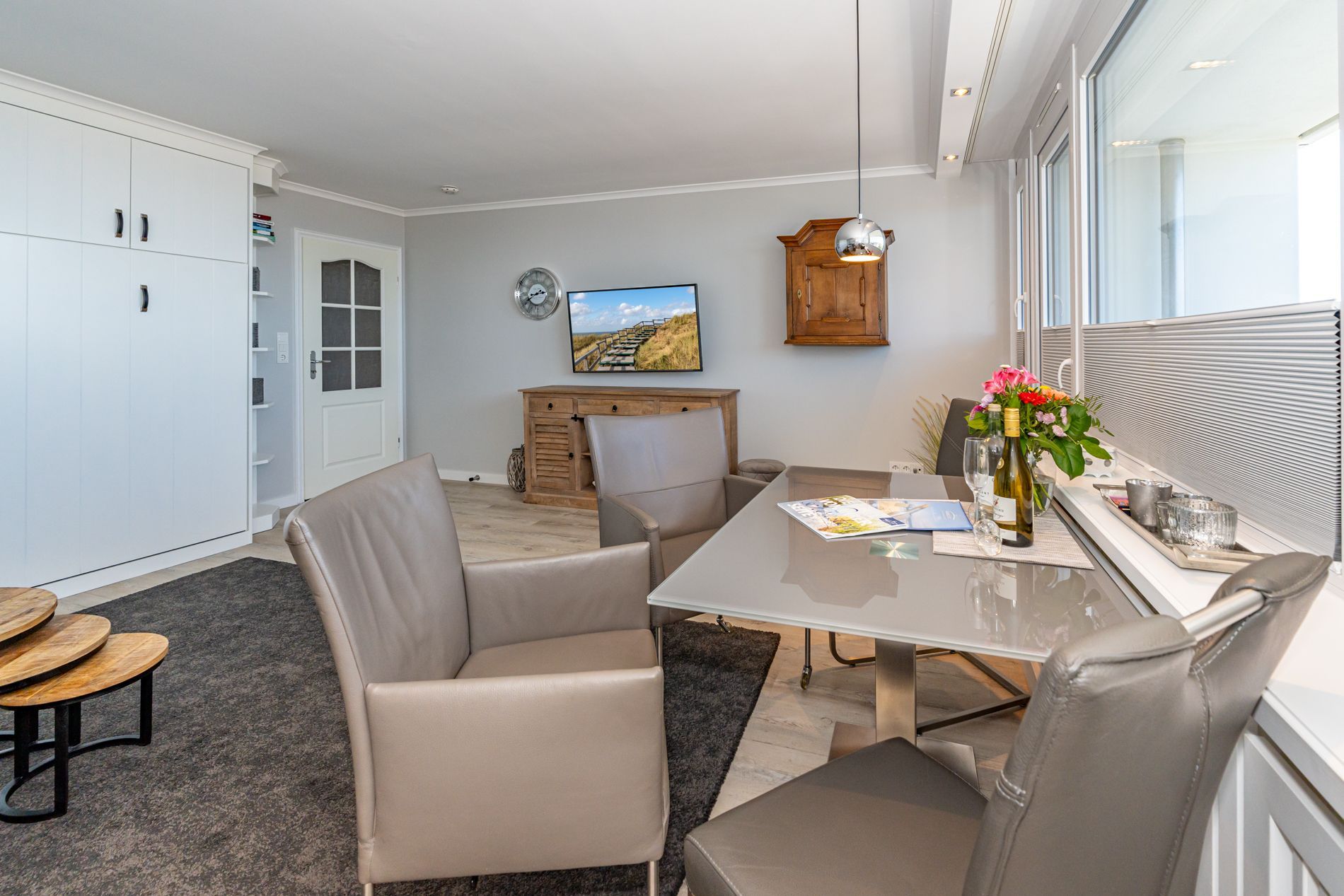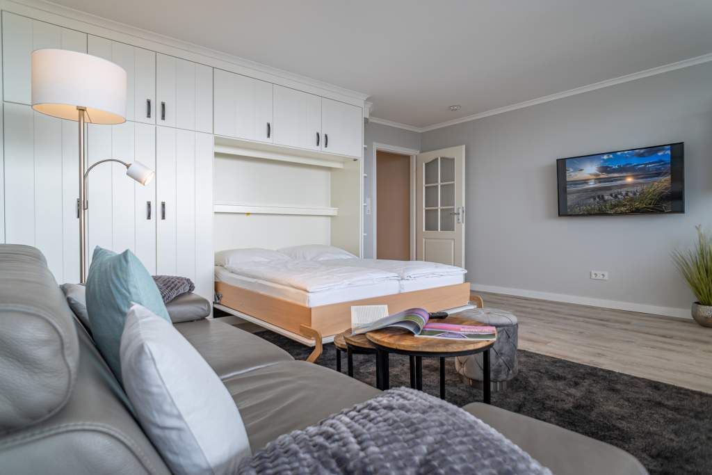 Der Wohnraum besteht aus einer Sitzgarnitur (mit 2-Sitzer-Couch und 2 Sesseln), einem Essplatz, einem Doppel-Wandschrankbett und einem großen Kabel-Flachbild-TV.