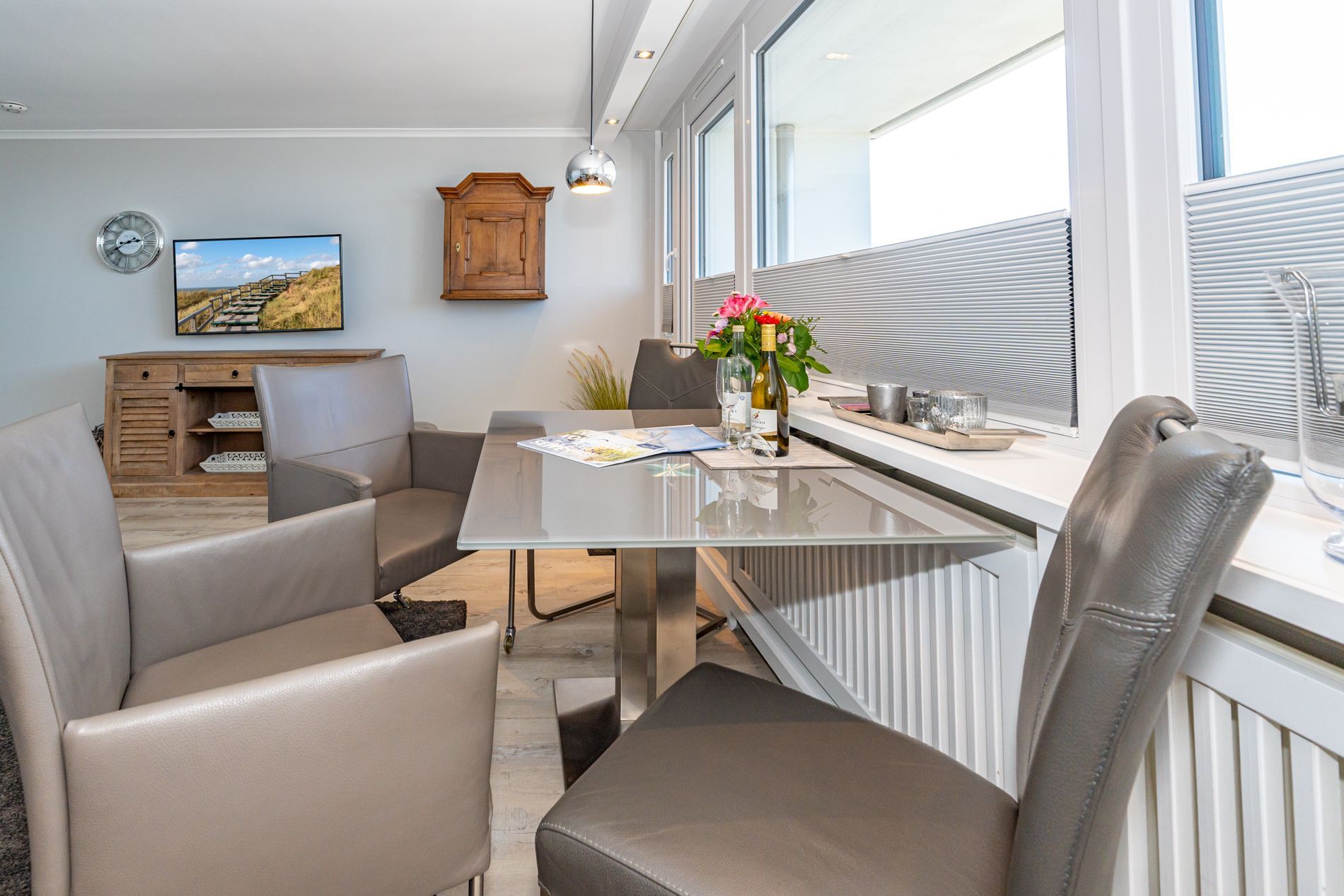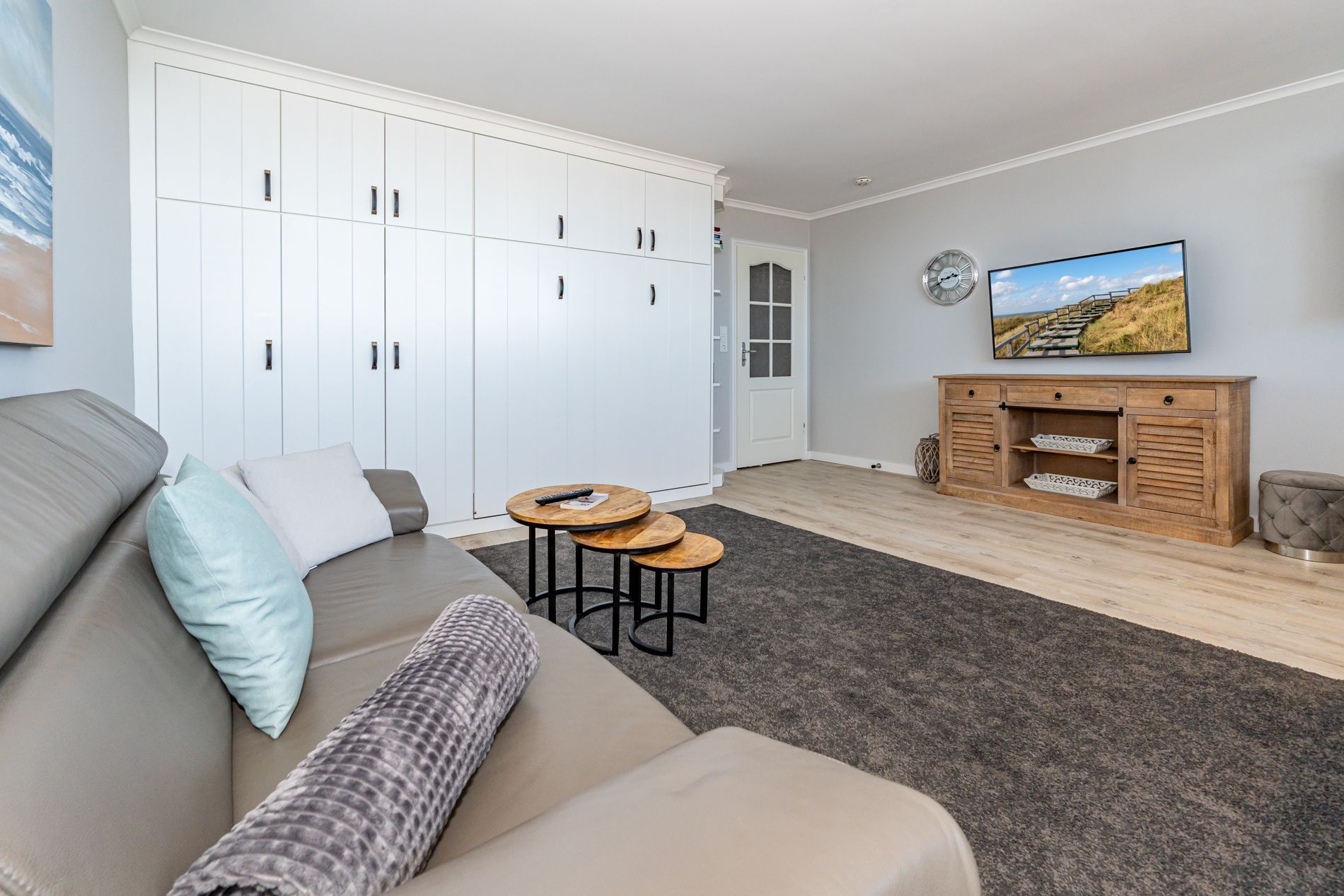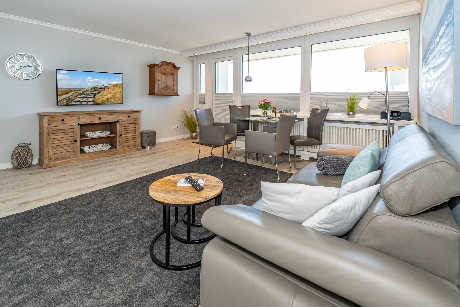 Der Wohnraum besteht aus einer Sitzgarnitur (mit 2-Sitzer-Couch und 2 Sesseln), einem Essplatz, einem Doppel-Wandschrankbett und einem großen Kabel-Flachbild-TV.