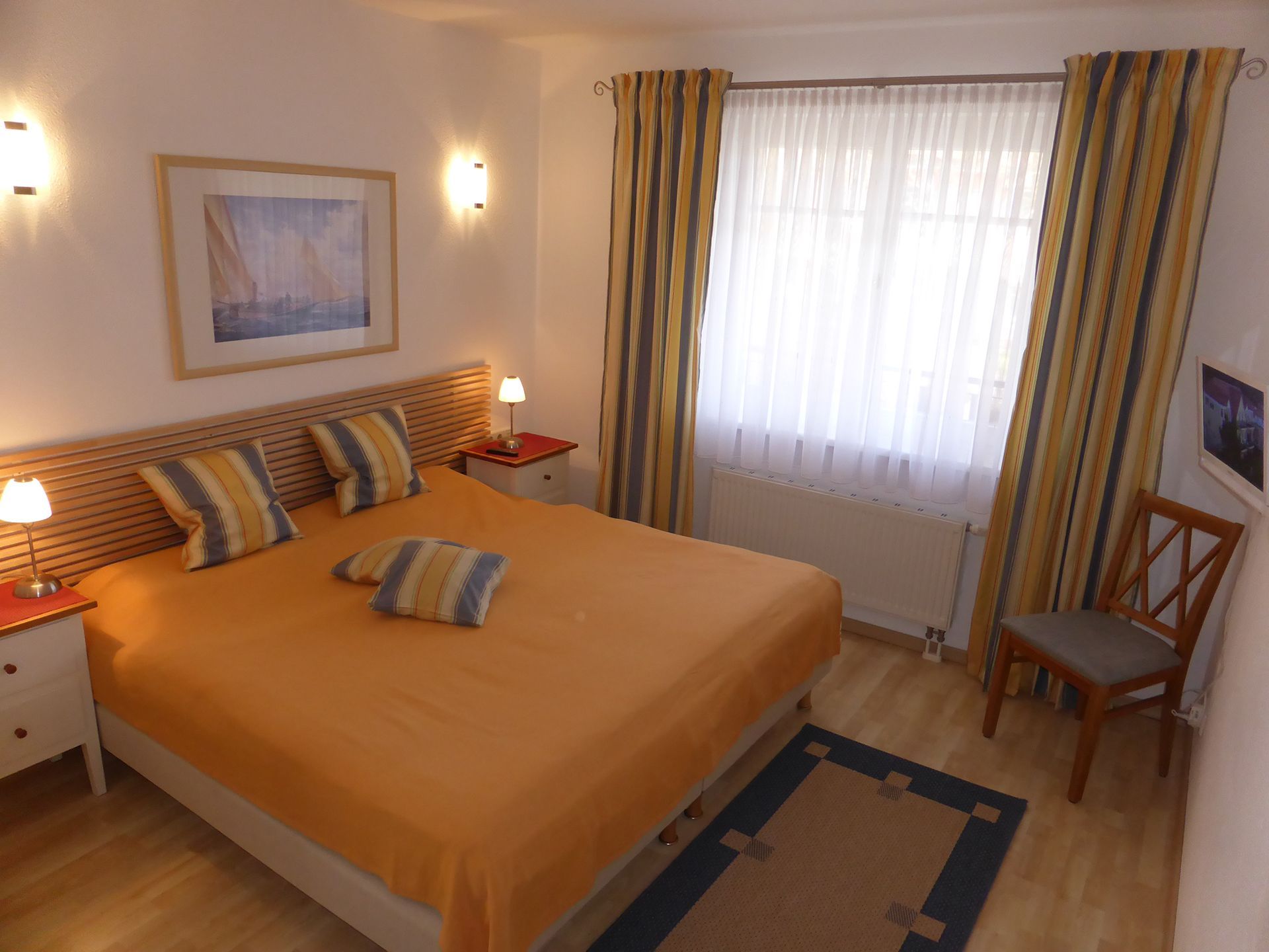 Im geräumigen Schlafzimmer befindet sich ein großes Doppelbett (2 x 2 m), ein großer Kleiderschrank und ein weiterer Fernseher.