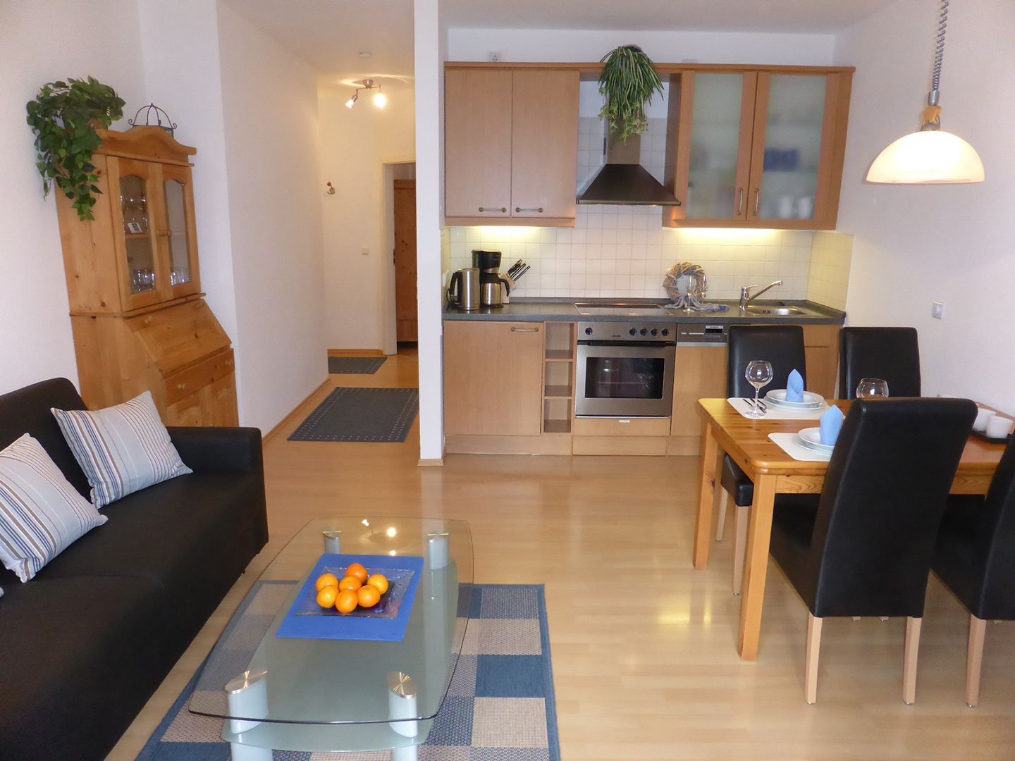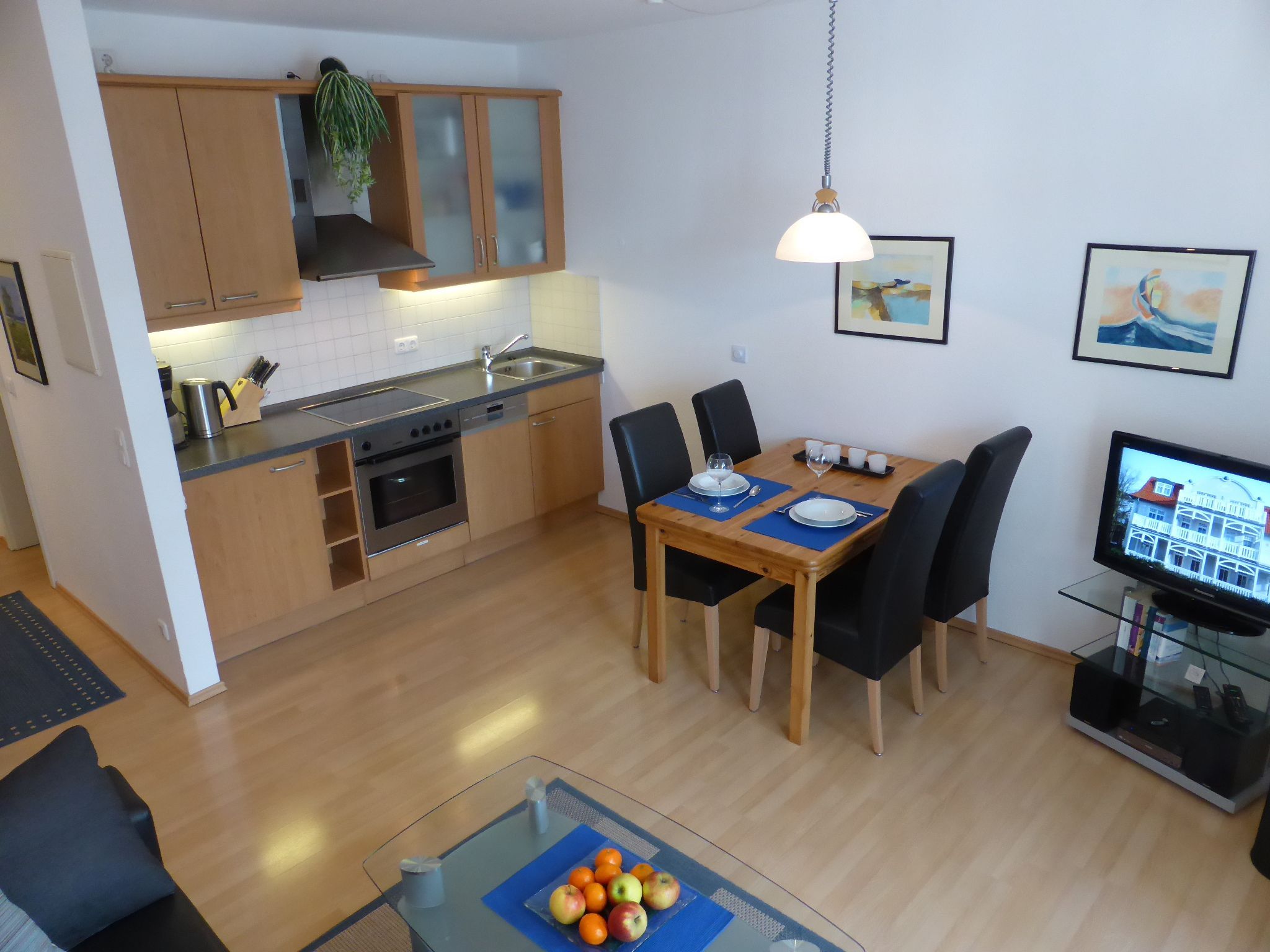 In die modern eingerichtete Küchenzeile, die in den Wohnbereich integriert ist, gehören ein Ceran-Kochfeld mit 4 Platten, ein Backofen und eine Geschirrspülmaschine. Zur Ausstattung gehören außerdem ein 40 LED-Fernseher, eine Hifi-Anlage mit Kabelanschluss, CD- und DVD-Player sowie ein USB-Anschluss für SDCards (MP3). Ein kostenloser W-LAN Anschluss steht ebenfalls zur Verfügung.