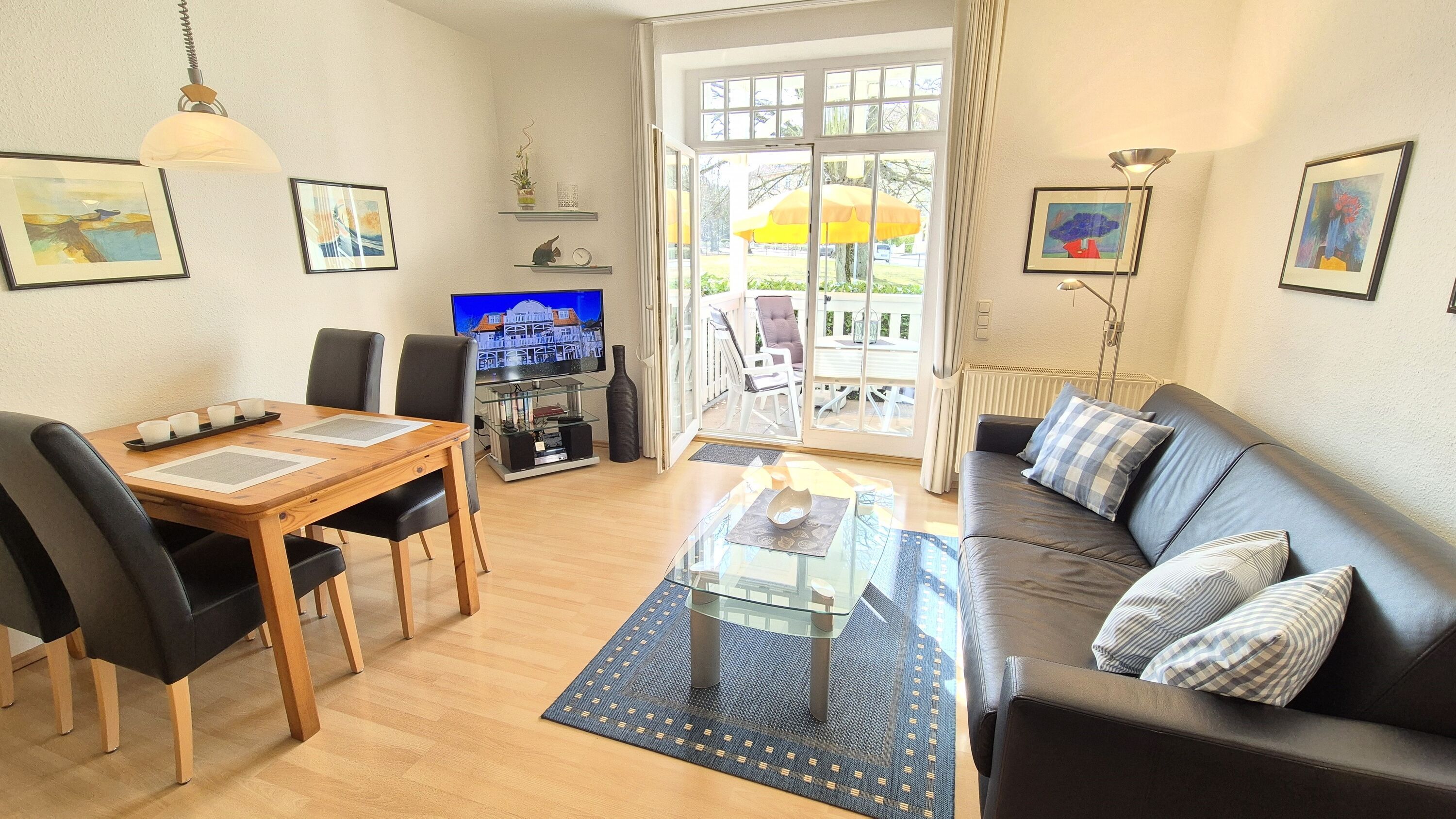 Der Wohnbereich ist mit einem gemütlichen Sitzbereich, bestehend aus einem großen Sofa, sowie einem Esstisch mit 4 Stühlen ausgestattet. Bei Bedarf kann das Sofa zu einer Doppelschlafcouch umgebaut werden.