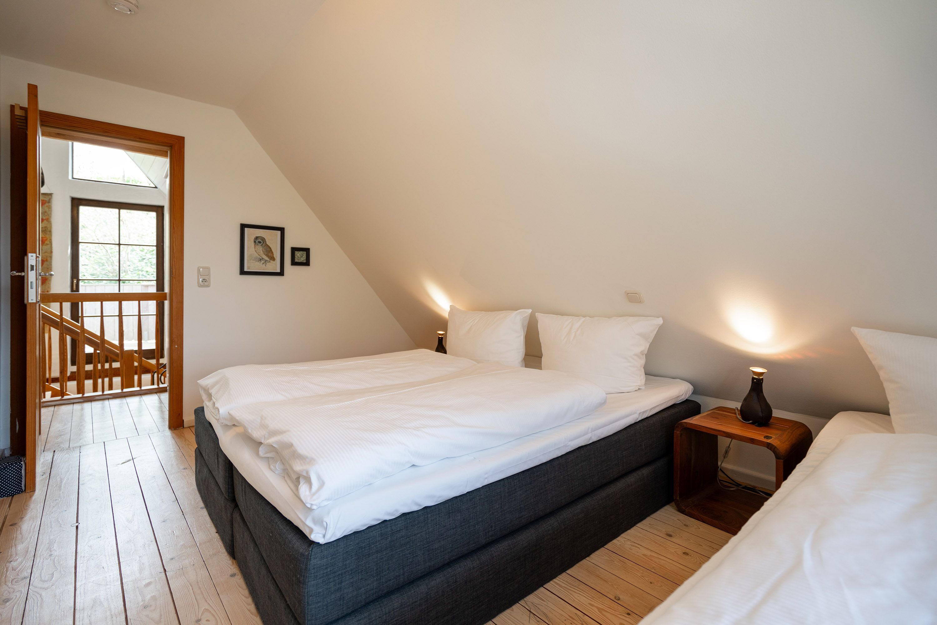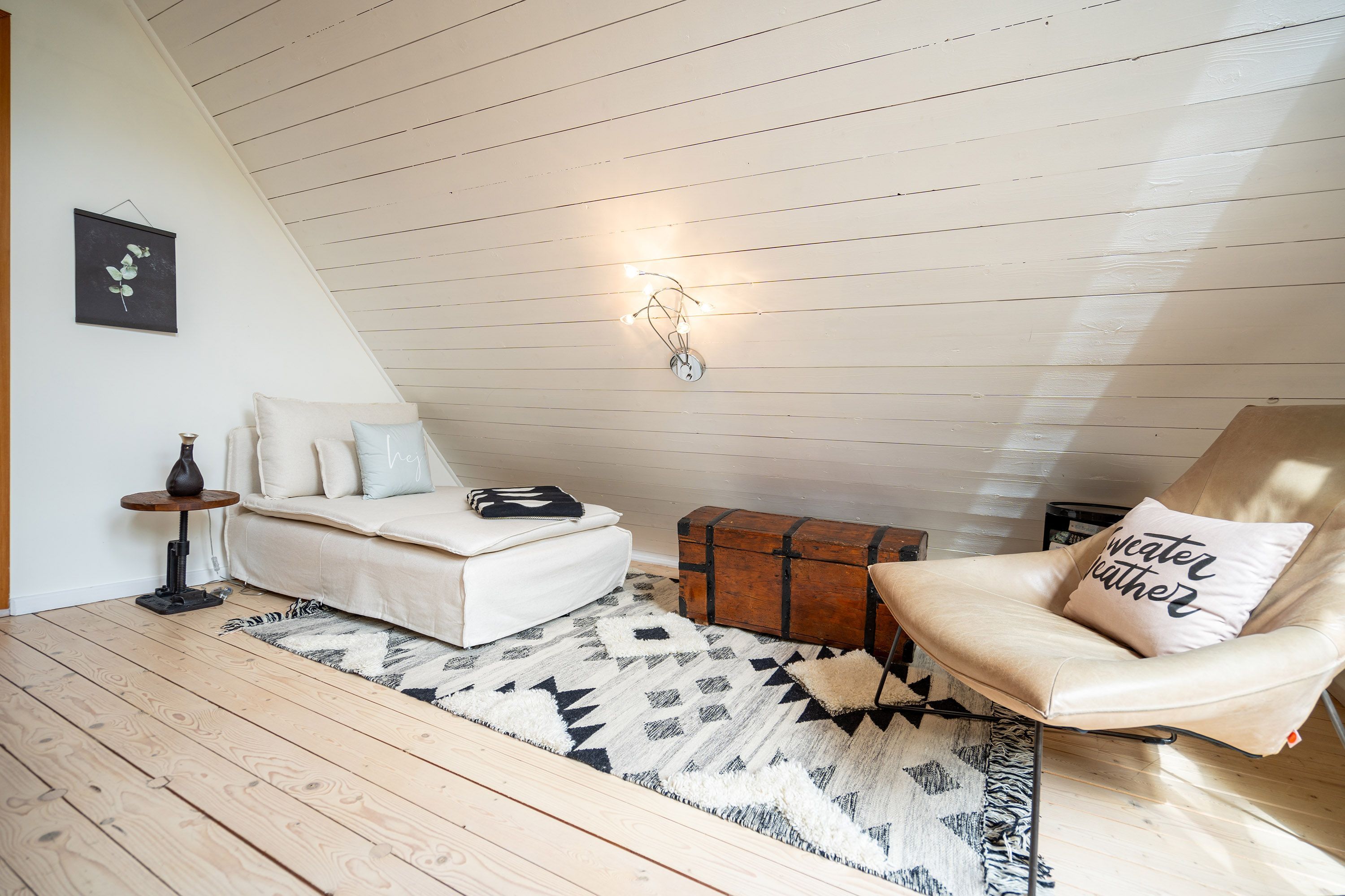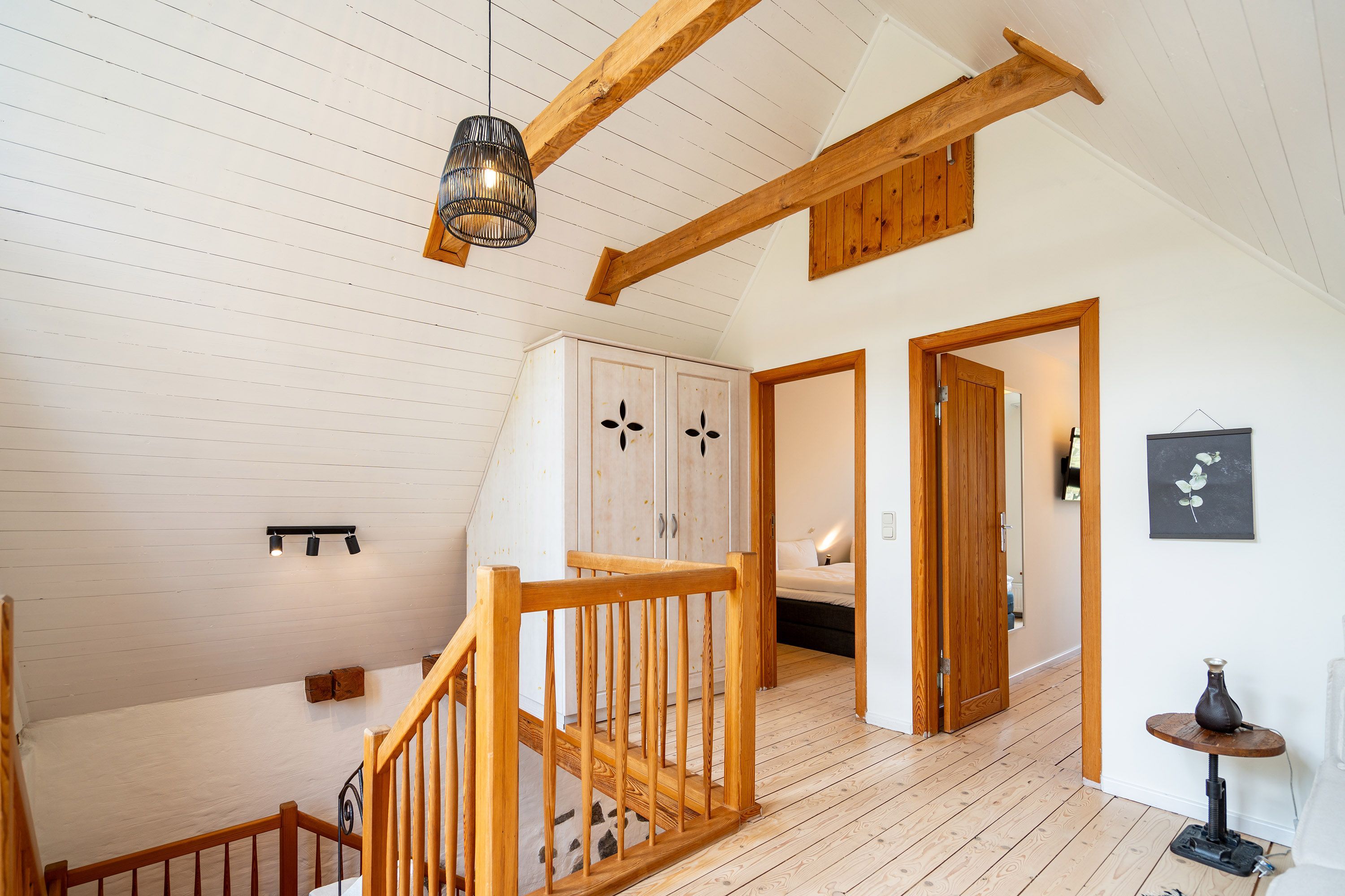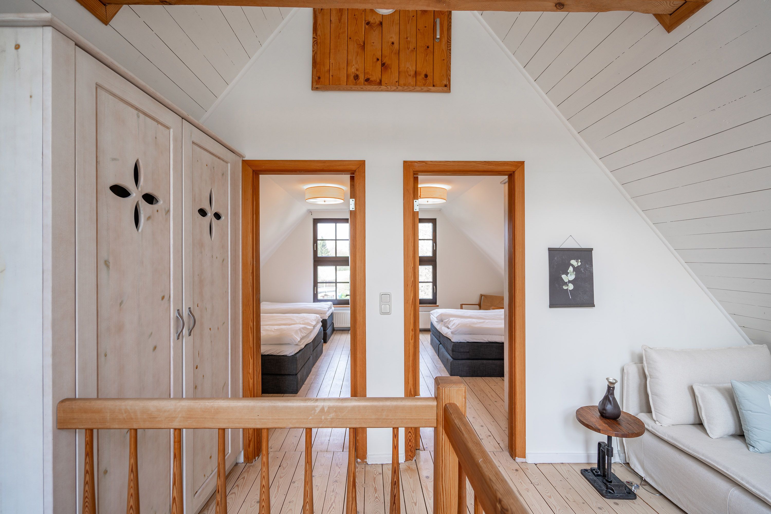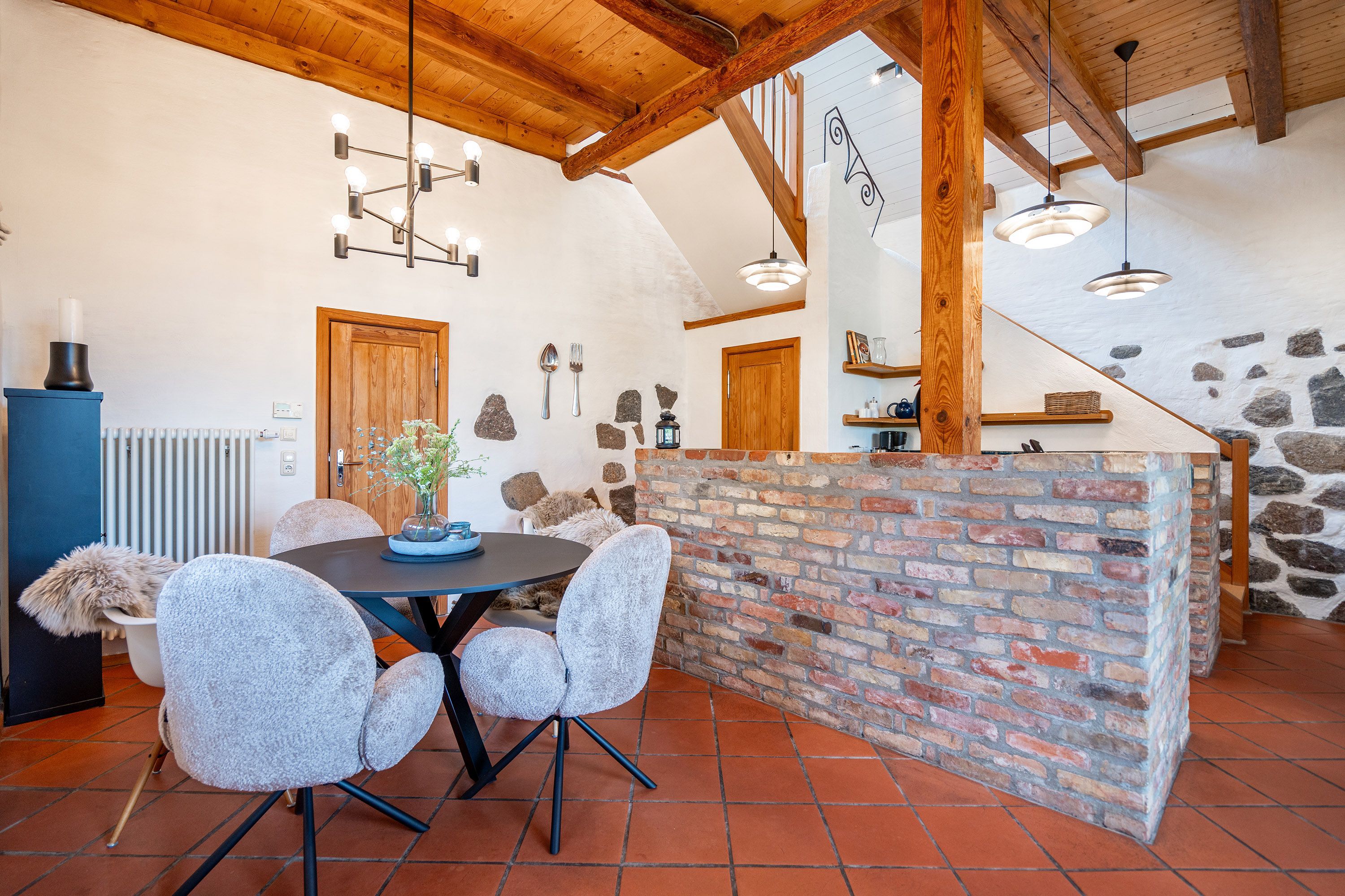 Das großzügige, helle Erdgeschoss ist in Wohnbereich, offene Küche, Bad und Sauna unterteilt. Überall lassen sich hier die alten Feldsteine der ehemaligen Scheune entdecken. Vor dem kuschligen Kamin macht man es sich auf dem Sofa gemütlich. Die offene Küche ist mit allem Komfort ausgestattet, der angrenzende Essplatz sorgt sicher für gesellige Runden, nicht nur beim Essen. Durch einen schwenkbaren Smart-TV müssen Sie auch von hier nicht auf Ihr Lieblingsprogram verzichten. Nach dem Saunagang erfrischt man sich im Bad mit Badewanne. Im Obergeschoss erwarten Sie zwei gemütliche Schlafzimmer mit Boxspringbetten (1x 1,60m und 1x 1,60m + Einzelbett / zusätzlich Flat-TV) die einen erholsamen Schlaf garantieren. Auf der Galerie davor lädt ein gemütlicher Lese- und Spielbereich ein. Und Außen? Ein kleiner Garten, eine Terrasse und eine schöne Holzveranda bieten für jeden Gast einen Rückzugsort zum Erholen im Freien. Auf Wunsch stellen wir für unsere kleinen Gäste ein Kinderreisebett (ohne zusätzliche Matratze & Bettzeug) und einen Kinderhochstuhl (gegen einen Aufpreis) zur Verfügung.