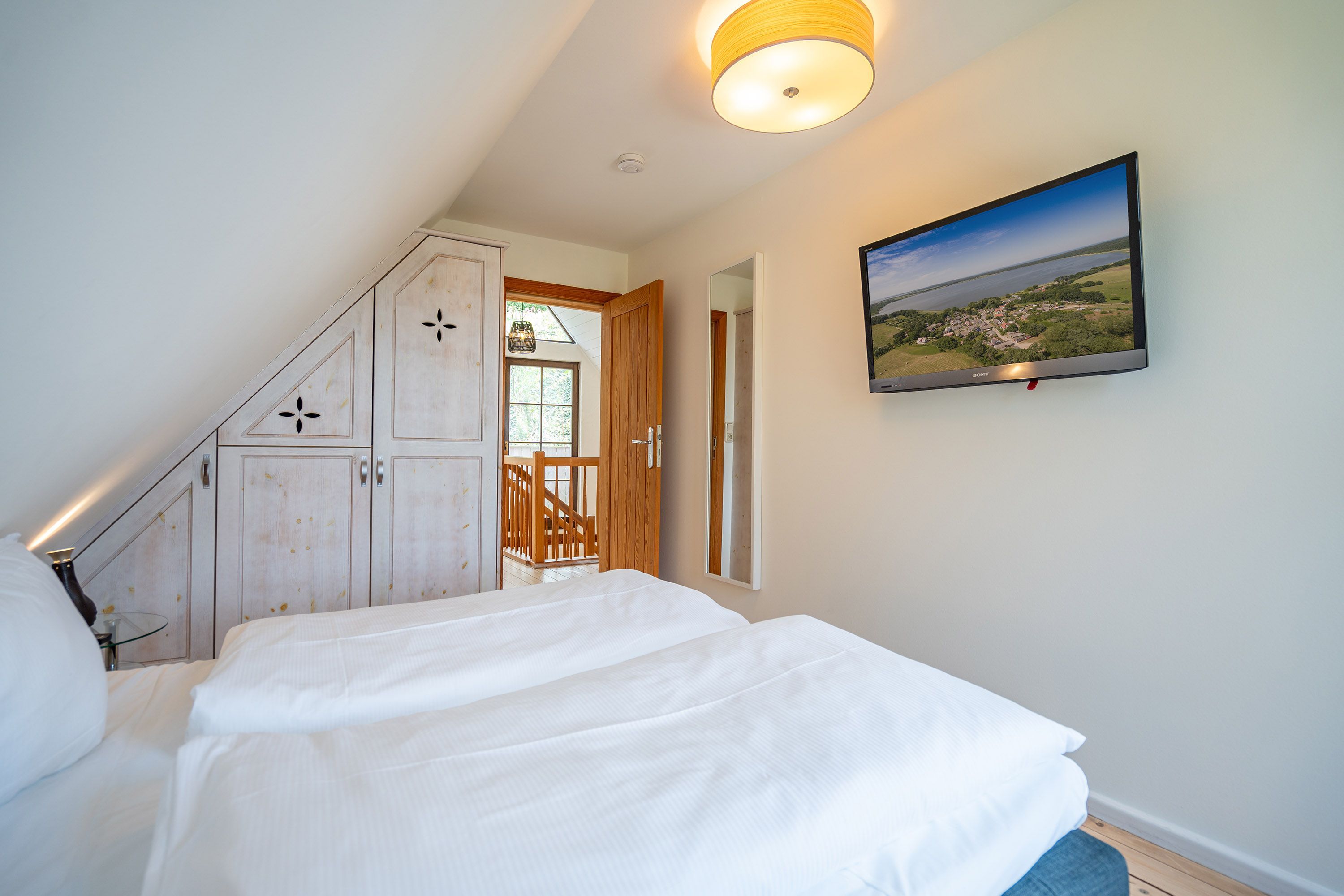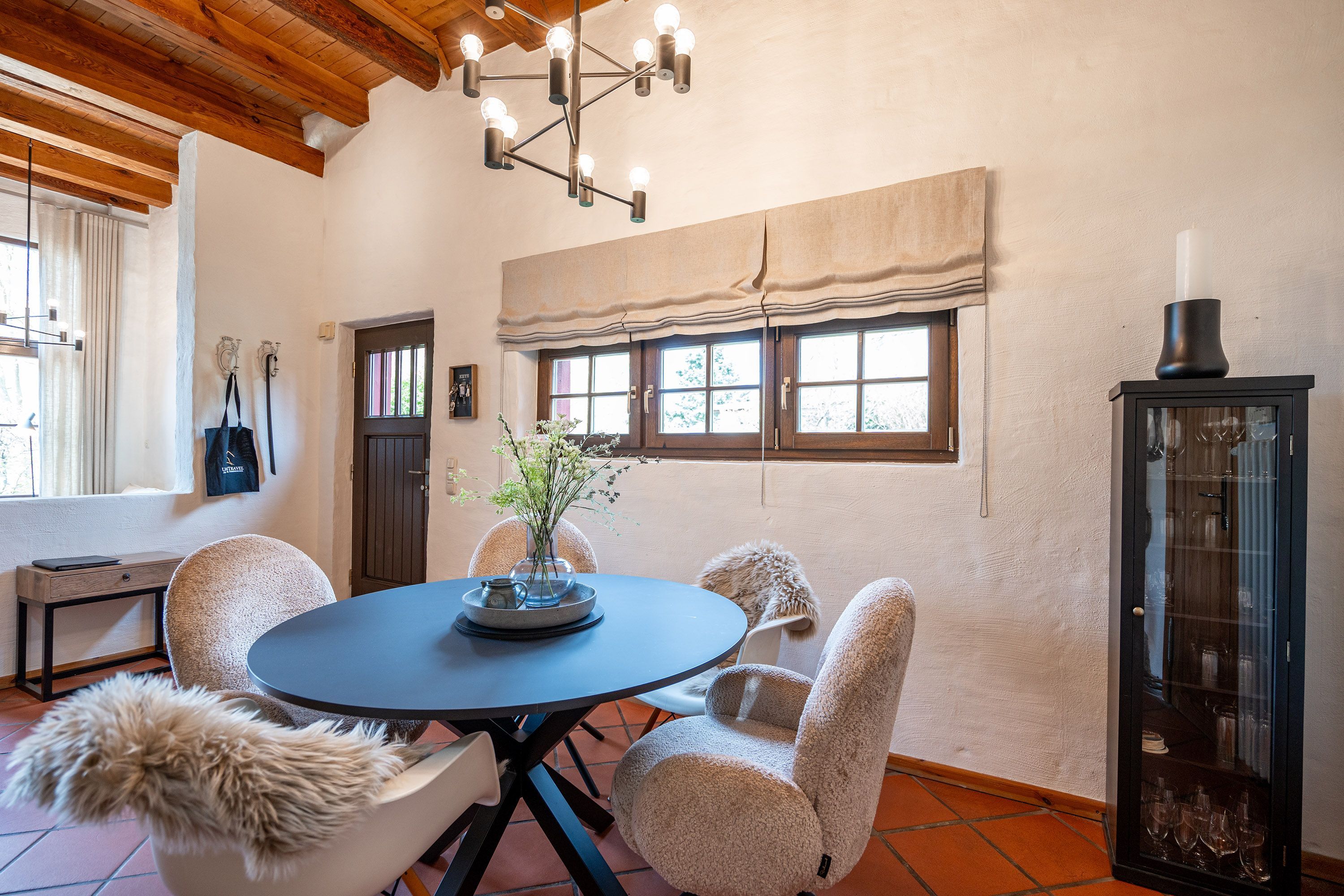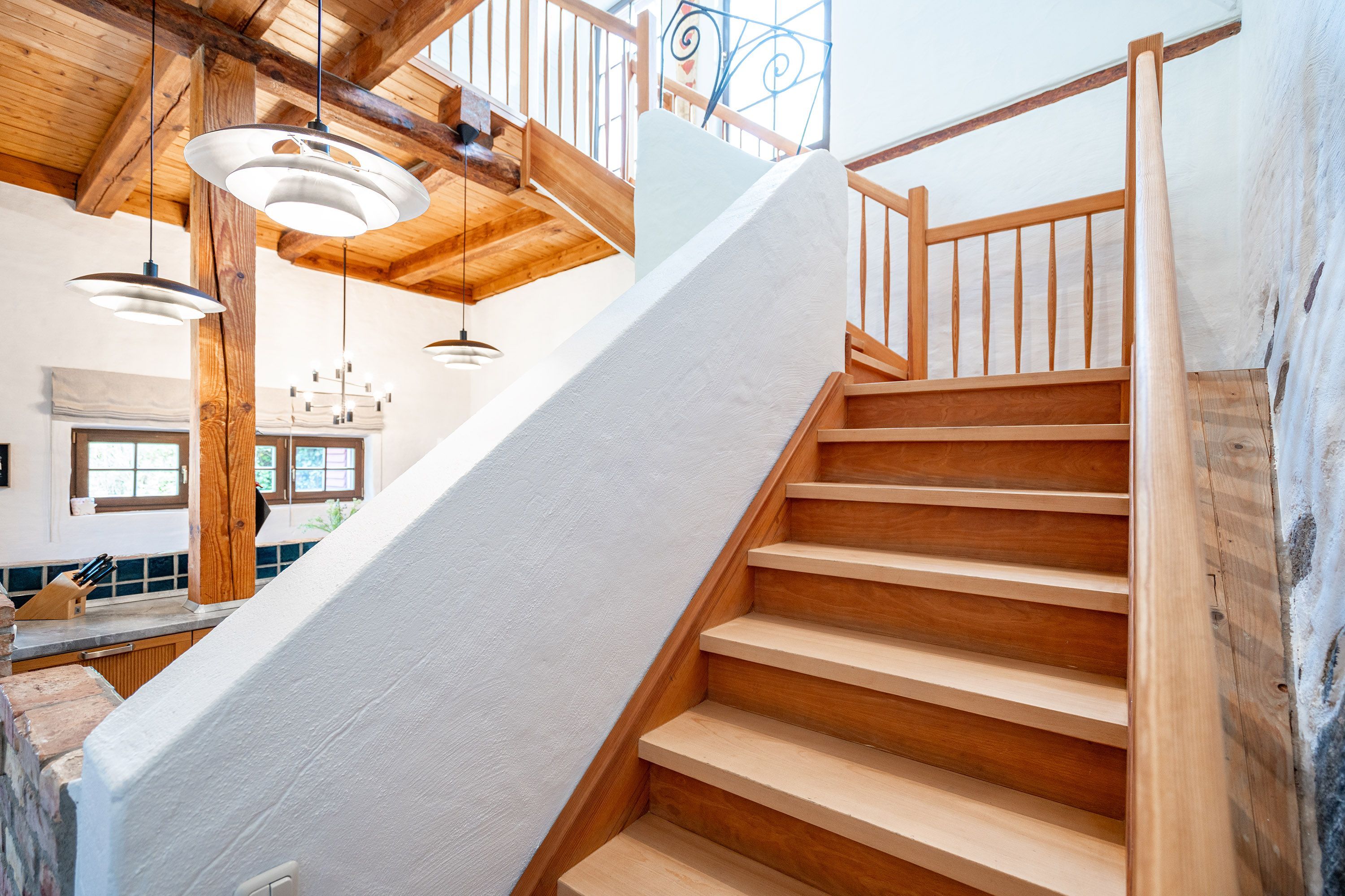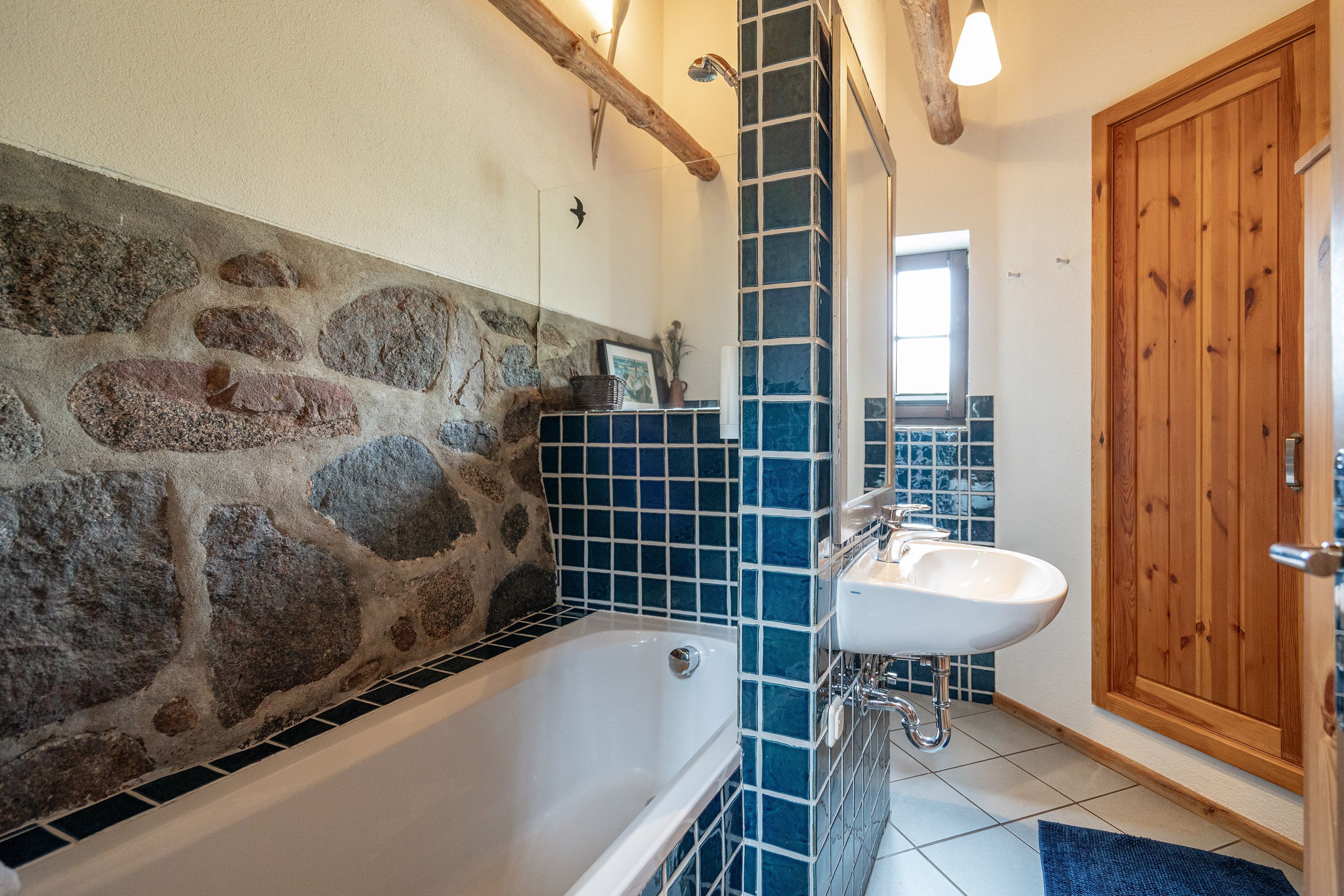 Das großzügige, helle Erdgeschoss ist in Wohnbereich, offene Küche, Bad und Sauna unterteilt. Überall lassen sich hier die alten Feldsteine der ehemaligen Scheune entdecken. Vor dem kuschligen Kamin macht man es sich auf dem Sofa gemütlich. Die offene Küche ist mit allem Komfort ausgestattet, der angrenzende Essplatz sorgt sicher für gesellige Runden, nicht nur beim Essen. Durch einen schwenkbaren Smart-TV müssen Sie auch von hier nicht auf Ihr Lieblingsprogram verzichten. Nach dem Saunagang erfrischt man sich im Bad mit Badewanne. Im Obergeschoss erwarten Sie zwei gemütliche Schlafzimmer mit Boxspringbetten (1x 1,60m und 1x 1,60m + Einzelbett / zusätzlich Flat-TV) die einen erholsamen Schlaf garantieren. Auf der Galerie davor lädt ein gemütlicher Lese- und Spielbereich ein. Und Außen? Ein kleiner Garten, eine Terrasse und eine schöne Holzveranda bieten für jeden Gast einen Rückzugsort zum Erholen im Freien. Auf Wunsch stellen wir für unsere kleinen Gäste ein Kinderreisebett (ohne zusätzliche Matratze & Bettzeug) und einen Kinderhochstuhl (gegen einen Aufpreis) zur Verfügung.