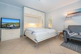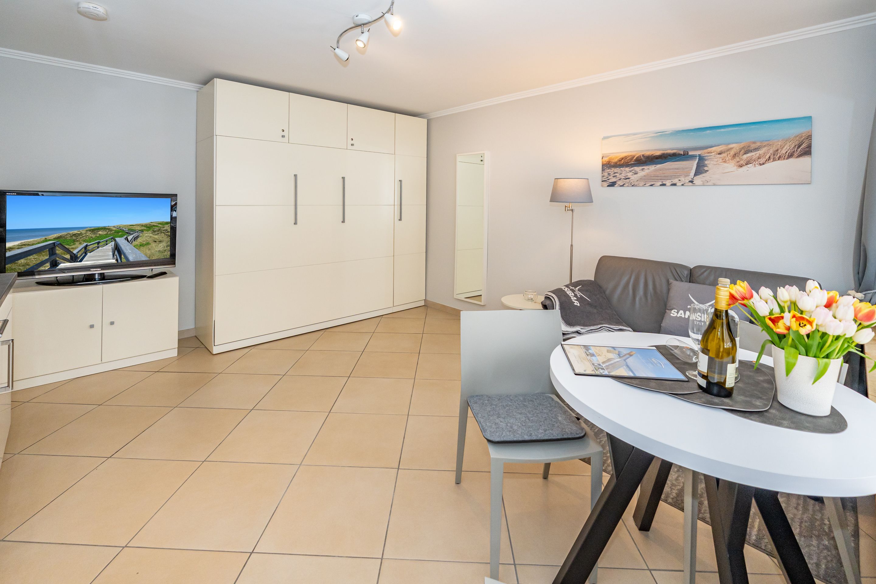 Das Appartement wurde umfassend renoviert und hochwertig eingerichtet. Im Wohnbereich erwarten Sie eine elegante Ledercouch, ein gemütlicher Essplatz sowie ein komfortables Doppelschrankbett (1,60 m breit) mit zwei separaten Matratzen. Ein großer Flachbild-TV (40 Zoll, Kabel), CD/Radio, DVD-Player und kostenfreies WLAN sorgen für angenehme Unterhaltung.