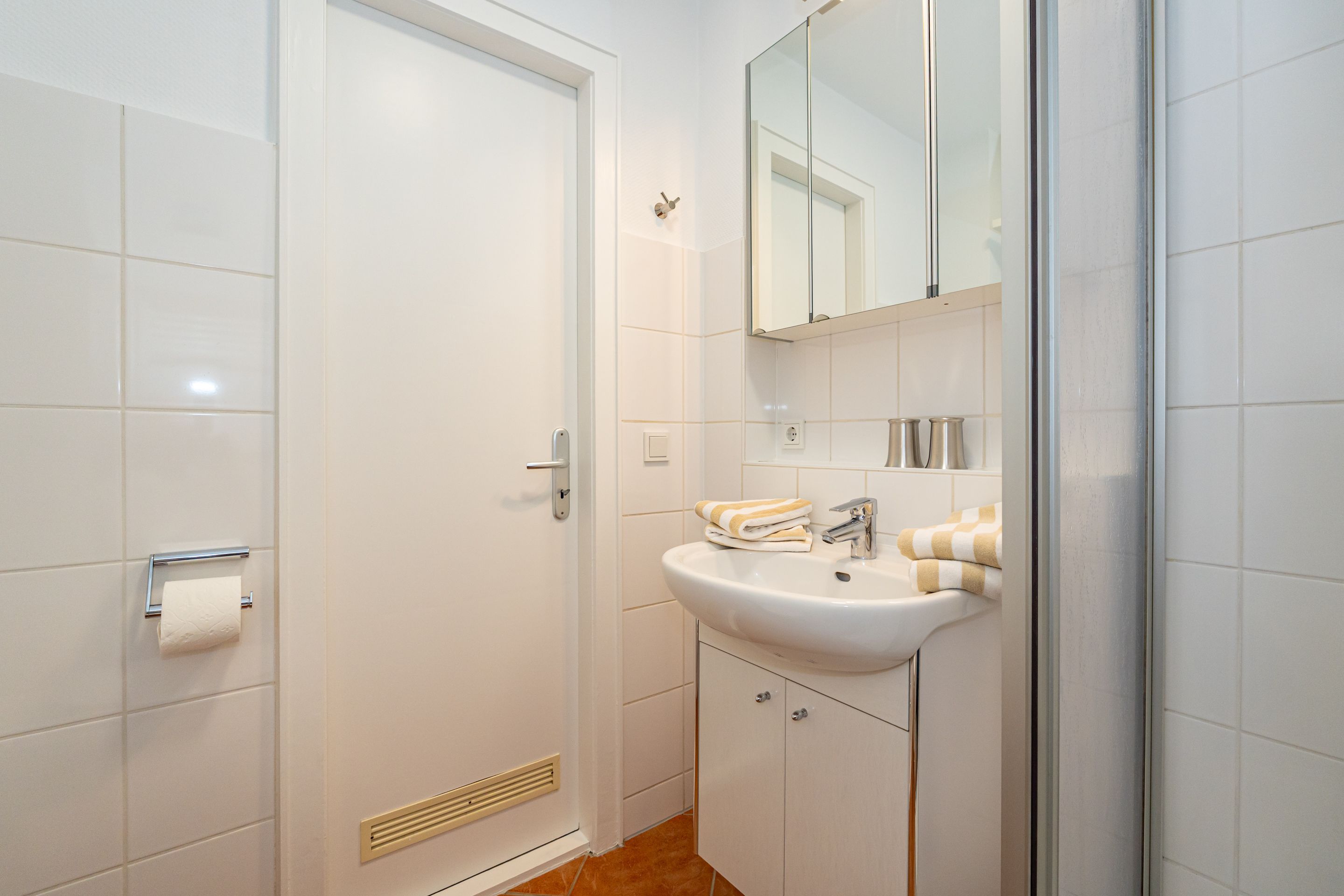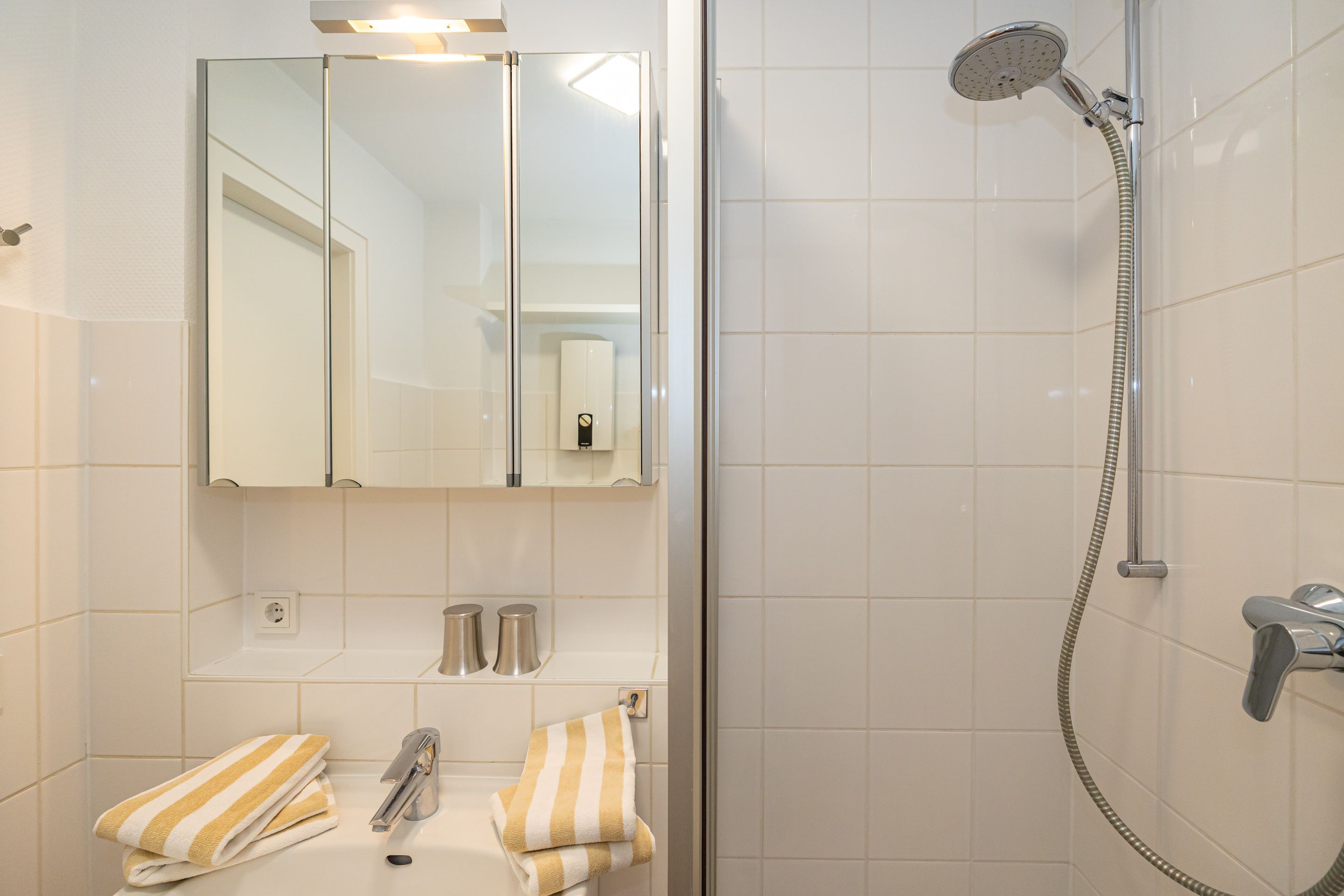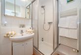 Das hell gestaltete Badezimmer ist funktional und bietet eine geräumige Dusche, ein WC sowie einen Waschtisch mit ausreichend Ablagefläche.
